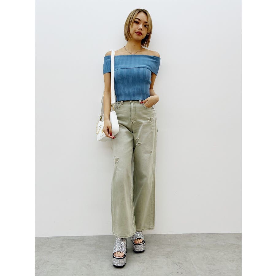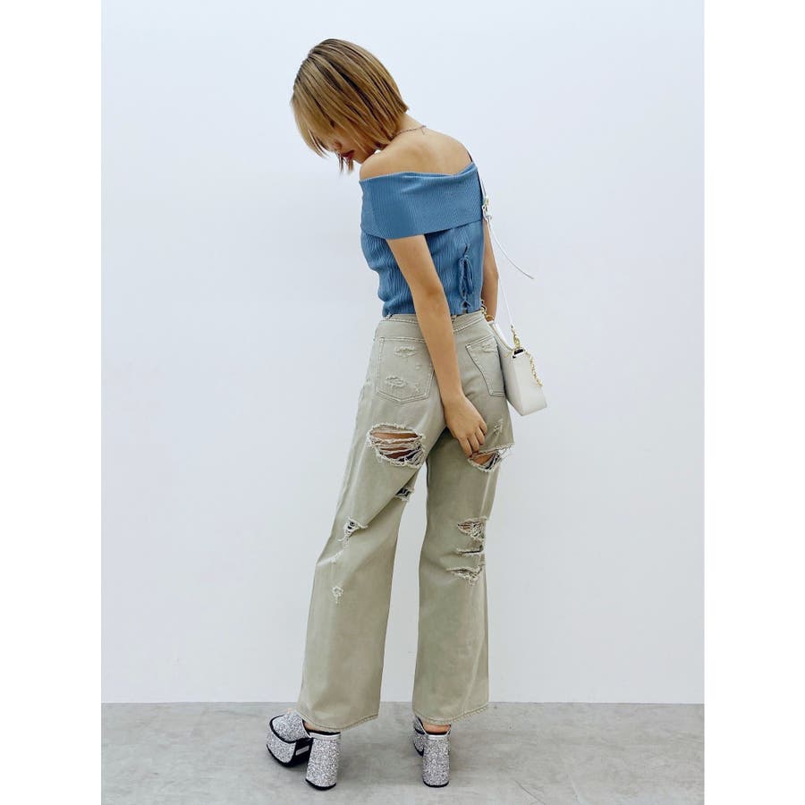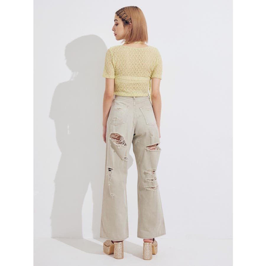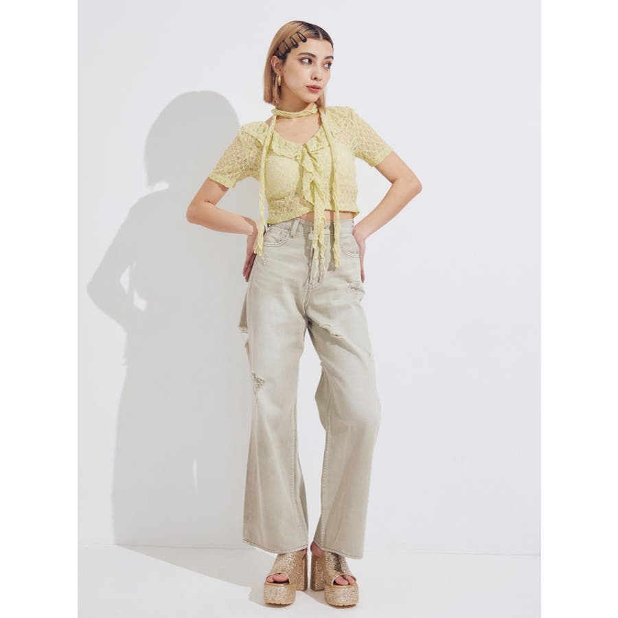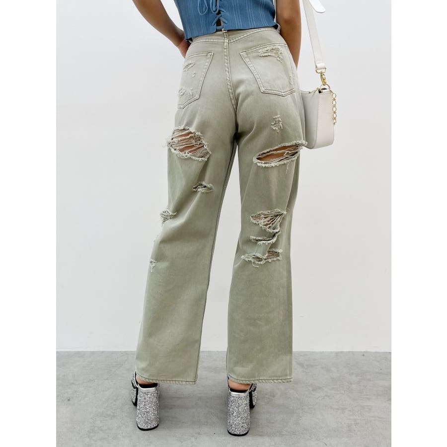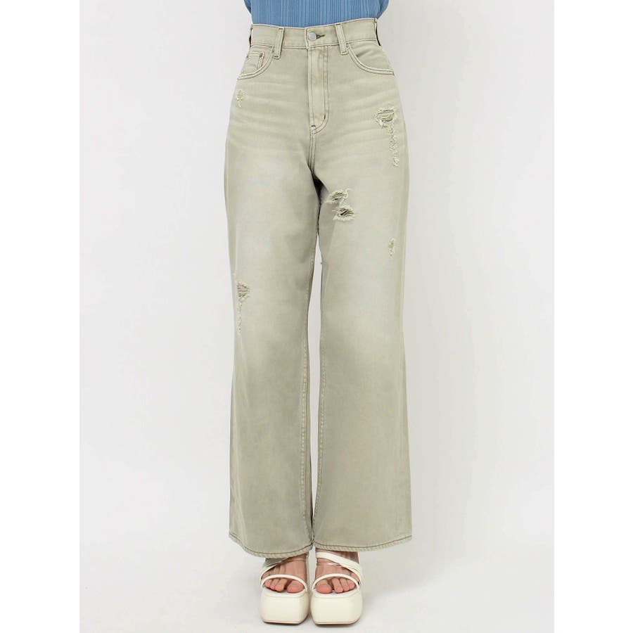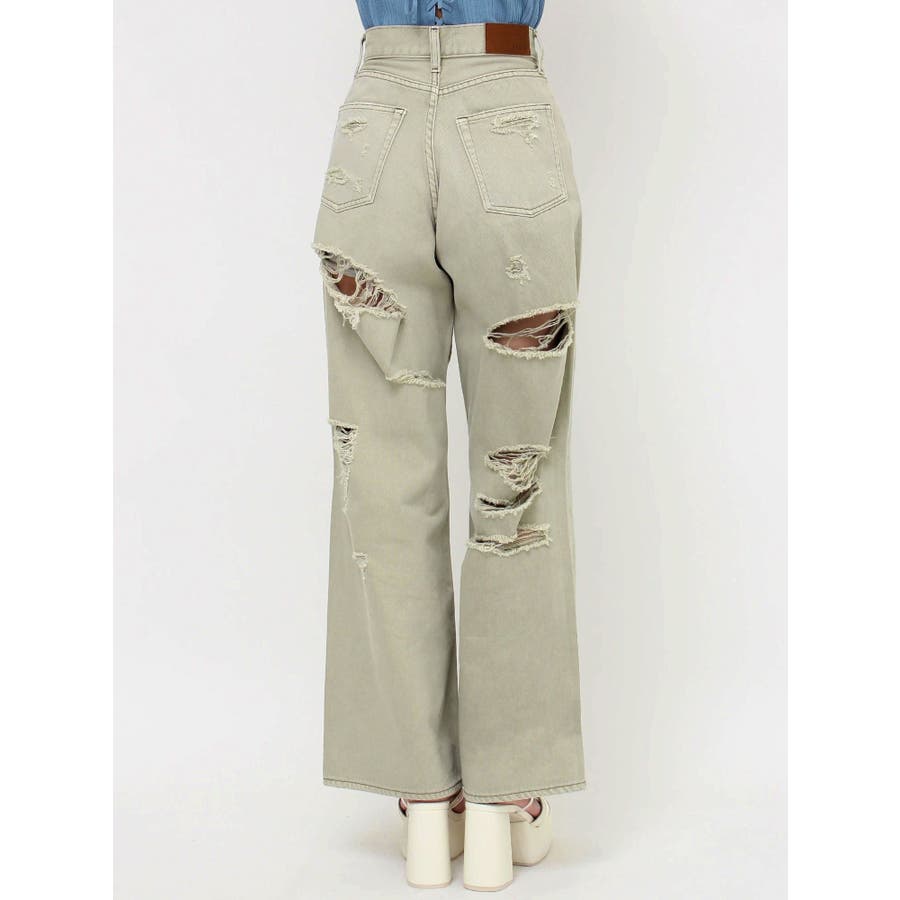 ■デザイン後ろにランダムなダメージが沢山入ったワイドデニムパンツです。カラー展開でEVRIS(エヴリス)では今までなかった薄めのグリーンの加工を取り入れており、新鮮なカラー展開がポイントです。フロントのダメージは小さくシンプルなので、幅広いコーディネートに合わせやすいアイテムです。■スタイリングゆったりとしたサイズ感なので、コンパクトなトップス合わせでメリハリのあるスタイリングがオススメです。-------------- 透け感:なし 裏地:なし 生地の厚み:普通伸縮性:なし --------------