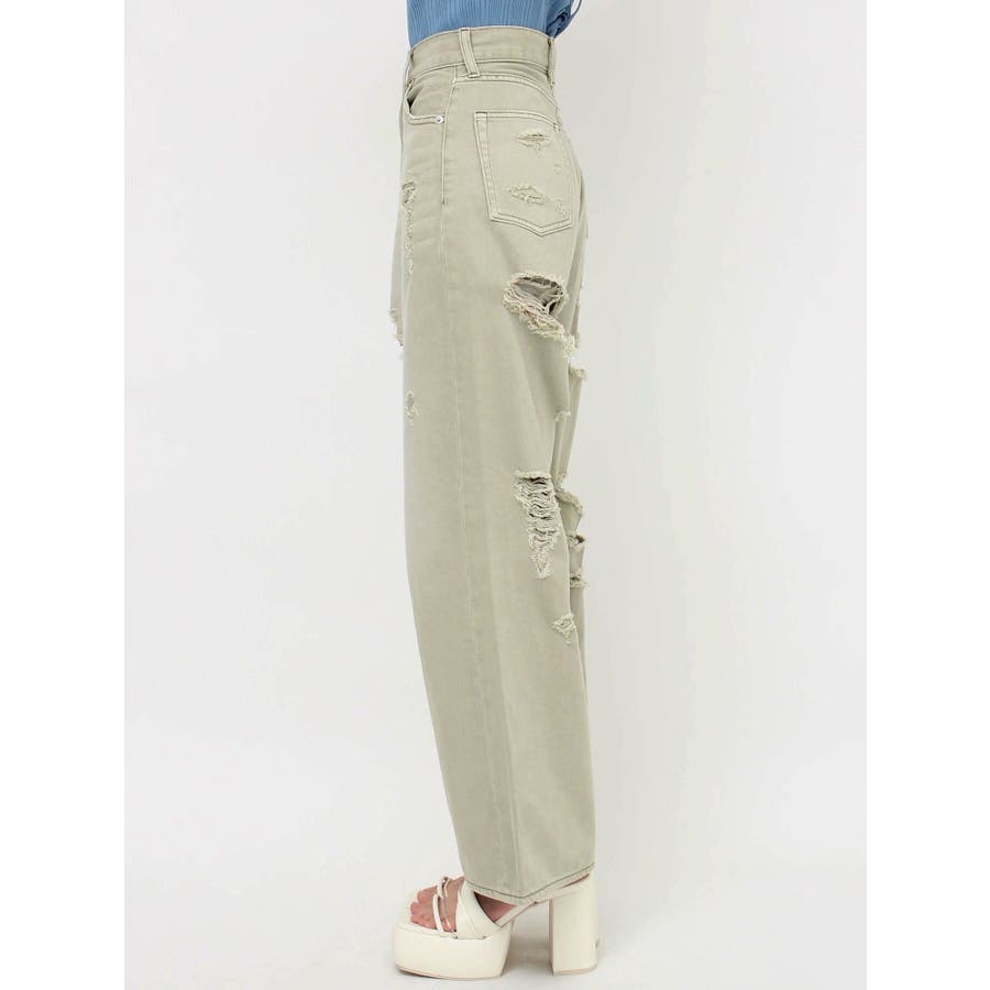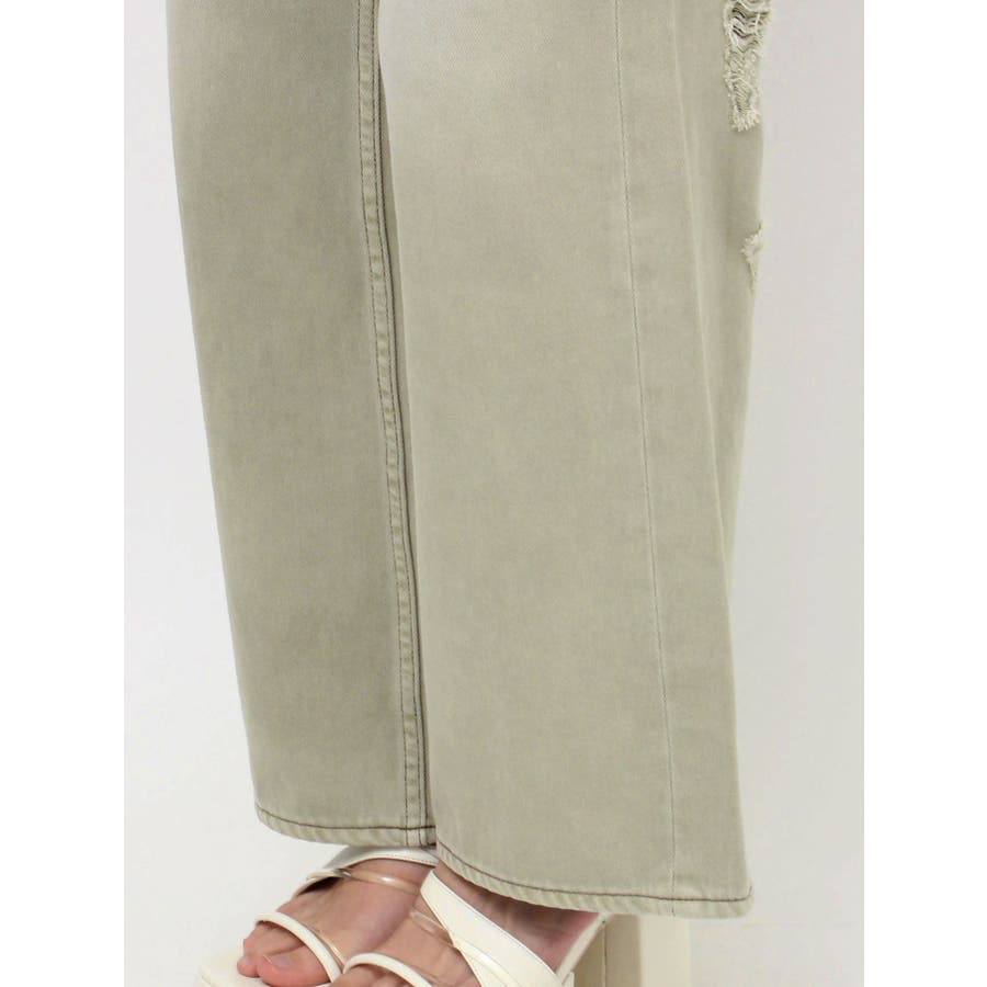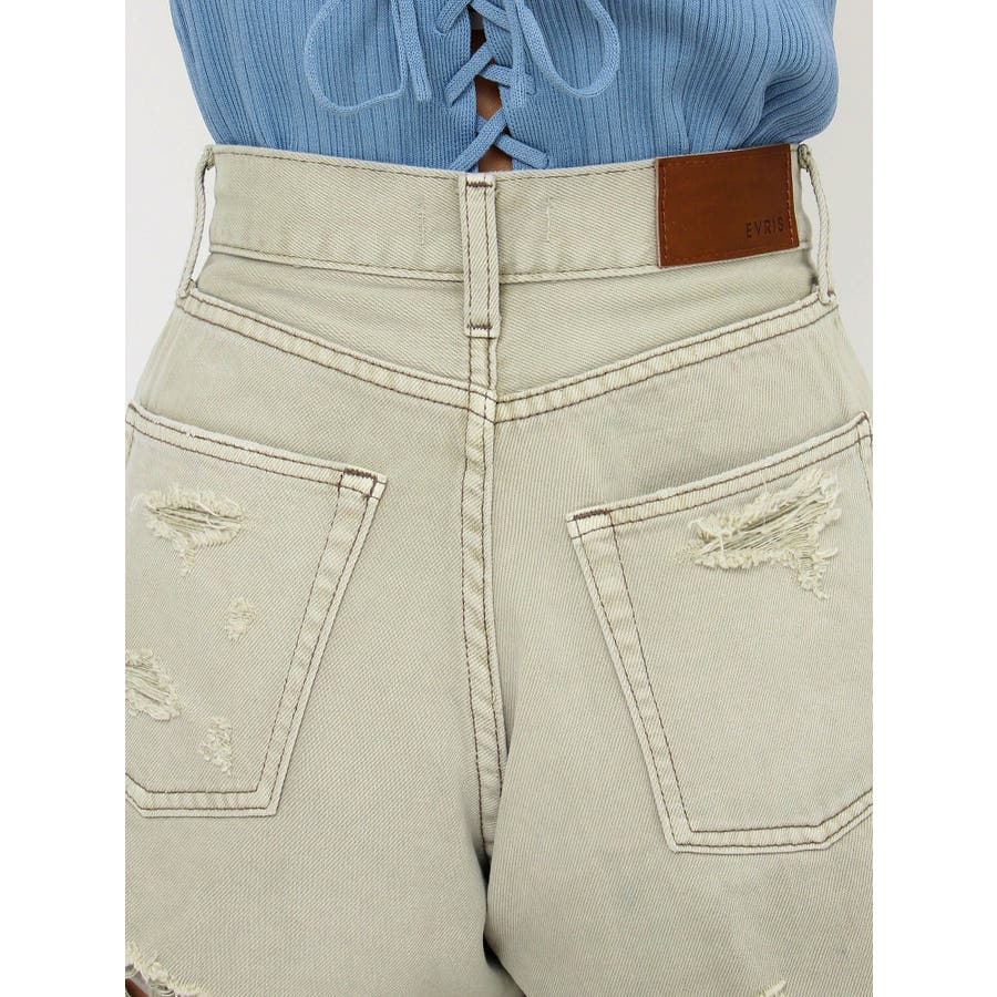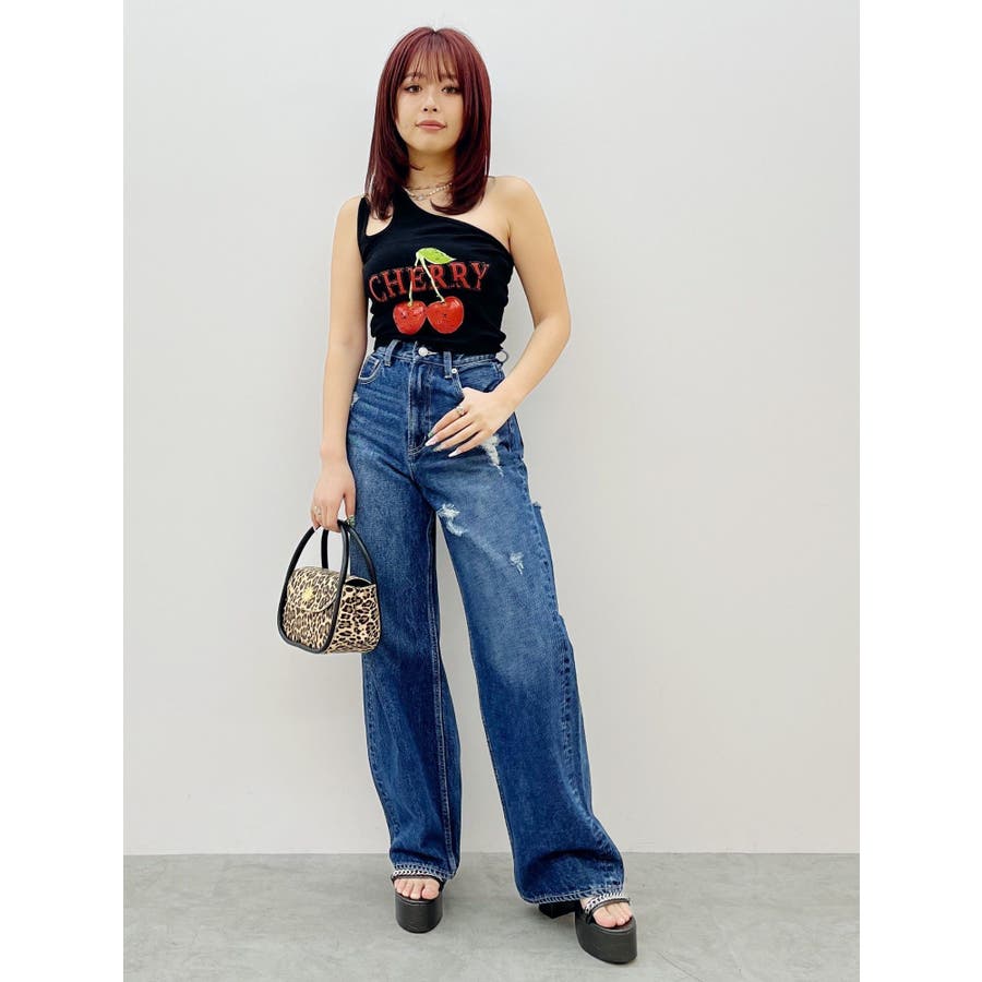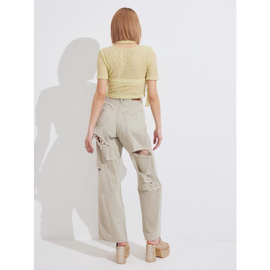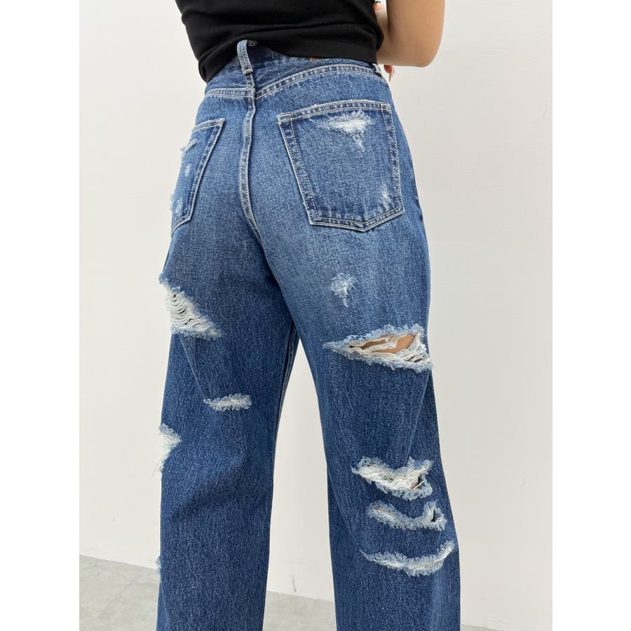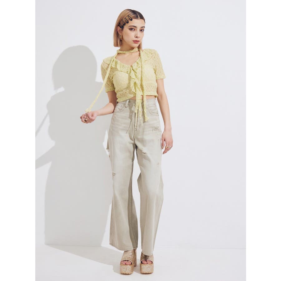 ■デザイン後ろにランダムなダメージが沢山入ったワイドデニムパンツです。カラー展開でEVRIS(エヴリス)では今までなかった薄めのグリーンの加工を取り入れており、新鮮なカラー展開がポイントです。フロントのダメージは小さくシンプルなので、幅広いコーディネートに合わせやすいアイテムです。■スタイリングゆったりとしたサイズ感なので、コンパクトなトップス合わせでメリハリのあるスタイリングがオススメです。-------------- 透け感:なし 裏地:なし 生地の厚み:普通伸縮性:なし --------------