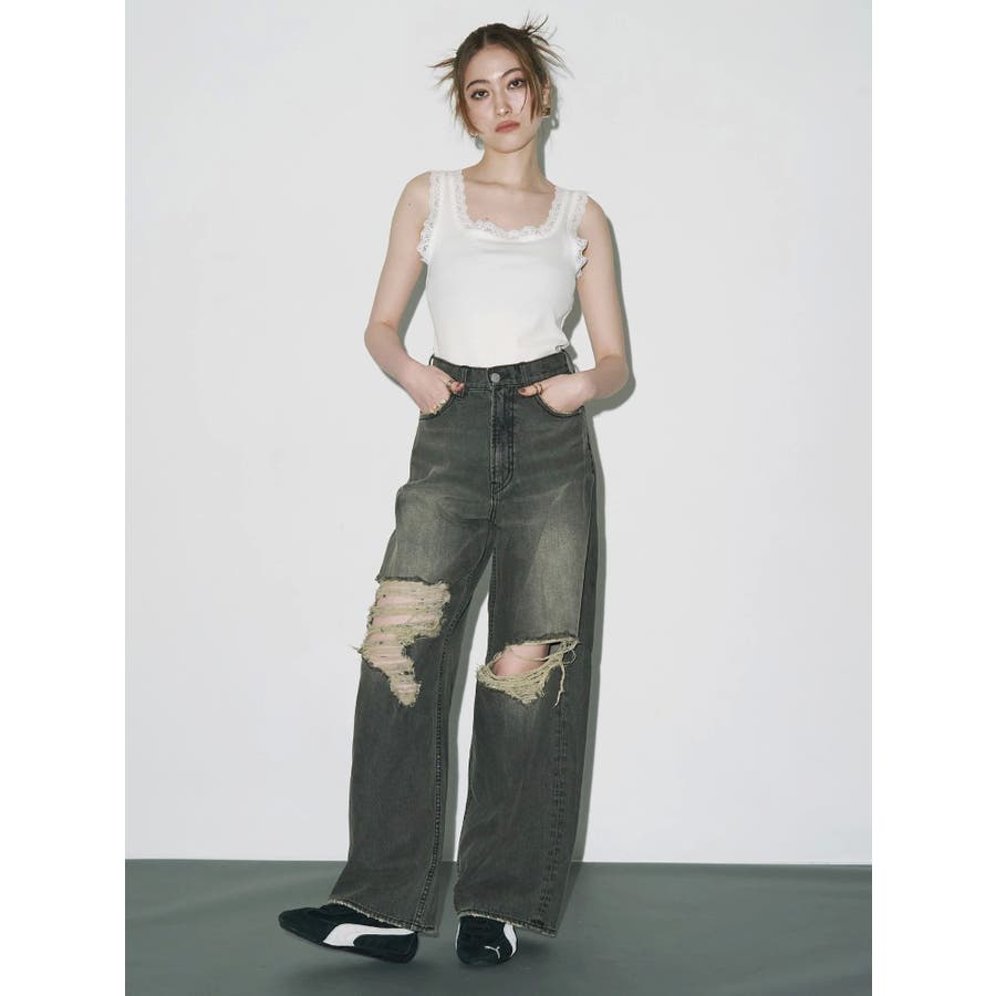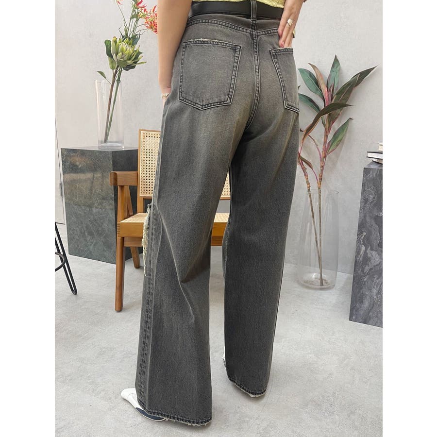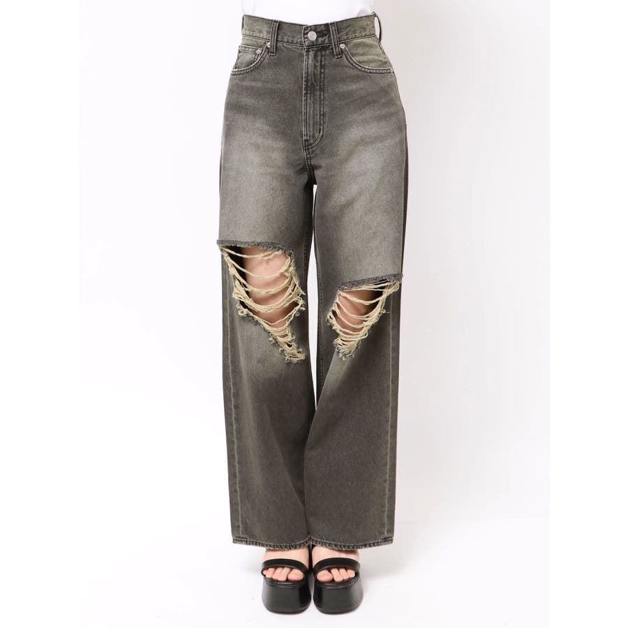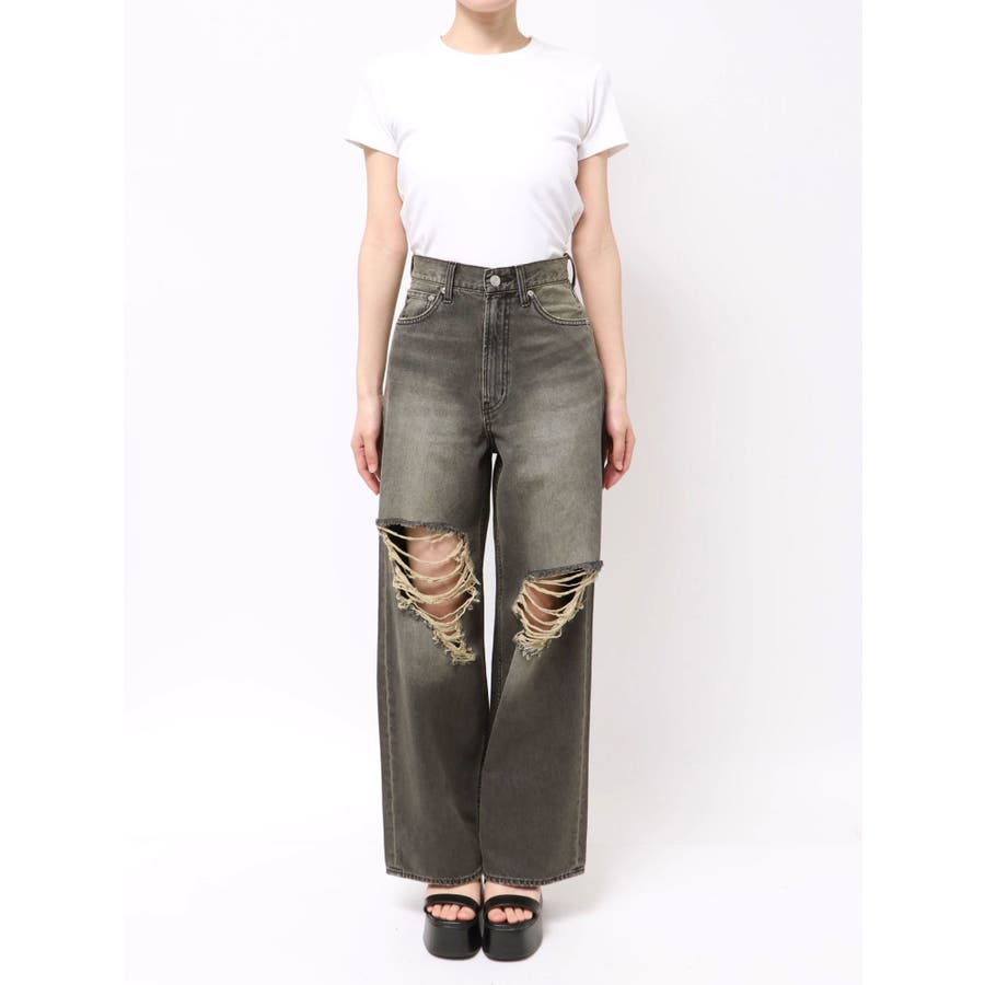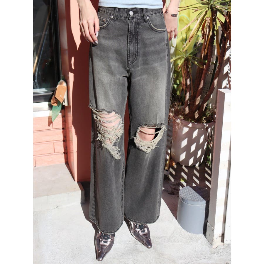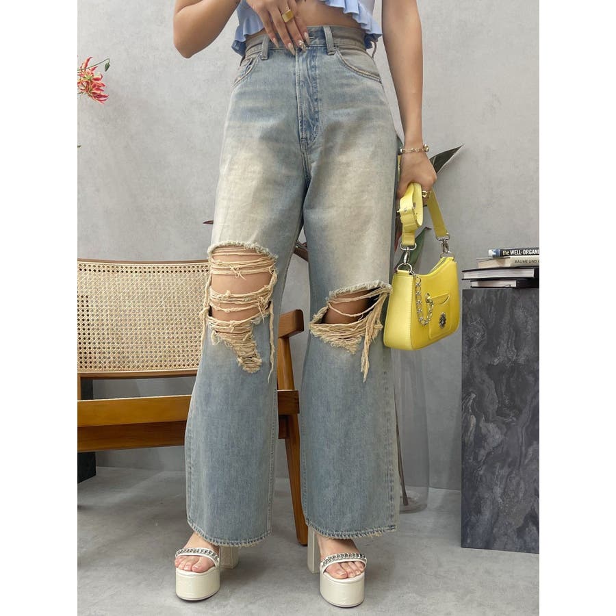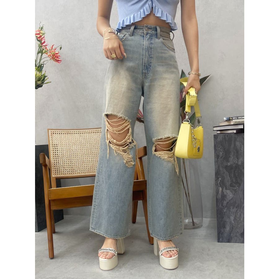 ■デザイン色褪せたカラー展開と、ゆったりとしたサイズ感がポイントのワイドデニムパンツです。トレンドのダボっとしたシルエットを再現するため、太もも部分を通常より大きめなサイジングにしています。フロントに入った大きなダメージもインパクト抜群。一枚でトレンド感のあるスタイルが完成する優秀アイテム。■スタイリングゆるっとシルエットのボトムにはチビTやキャミソール合わせがテッパン。オーバーサイズのTシャツと合わせた、ストリート要素のあるコーデもおすすめ。-------------- 透け感:なし 裏地:なし 生地の厚み:普通伸縮性:なし --------------