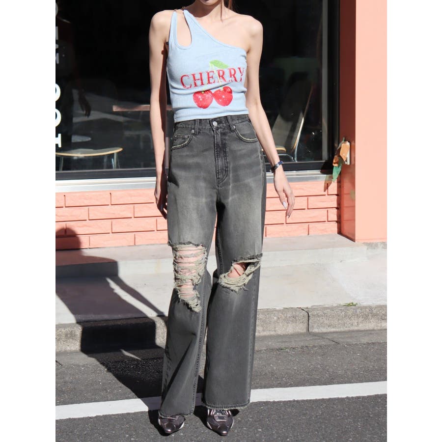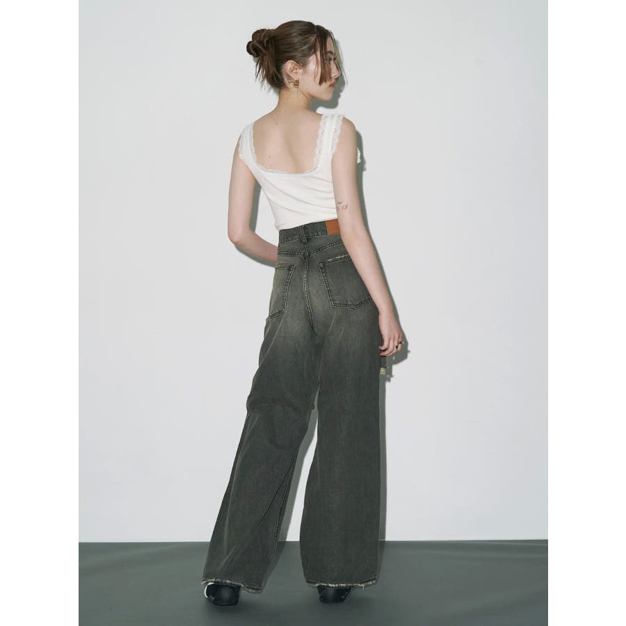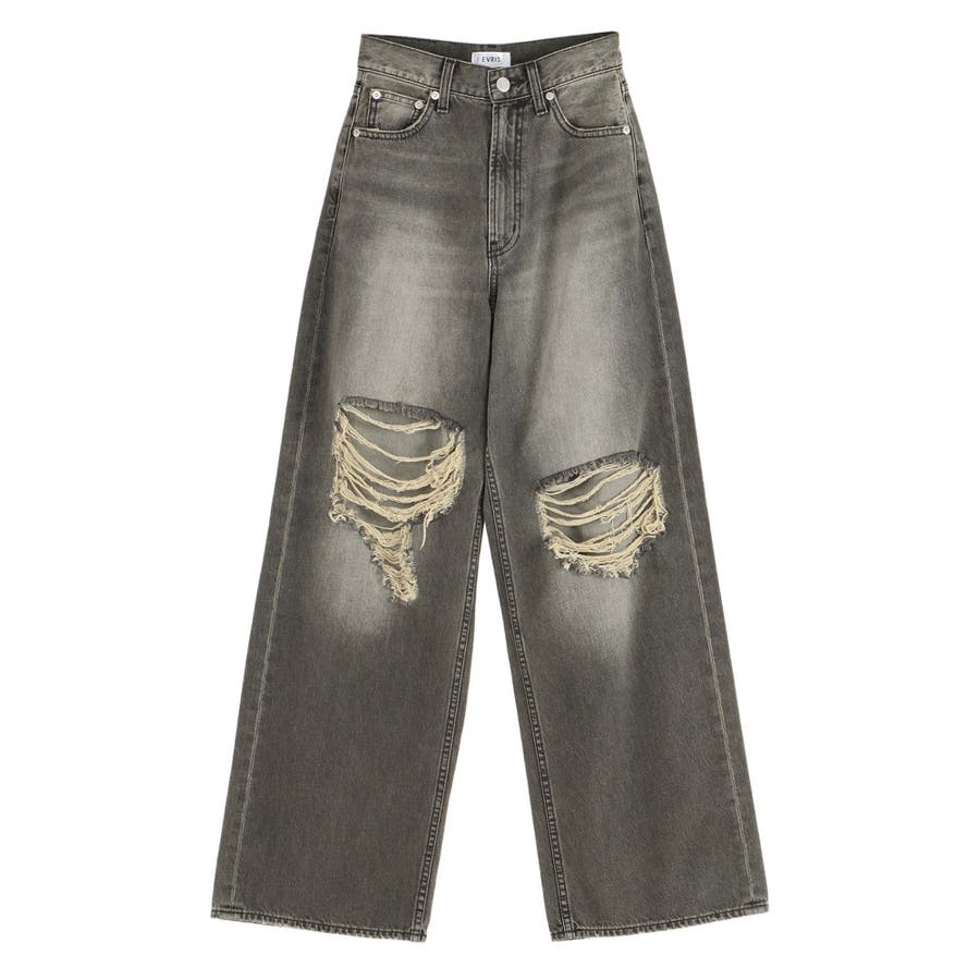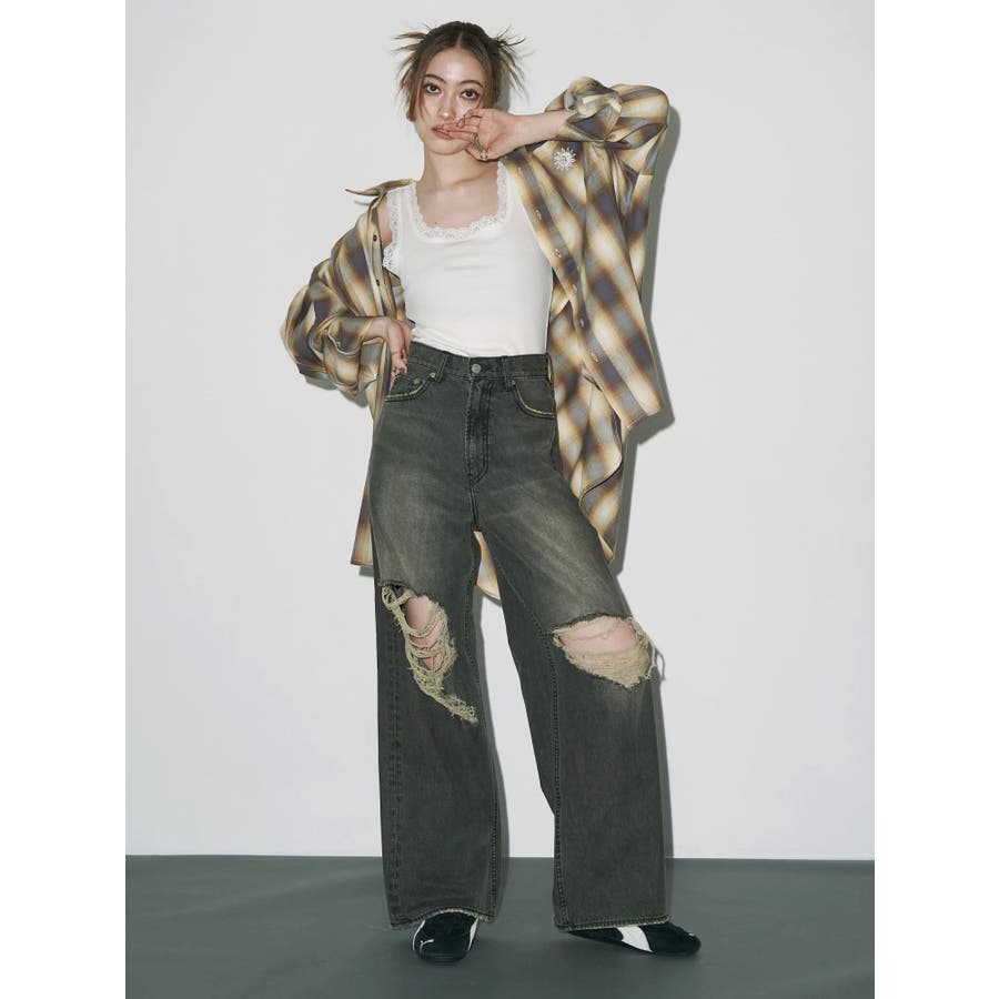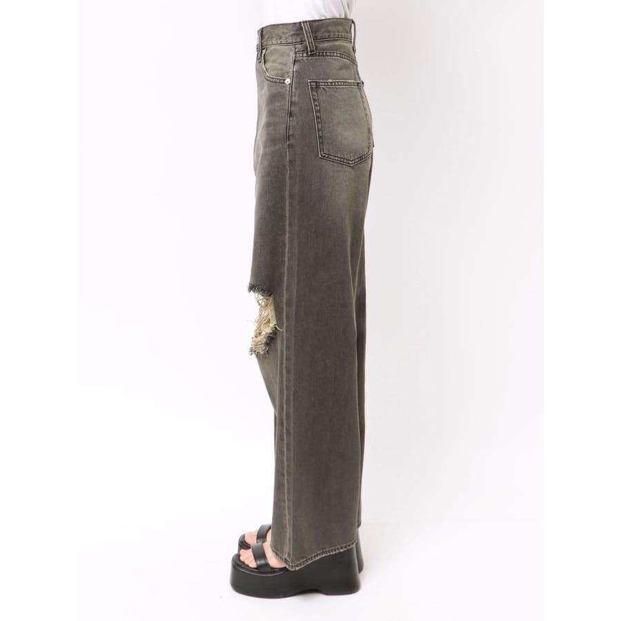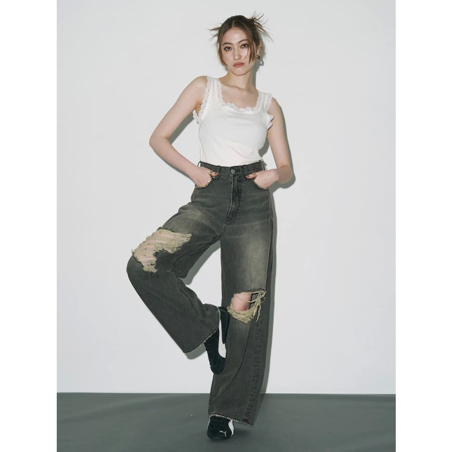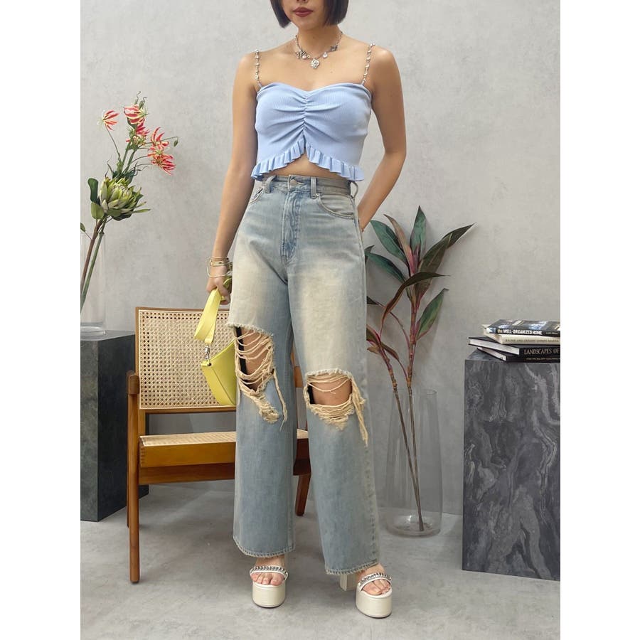 ■デザイン色褪せたカラー展開と、ゆったりとしたサイズ感がポイントのワイドデニムパンツです。トレンドのダボっとしたシルエットを再現するため、太もも部分を通常より大きめなサイジングにしています。フロントに入った大きなダメージもインパクト抜群。一枚でトレンド感のあるスタイルが完成する優秀アイテム。■スタイリングゆるっとシルエットのボトムにはチビTやキャミソール合わせがテッパン。オーバーサイズのTシャツと合わせた、ストリート要素のあるコーデもおすすめ。-------------- 透け感:なし 裏地:なし 生地の厚み:普通伸縮性:なし --------------