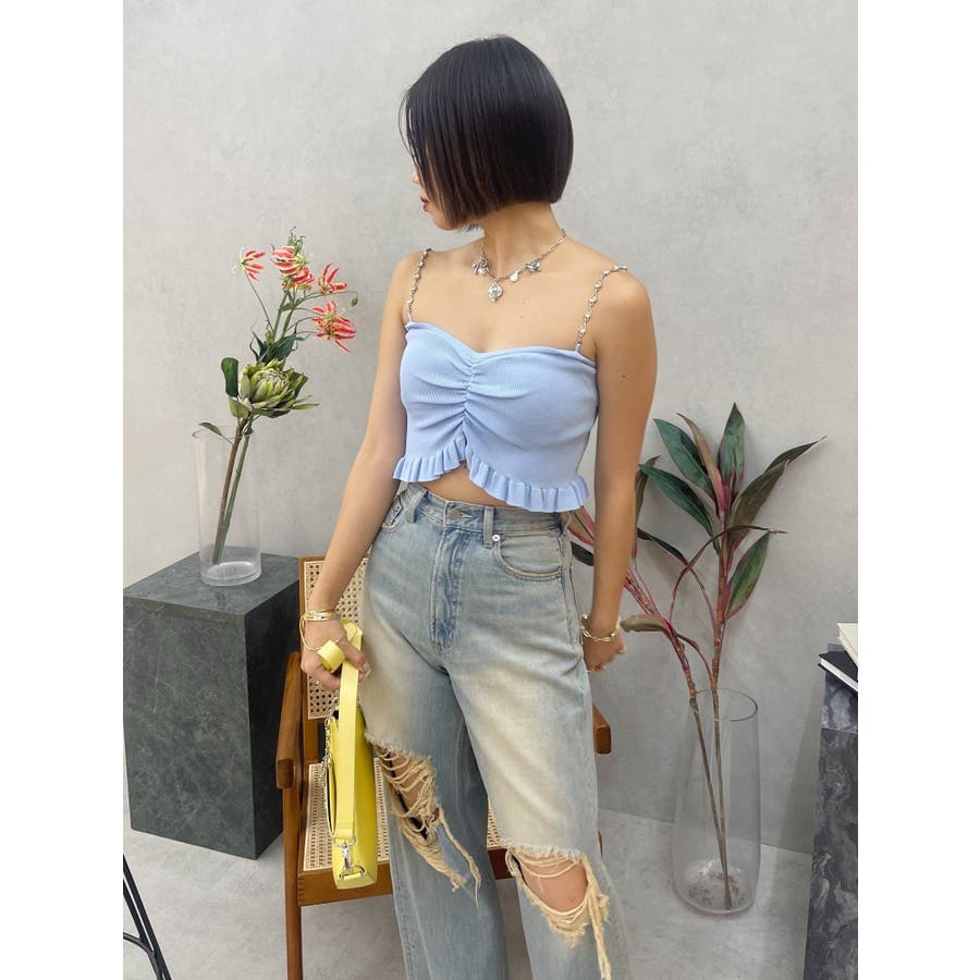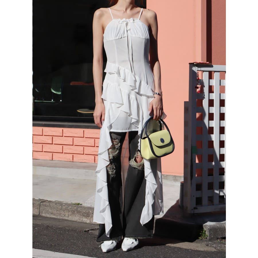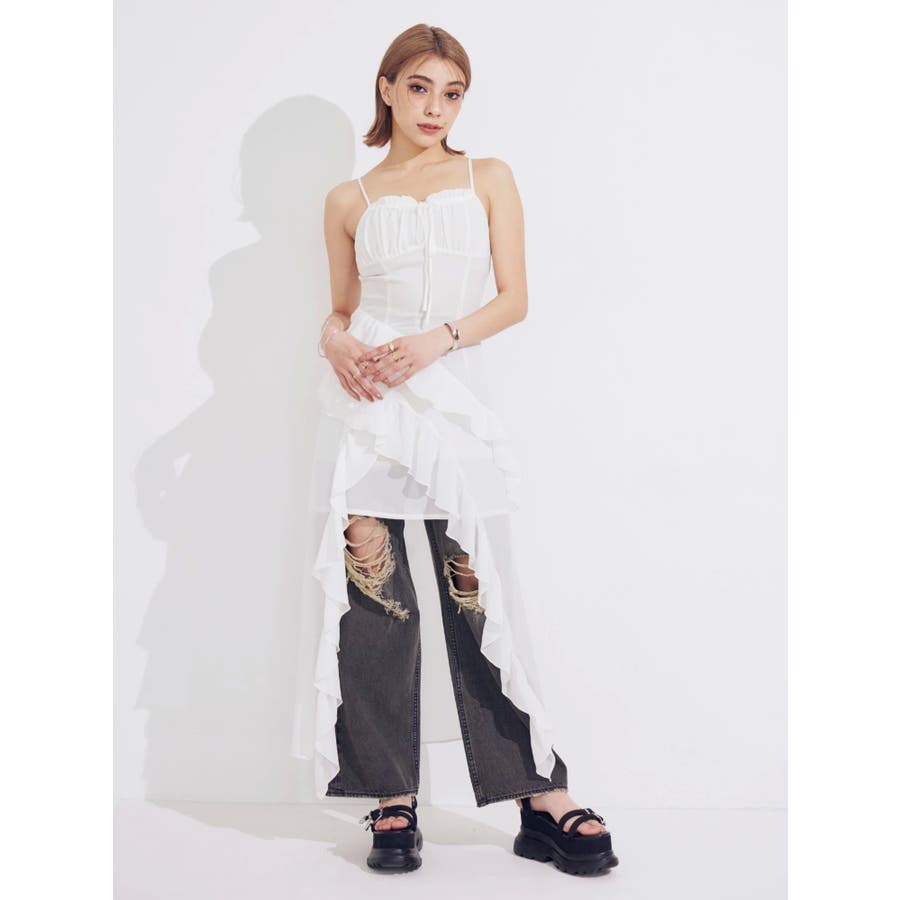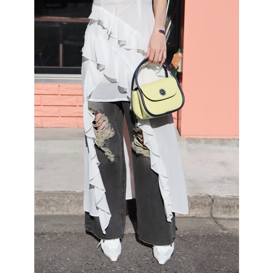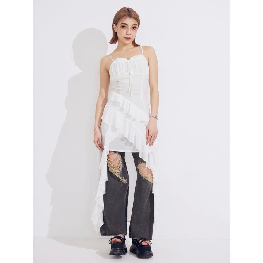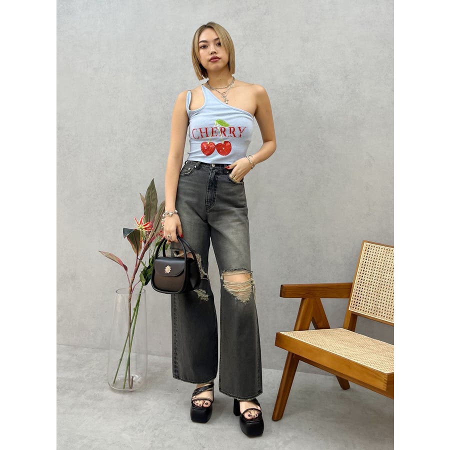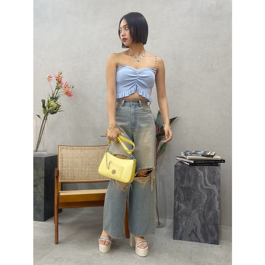 ■デザイン色褪せたカラー展開と、ゆったりとしたサイズ感がポイントのワイドデニムパンツです。トレンドのダボっとしたシルエットを再現するため、太もも部分を通常より大きめなサイジングにしています。フロントに入った大きなダメージもインパクト抜群。一枚でトレンド感のあるスタイルが完成する優秀アイテム。■スタイリングゆるっとシルエットのボトムにはチビTやキャミソール合わせがテッパン。オーバーサイズのTシャツと合わせた、ストリート要素のあるコーデもおすすめ。-------------- 透け感:なし 裏地:なし 生地の厚み:普通伸縮性:なし --------------
