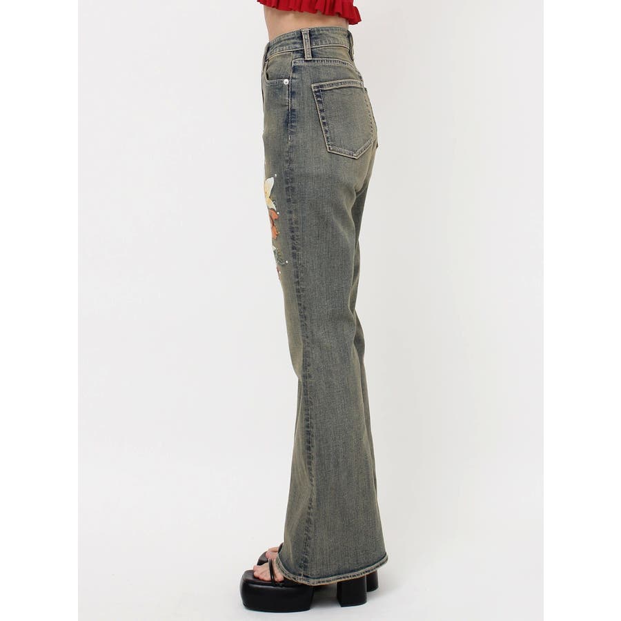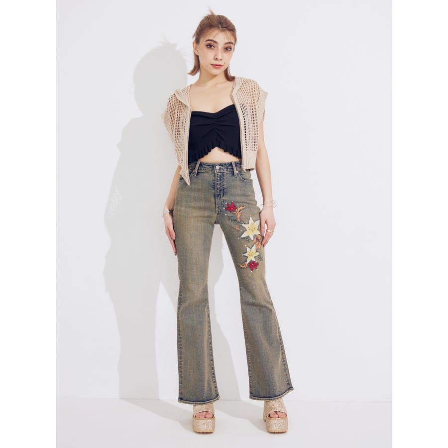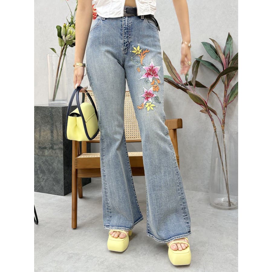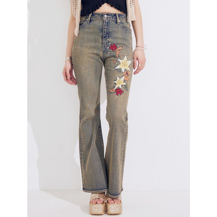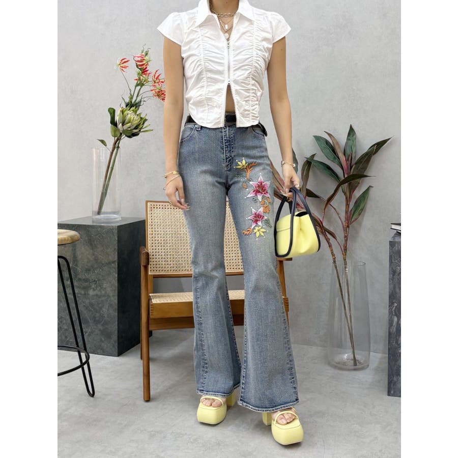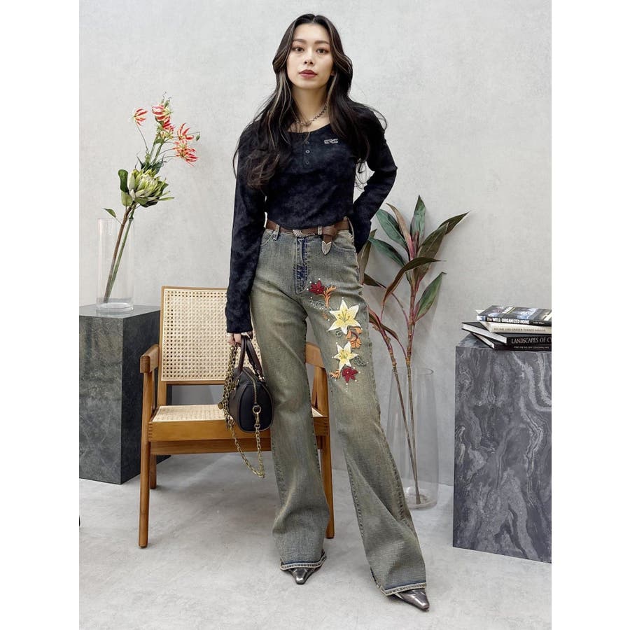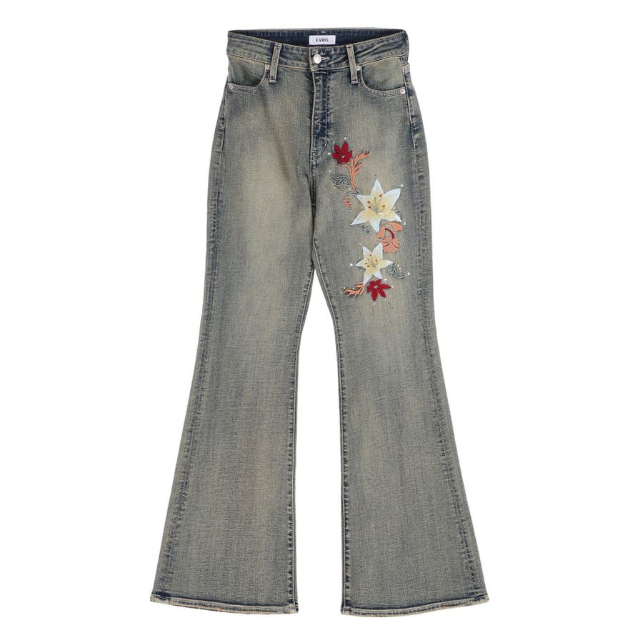 ■デザインシーズンコンセプトのWILD FLOWERを体現したオリジナルフラワーの刺繍をあしらったデニムパンツです。今季トレンドシルエットのフレアパンツに、2000年代を思い出させるようなUSED感のある加工やラインストーンなど、懐かしさのなかにもEVRIS(エヴリス)らしさが詰まった一枚です。■スタイリング花のデザインを活かしたシンプルなトップス合わせがおすすめ。刺繍のカラーを拾った明るい色のトップスも相性◎-------------- 透け感:なし 裏地:なし 生地の厚み:普通--------------