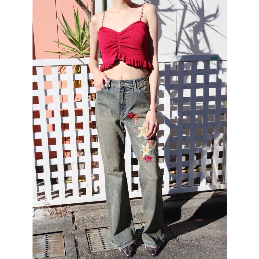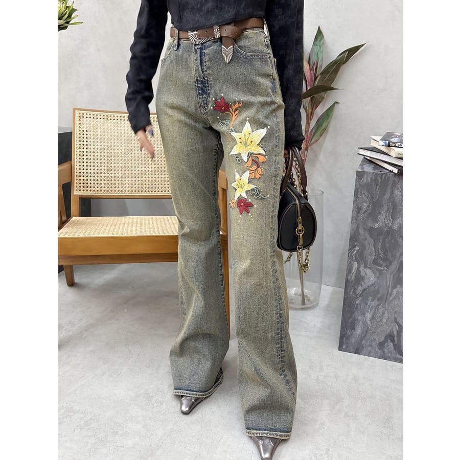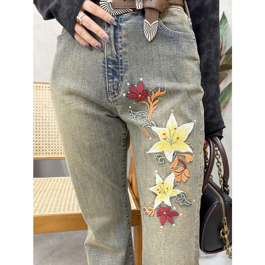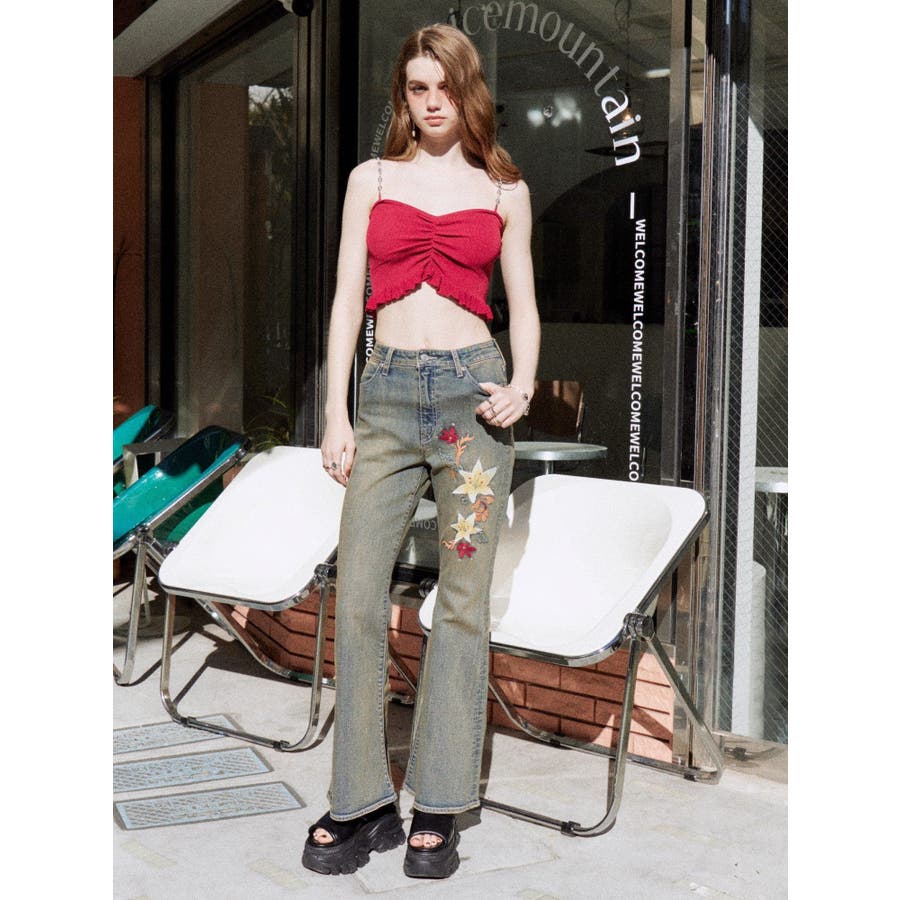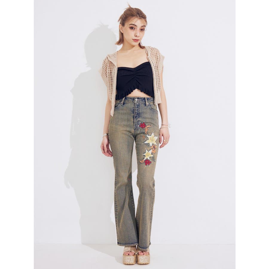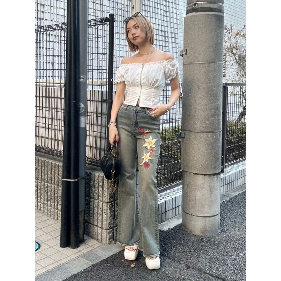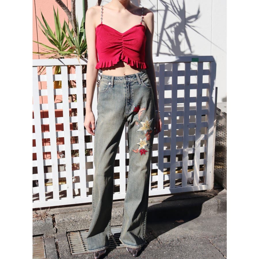 ■デザインシーズンコンセプトのWILD FLOWERを体現したオリジナルフラワーの刺繍をあしらったデニムパンツです。今季トレンドシルエットのフレアパンツに、2000年代を思い出させるようなUSED感のある加工やラインストーンなど、懐かしさのなかにもEVRIS(エヴリス)らしさが詰まった一枚です。■スタイリング花のデザインを活かしたシンプルなトップス合わせがおすすめ。刺繍のカラーを拾った明るい色のトップスも相性◎-------------- 透け感:なし 裏地:なし 生地の厚み:普通--------------