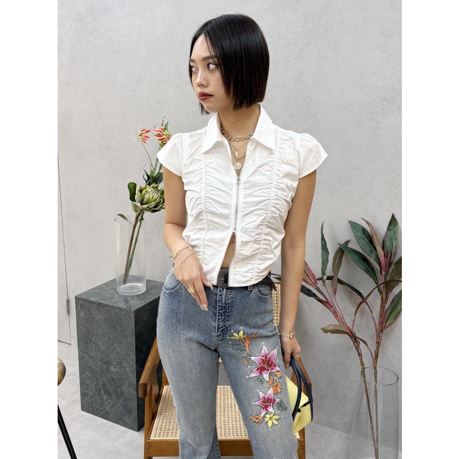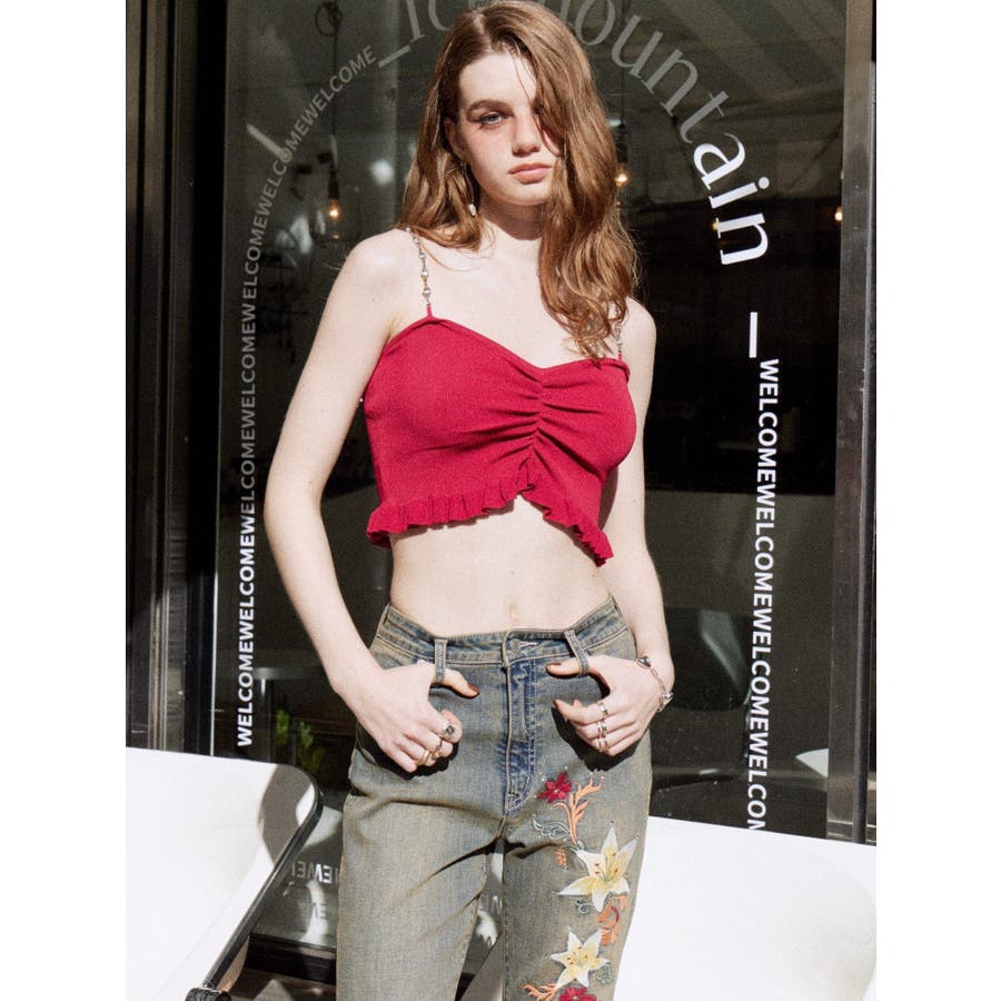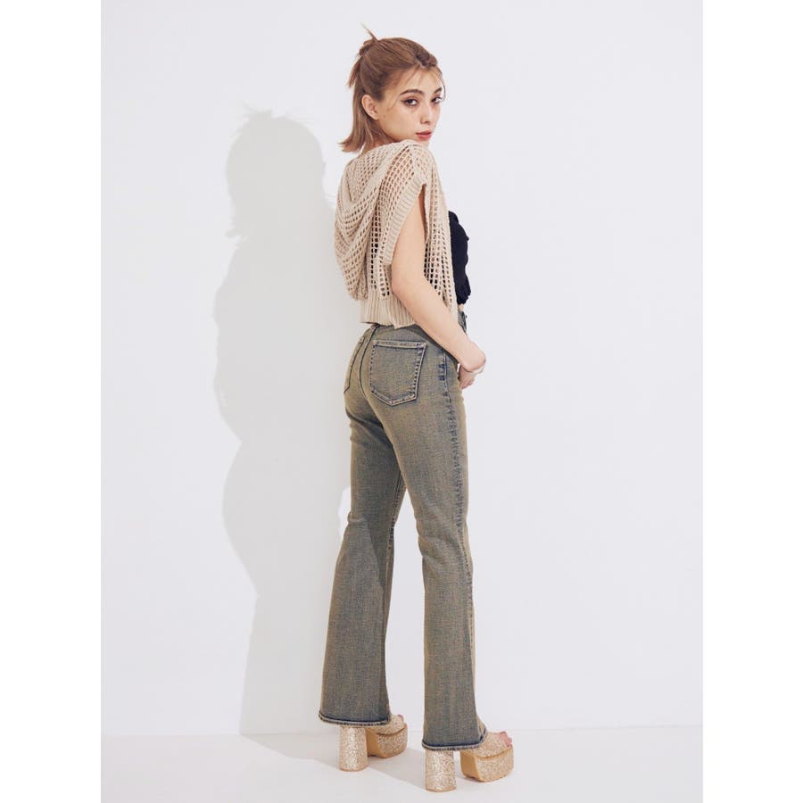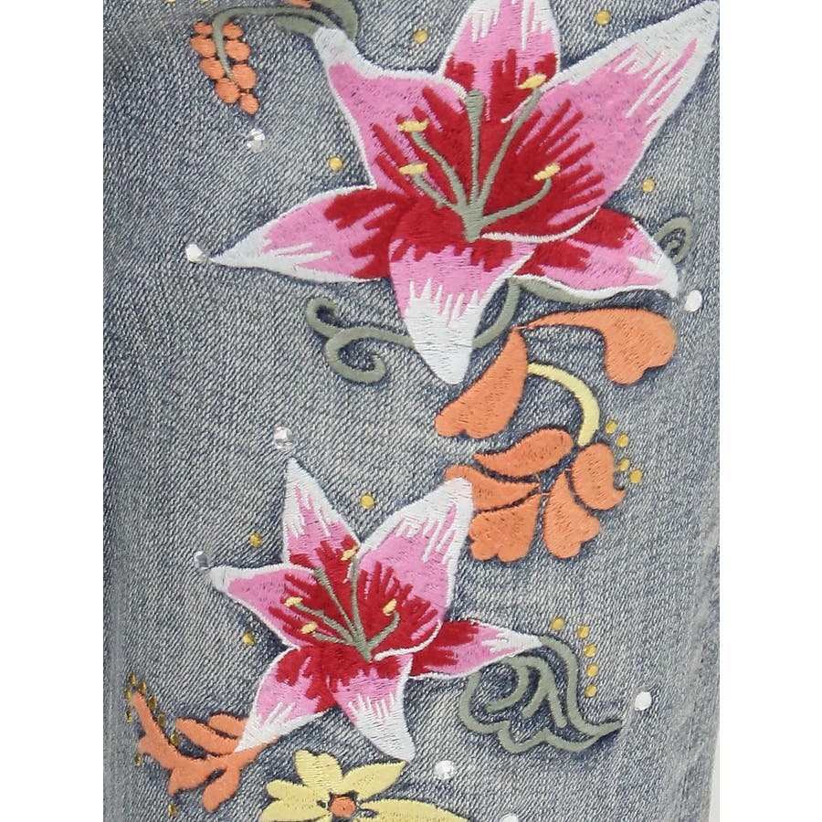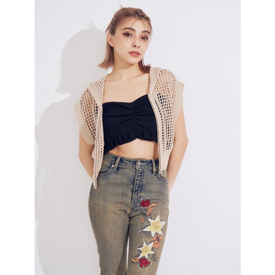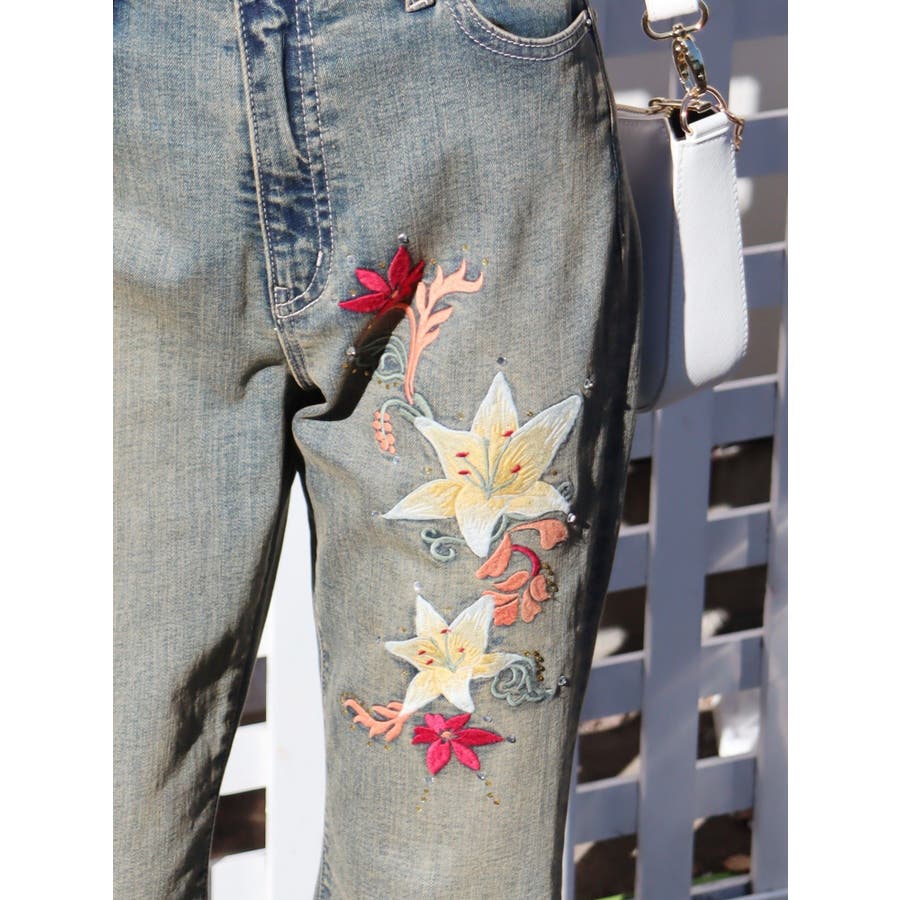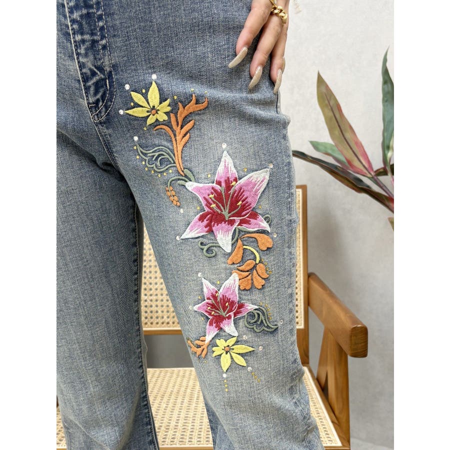 ■デザインシーズンコンセプトのWILD FLOWERを体現したオリジナルフラワーの刺繍をあしらったデニムパンツです。今季トレンドシルエットのフレアパンツに、2000年代を思い出させるようなUSED感のある加工やラインストーンなど、懐かしさのなかにもEVRIS(エヴリス)らしさが詰まった一枚です。■スタイリング花のデザインを活かしたシンプルなトップス合わせがおすすめ。刺繍のカラーを拾った明るい色のトップスも相性◎-------------- 透け感:なし 裏地:なし 生地の厚み:普通--------------