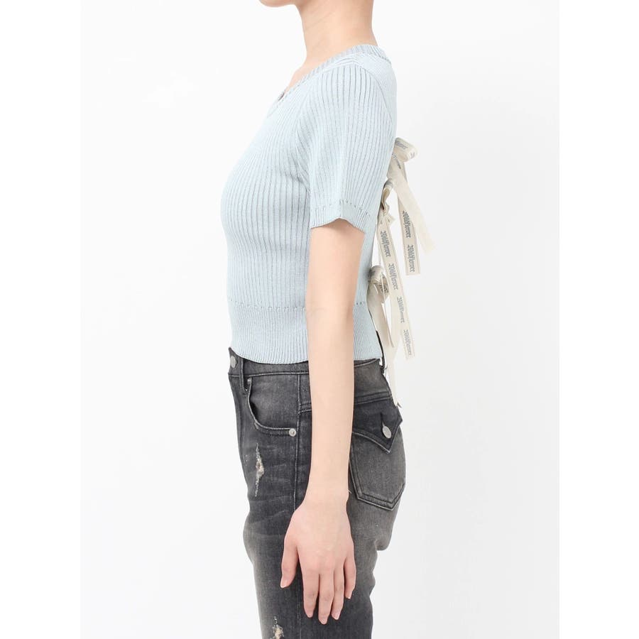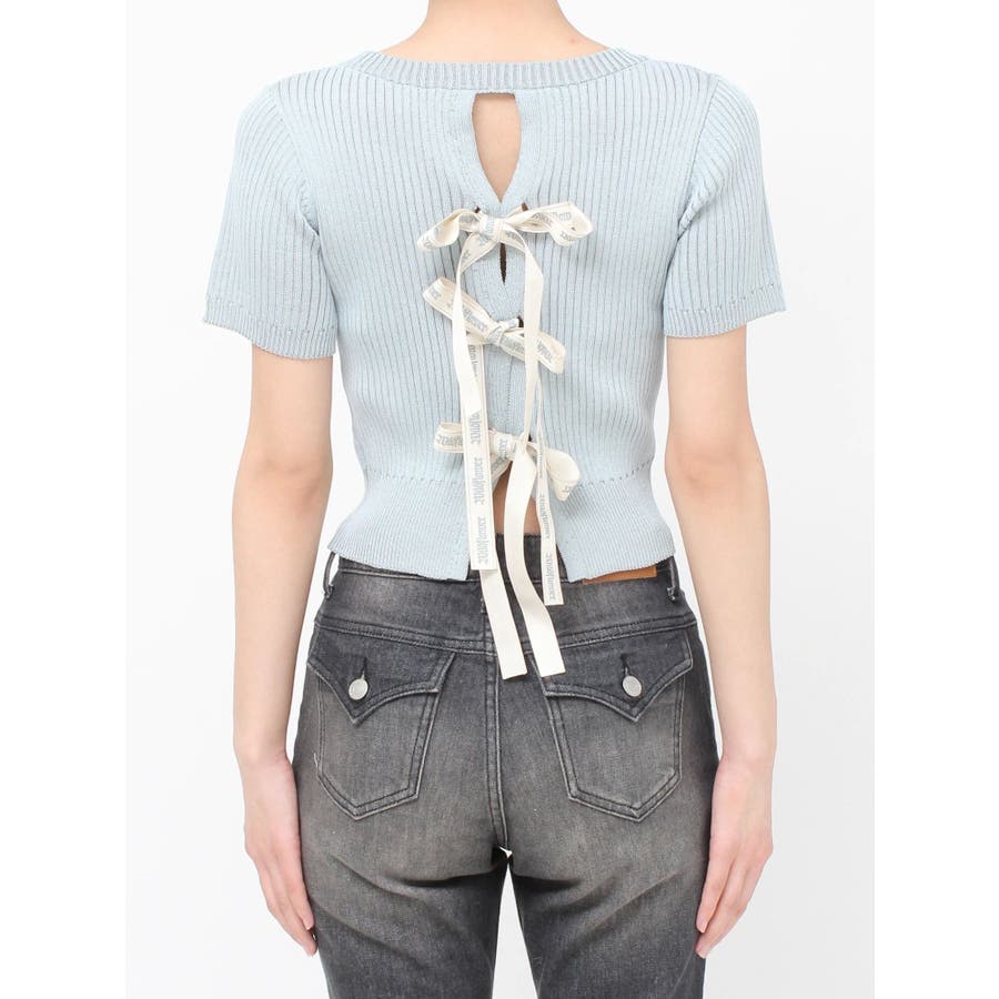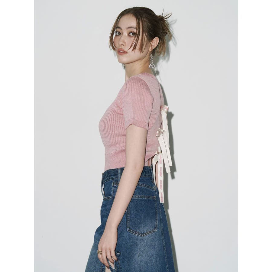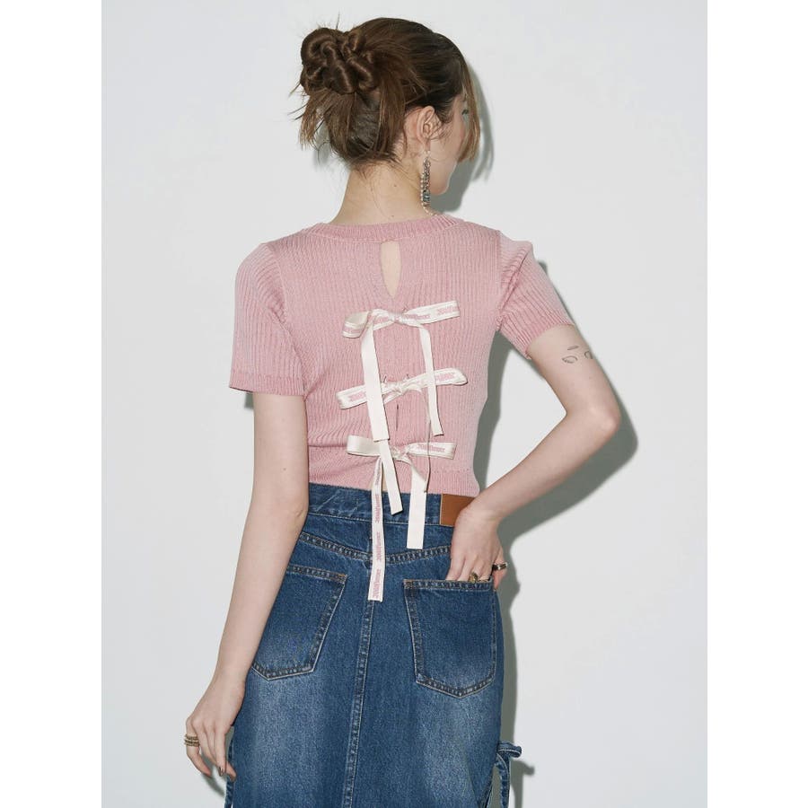 ハーフスリーブバックオープンリボンニットトップス