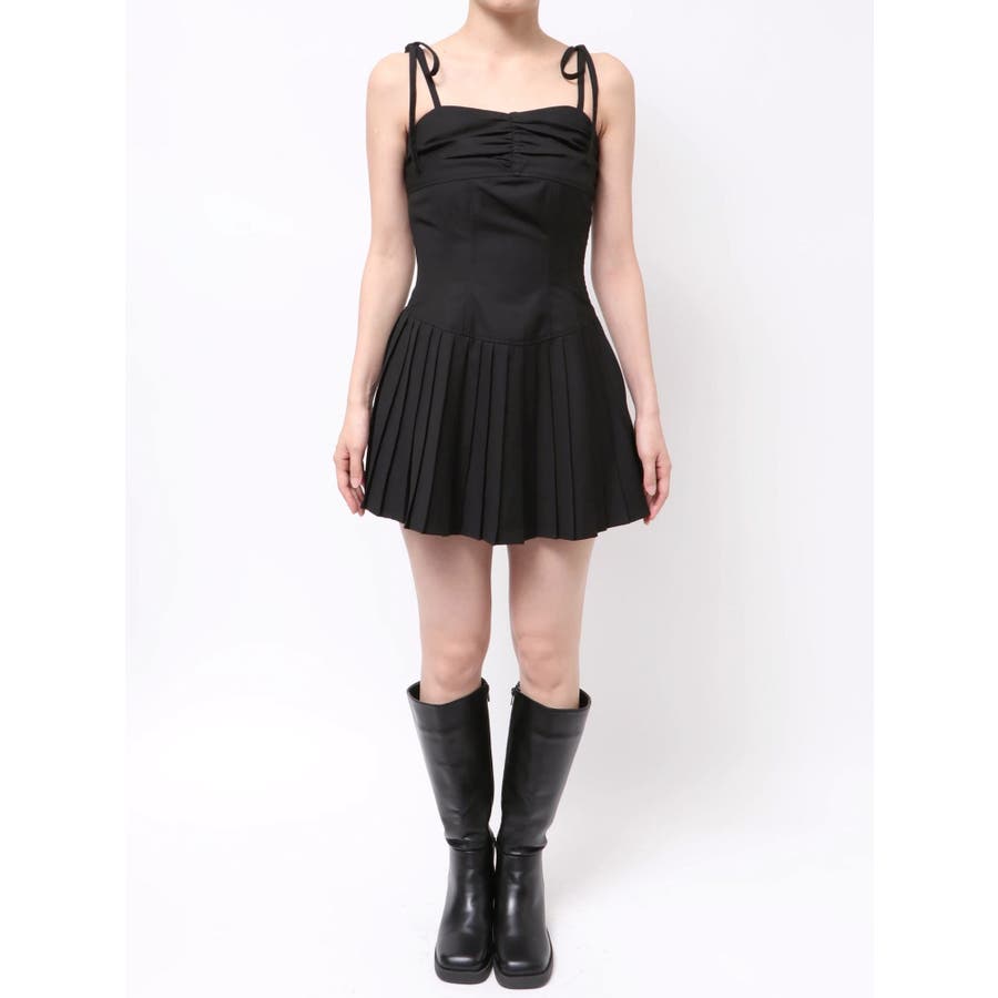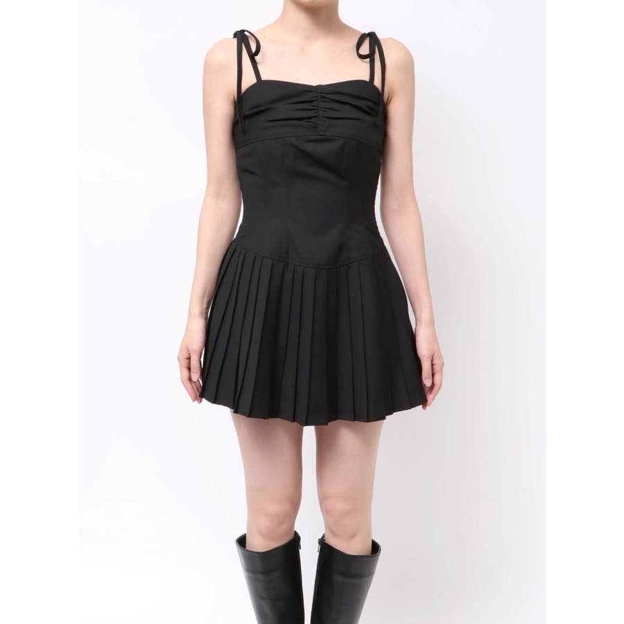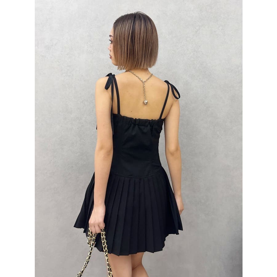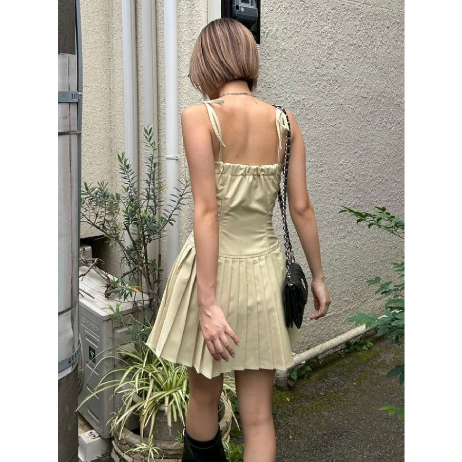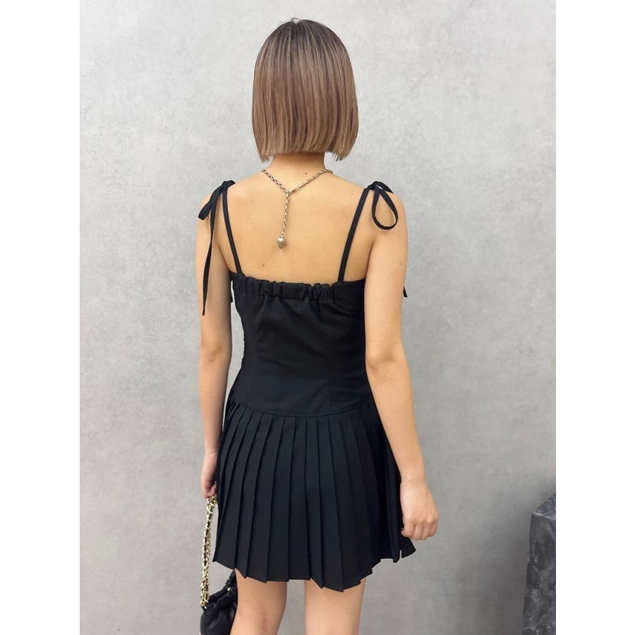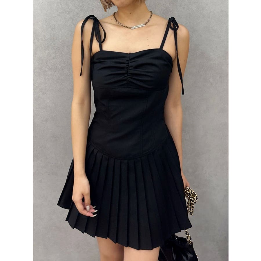 肩紐のリボンディテールがポイントのミニワンピースです。バストから腰回りまでピタっとしたサイズ感でスカート部分はプリーツ仕様でふわっと広がりのあるシルエットなのでメリハリのあるスタイルアップ効果のあるワンピースです。インナーにTシャツなど合わせるスタイリングもオススメです。-------------- 透け感:なし生地の厚み:普通伸縮性:なし 肩ひも部分:調整可--------------