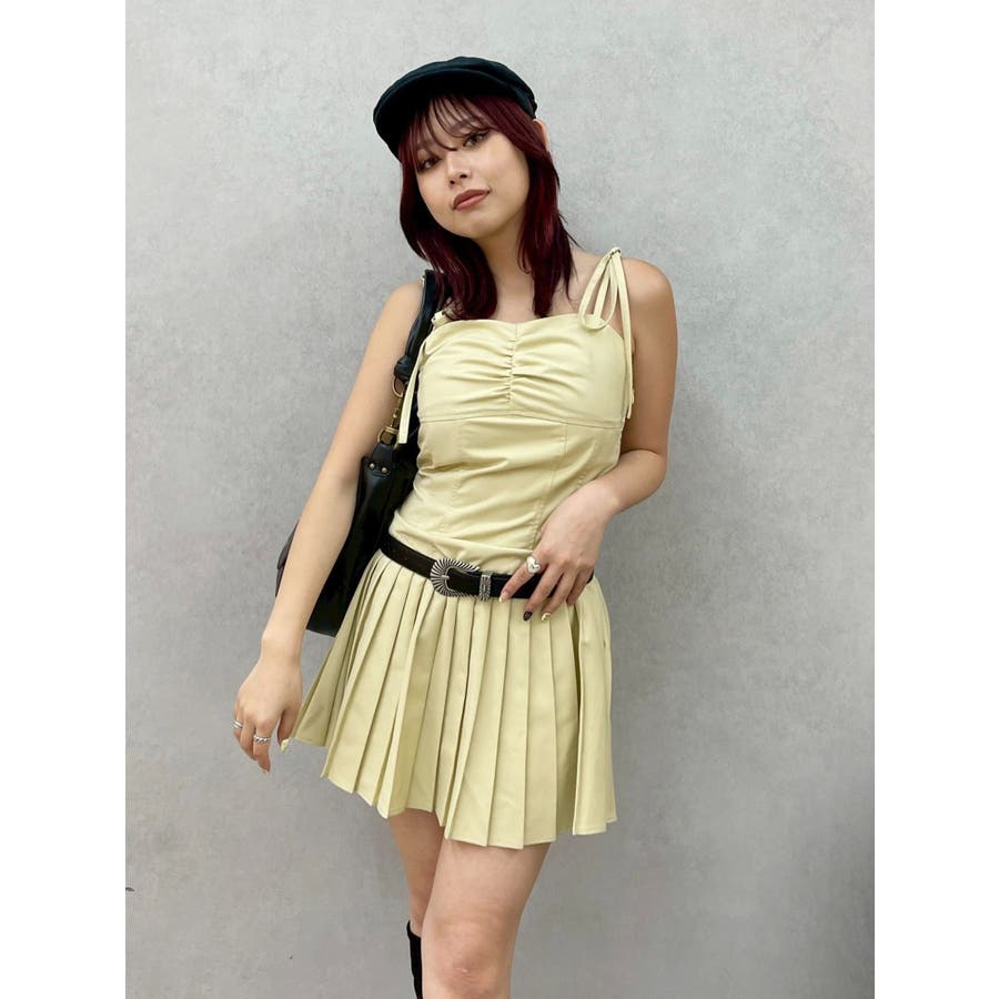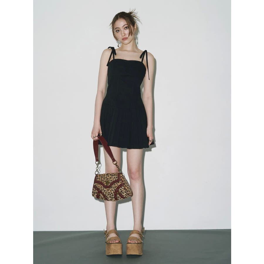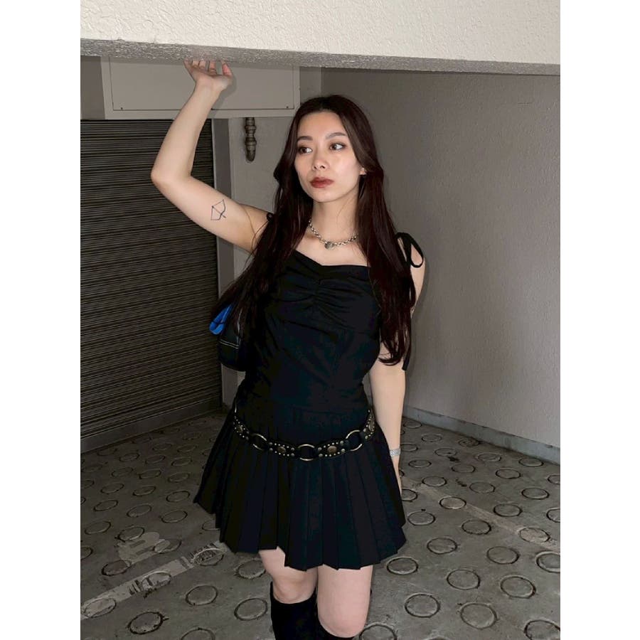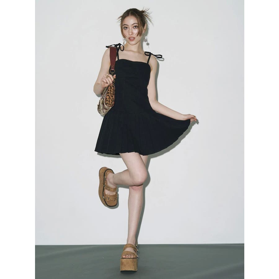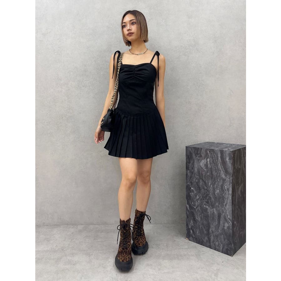 肩紐のリボンディテールがポイントのミニワンピースです。バストから腰回りまでピタっとしたサイズ感でスカート部分はプリーツ仕様でふわっと広がりのあるシルエットなのでメリハリのあるスタイルアップ効果のあるワンピースです。インナーにTシャツなど合わせるスタイリングもオススメです。-------------- 透け感:なし生地の厚み:普通伸縮性:なし 肩ひも部分:調整可--------------