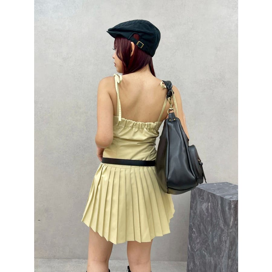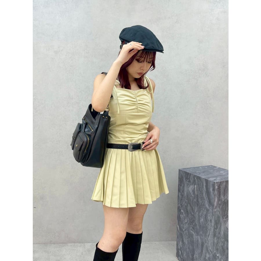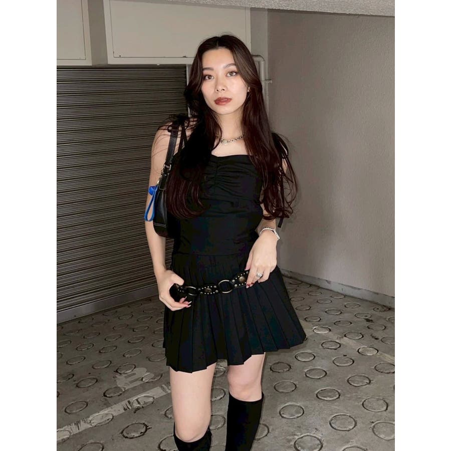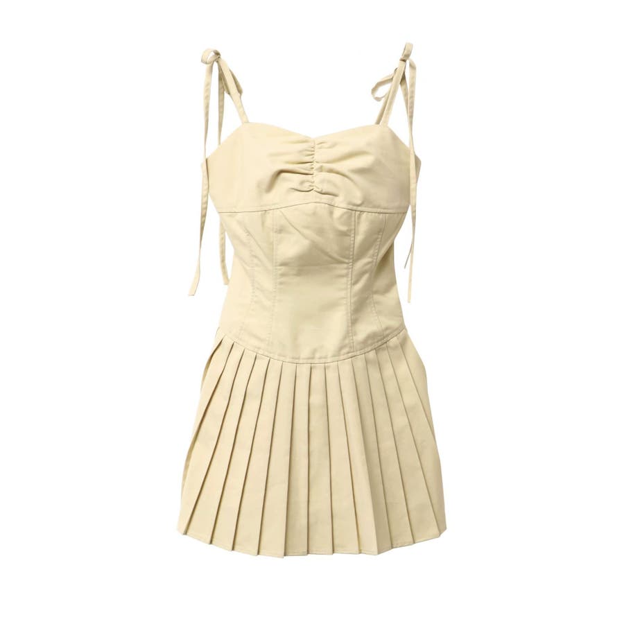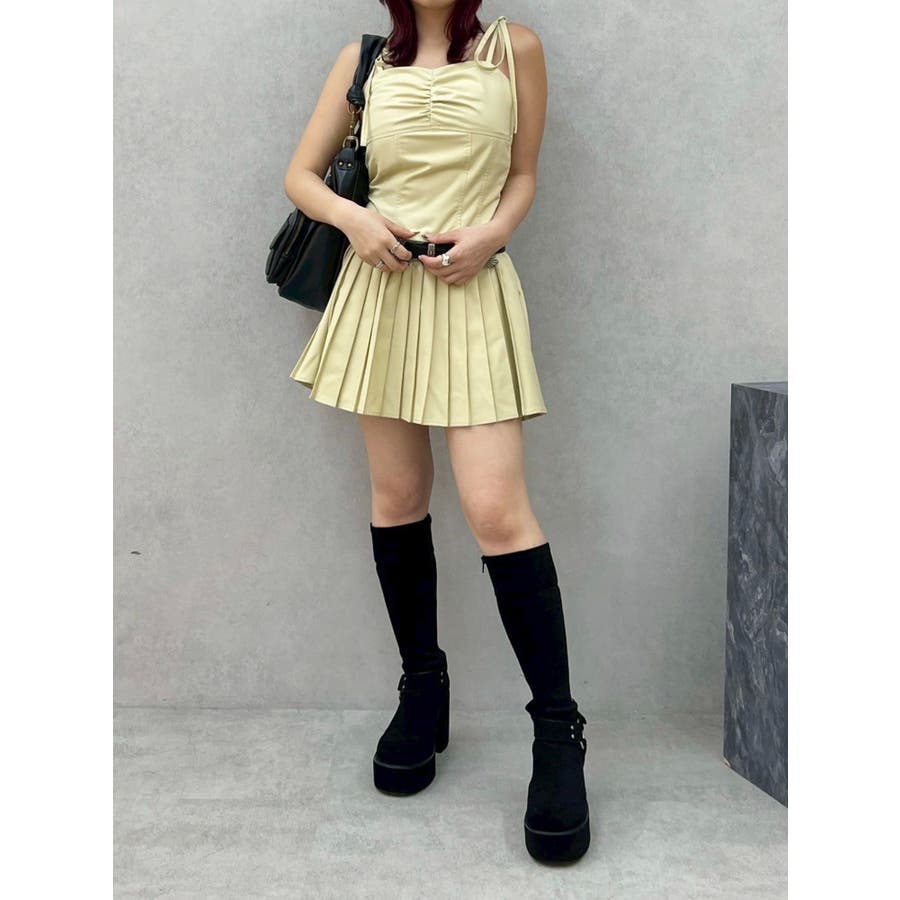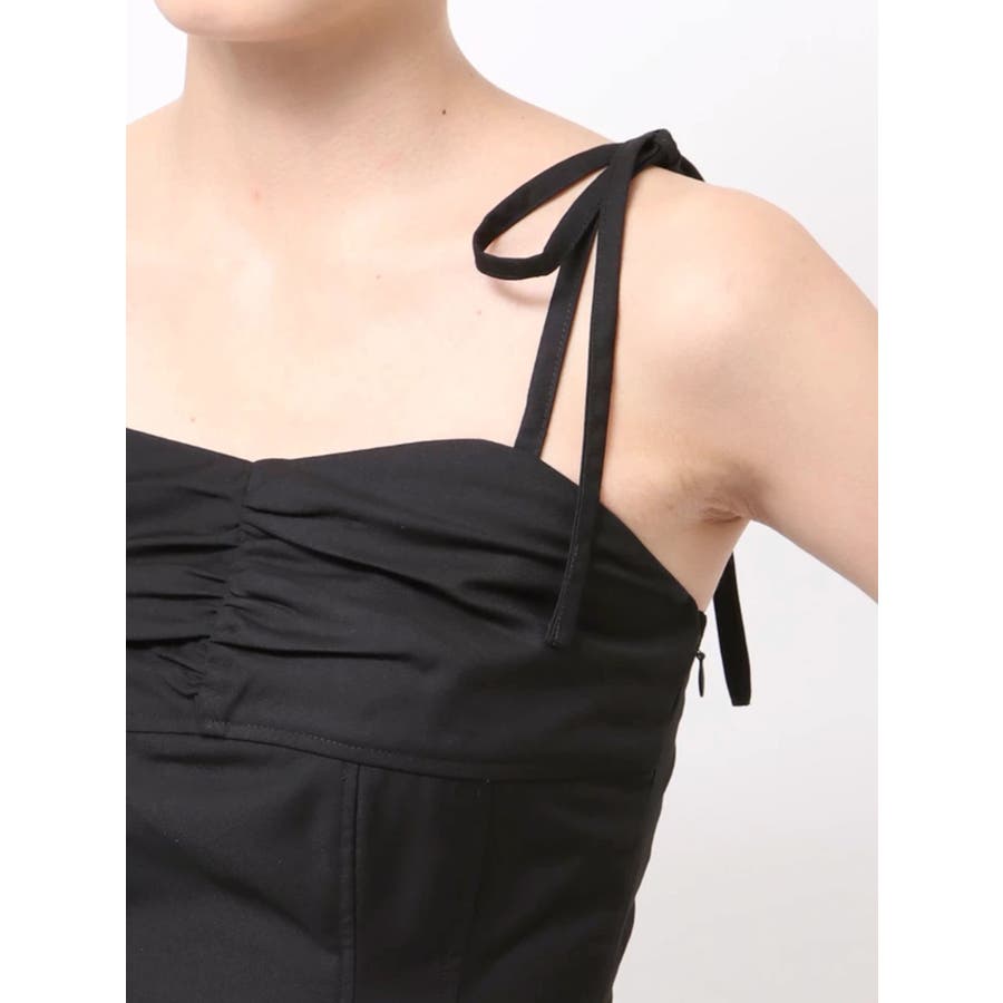 肩紐のリボンディテールがポイントのミニワンピースです。バストから腰回りまでピタっとしたサイズ感でスカート部分はプリーツ仕様でふわっと広がりのあるシルエットなのでメリハリのあるスタイルアップ効果のあるワンピースです。インナーにTシャツなど合わせるスタイリングもオススメです。-------------- 透け感:なし生地の厚み:普通伸縮性:なし 肩ひも部分:調整可--------------
