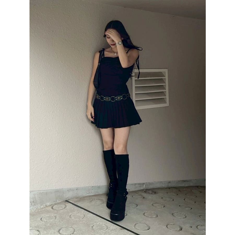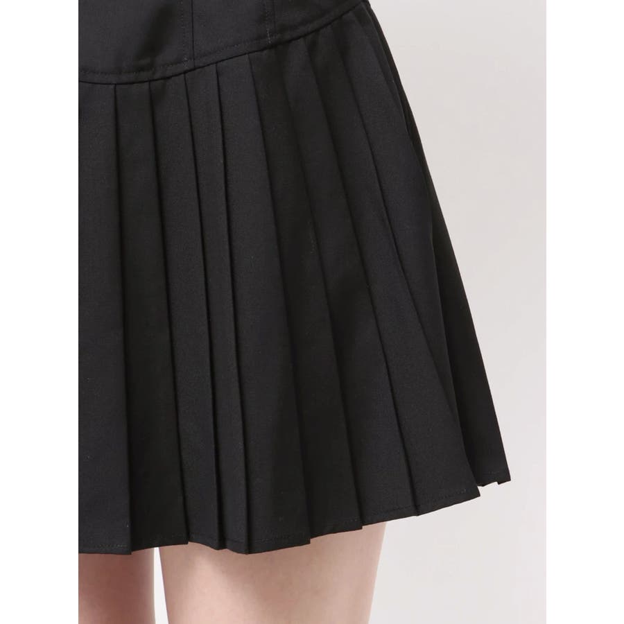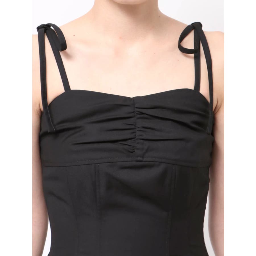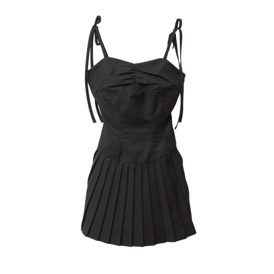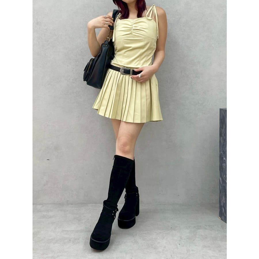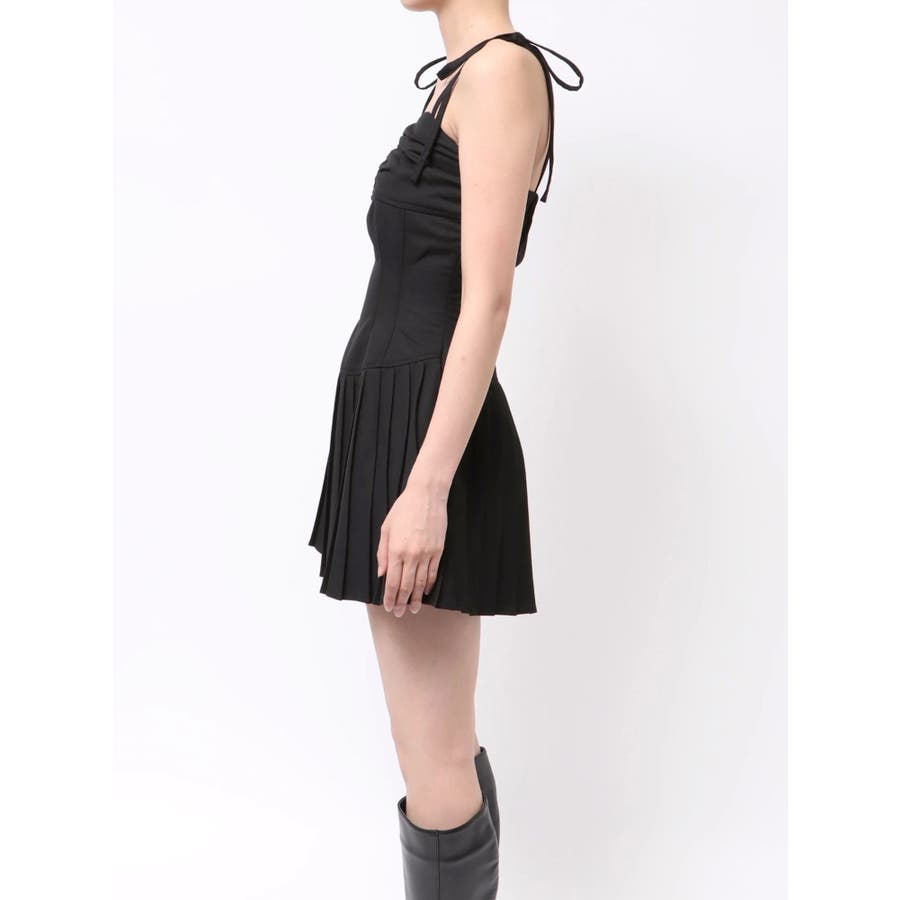 肩紐のリボンディテールがポイントのミニワンピースです。バストから腰回りまでピタっとしたサイズ感でスカート部分はプリーツ仕様でふわっと広がりのあるシルエットなのでメリハリのあるスタイルアップ効果のあるワンピースです。インナーにTシャツなど合わせるスタイリングもオススメです。-------------- 透け感:なし生地の厚み:普通伸縮性:なし 肩ひも部分:調整可--------------