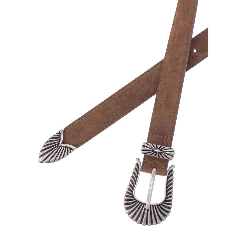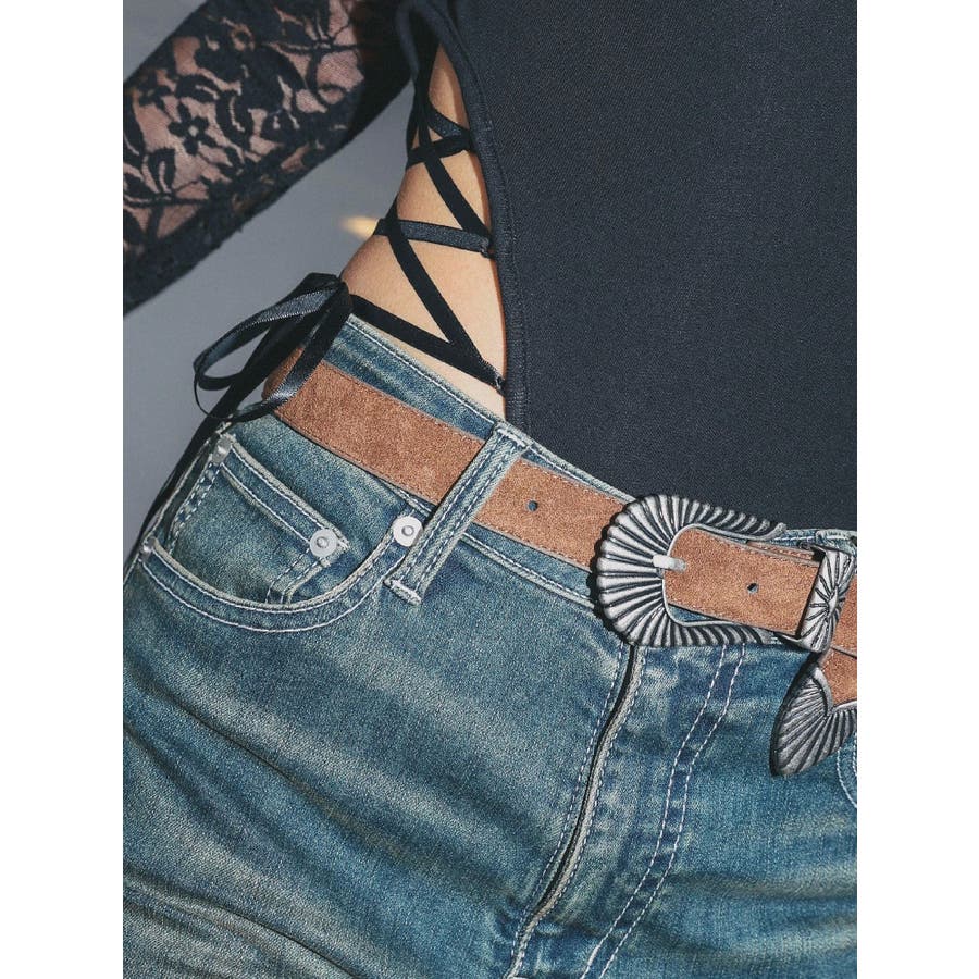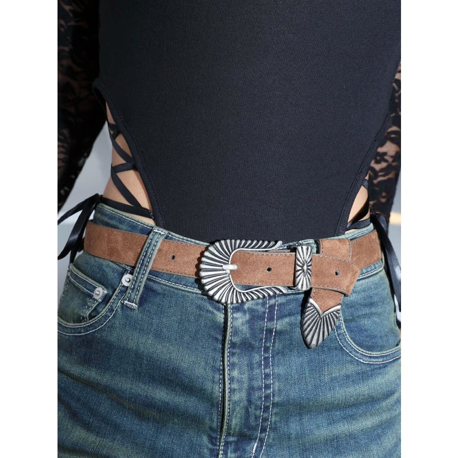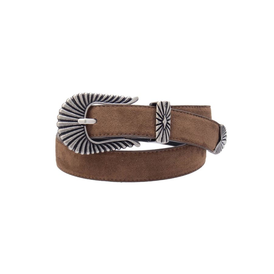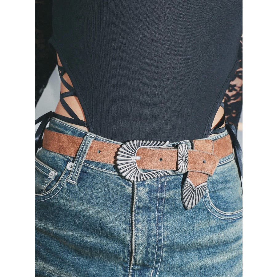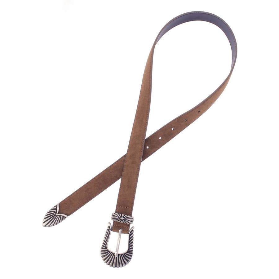 EVRISで大人気のバックルベルトにトレンドの「スウェード素材」が登場♪■デザインマットなシルバーに彫られた存在感のある刻印がポイントの太めのベルト シンプルなデザインなので色々なコーディネートにも合わせられる万能ITEM!■スタイリングデニムはもちろん、シンプルなパンツや柄物、なんにでも合わせて頂けます。 ニットワンピースやシャツワンピースのウエストマークとしても◎■定番のブラックはコチラ>>メタルバックルフェイクレザーベルト(ブラック)