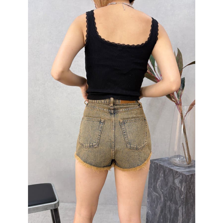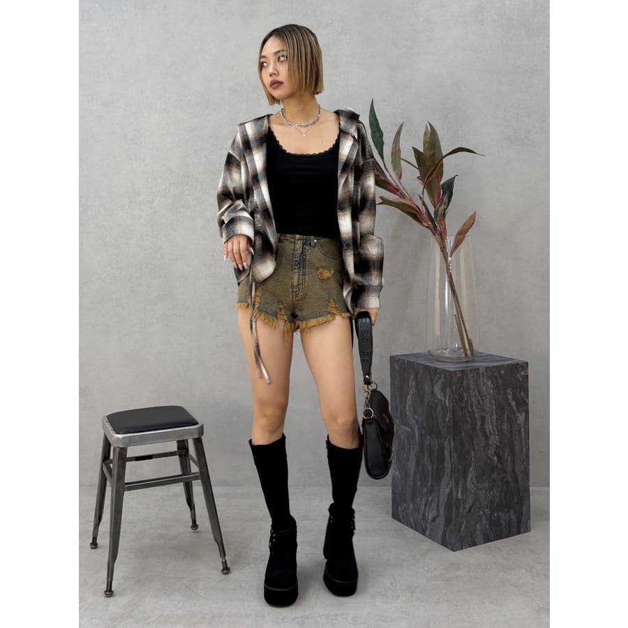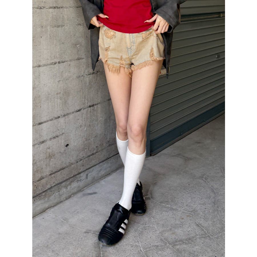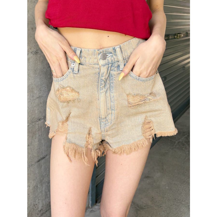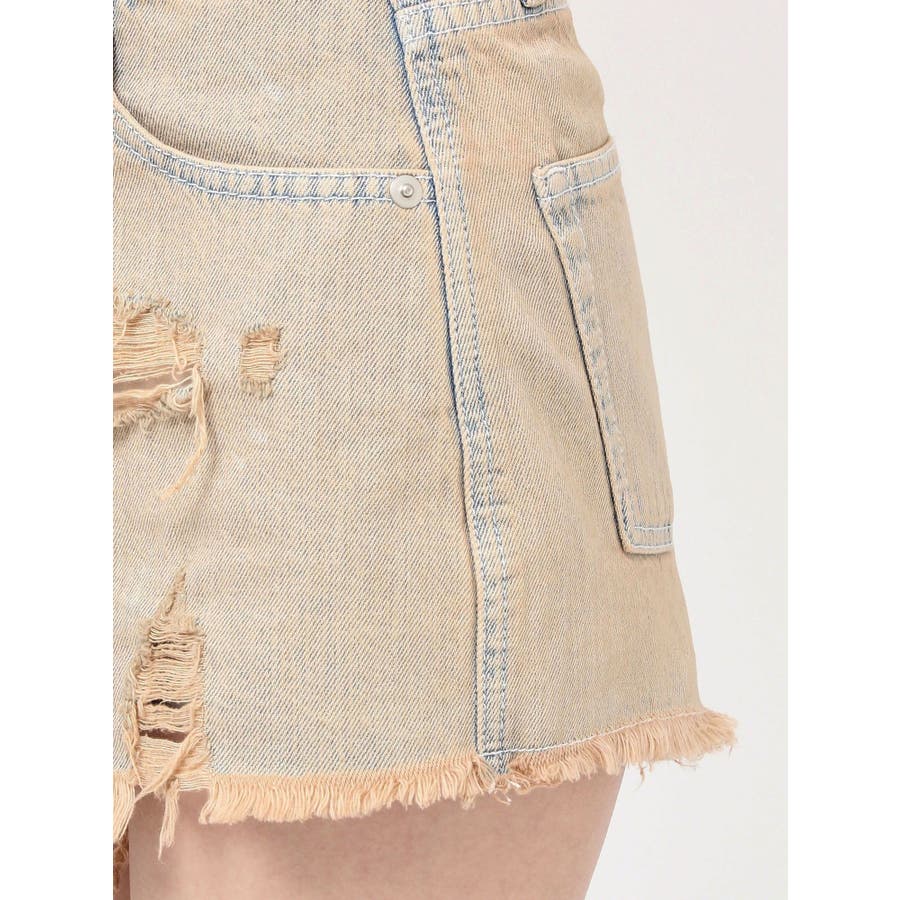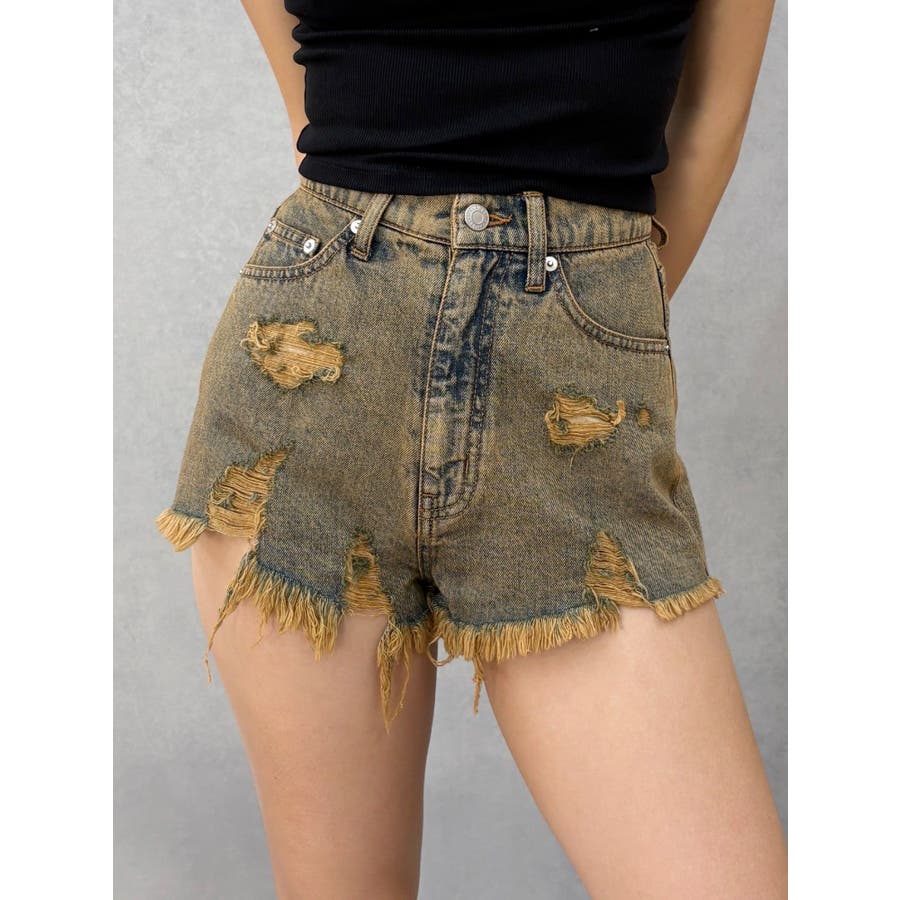 ■デザインデニムにベージュのトッピングを施し、グランジ感を再現したショートパンツです。裾の切りっぱなしや、表面のダメージ加工がヴィンテージ感を演出。トレンドのコンパクトなサイズ感で、脚長効果も期待できます。■スタイリンググランジ感のあるボトムにはレースアイテムなどキレイ目アイテムを合わせるのがおすすめ。コンパクトなので、オーバーサイズトップスのインナーなどにも使いやすく幅広いコーディネートに合わせて着用していただけます。-------------- 透け感:なし 裏地:なし 生地の厚み:普通伸縮性:なし--------------