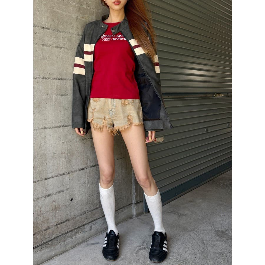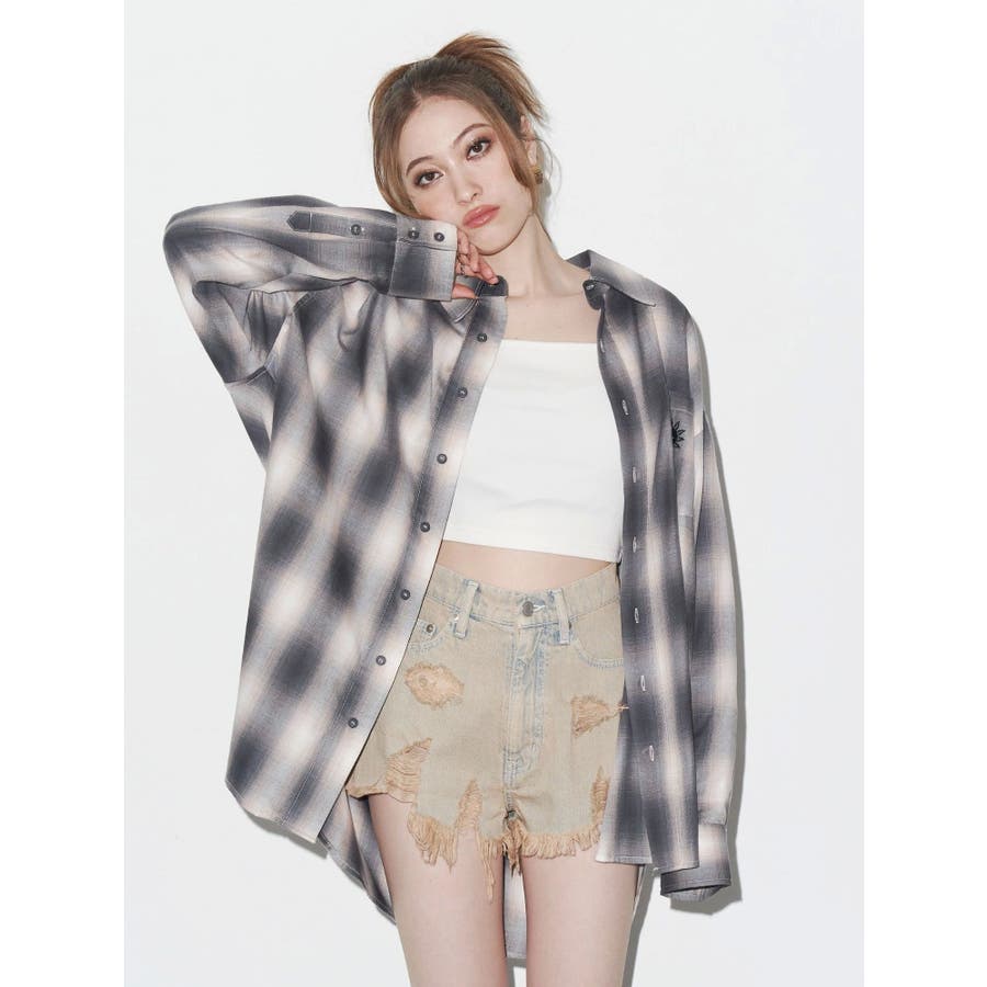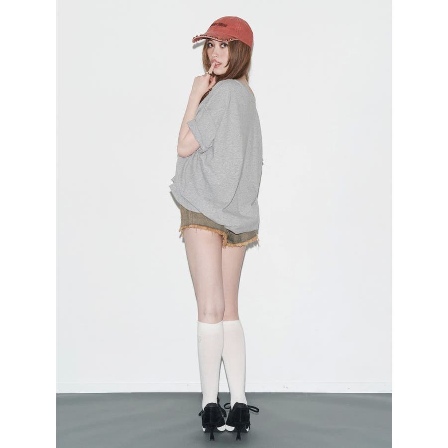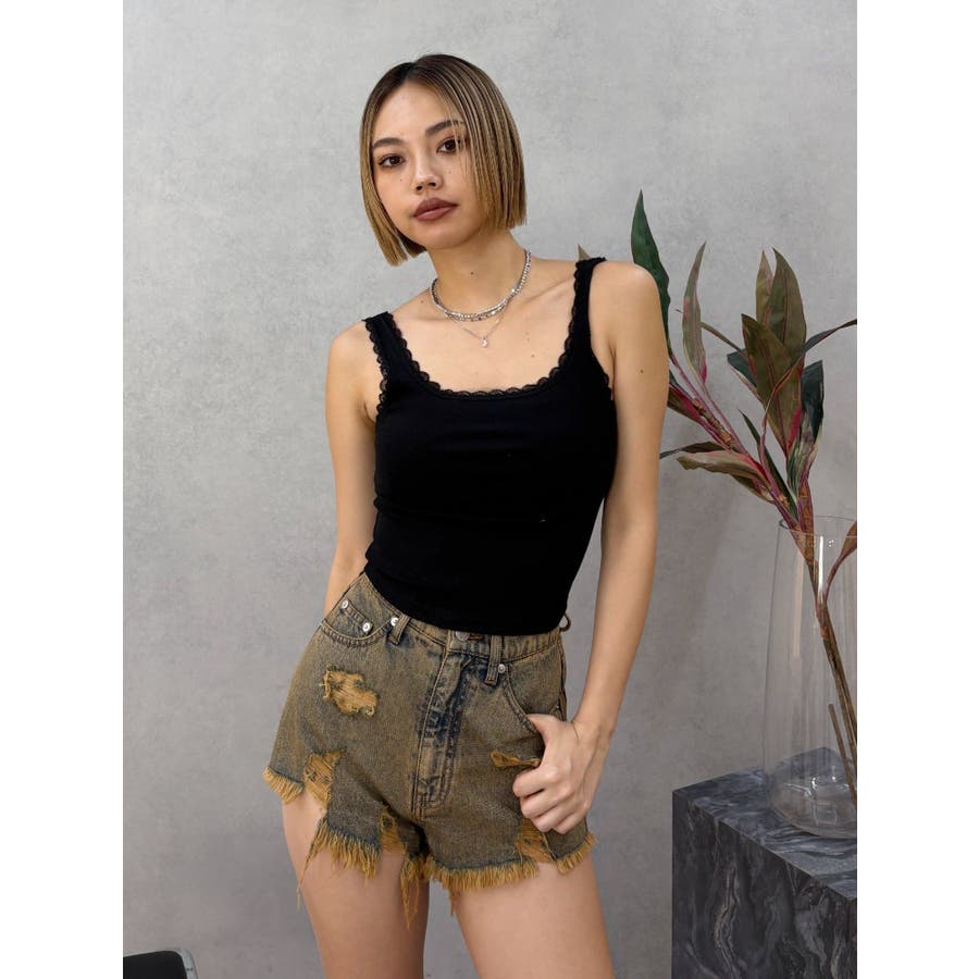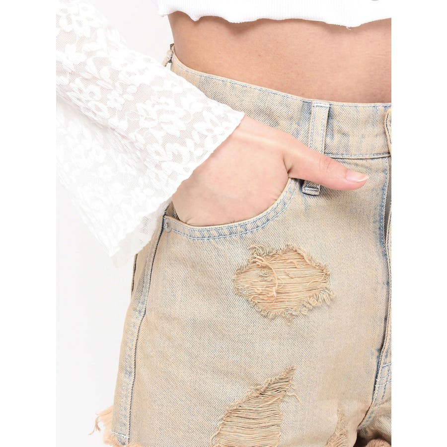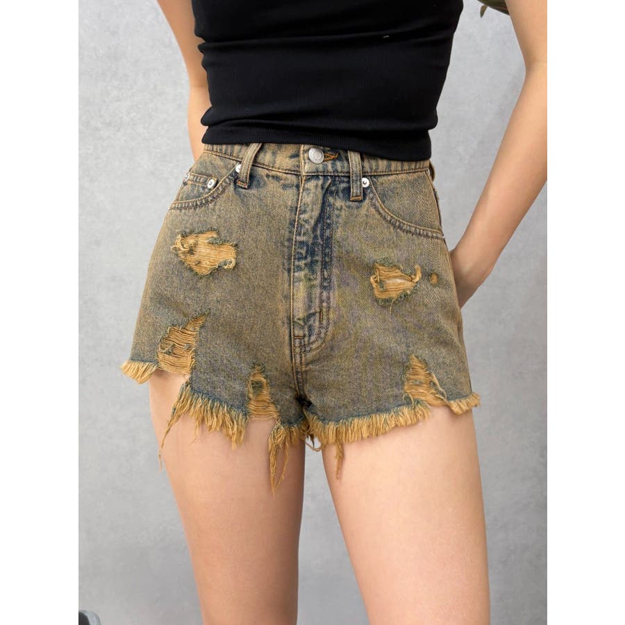■デザインデニムにベージュのトッピングを施し、グランジ感を再現したショートパンツです。裾の切りっぱなしや、表面のダメージ加工がヴィンテージ感を演出。トレンドのコンパクトなサイズ感で、脚長効果も期待できます。■スタイリンググランジ感のあるボトムにはレースアイテムなどキレイ目アイテムを合わせるのがおすすめ。コンパクトなので、オーバーサイズトップスのインナーなどにも使いやすく幅広いコーディネートに合わせて着用していただけます。-------------- 透け感:なし 裏地:なし 生地の厚み:普通伸縮性:なし--------------