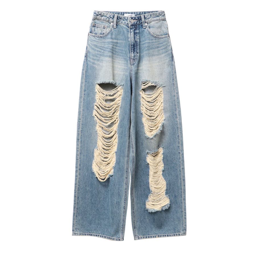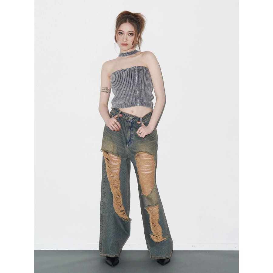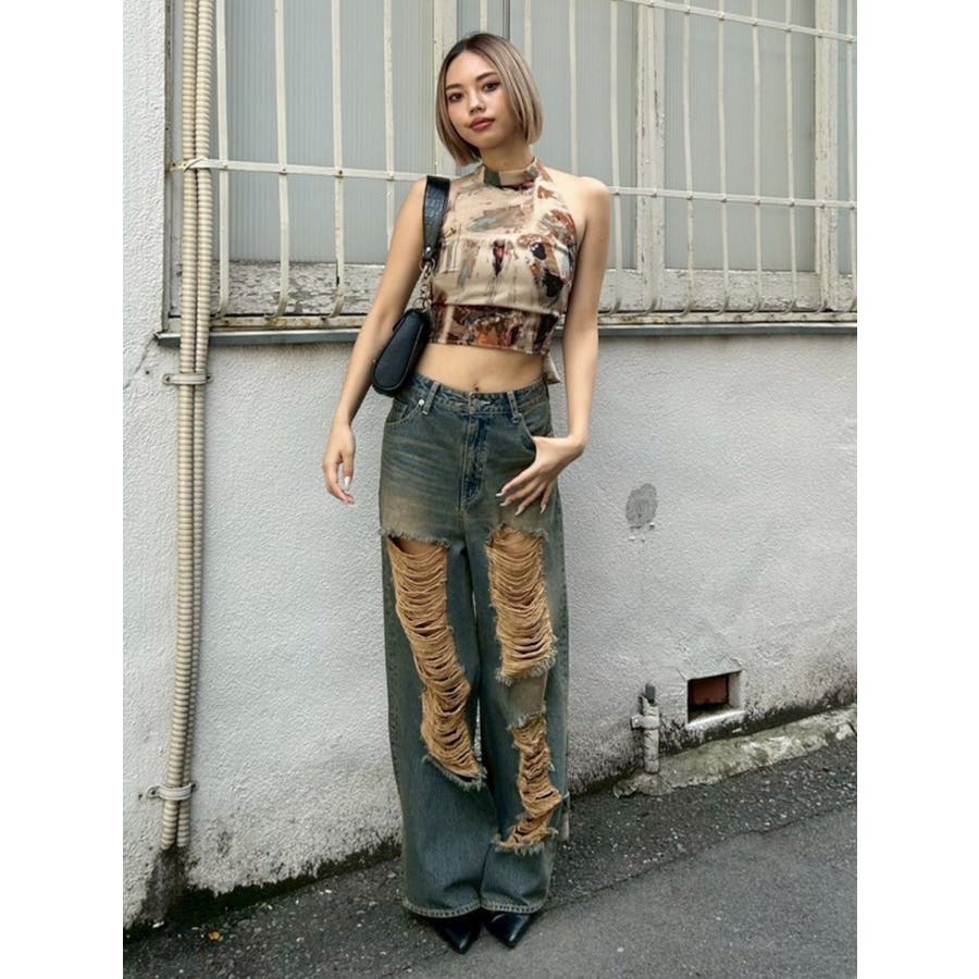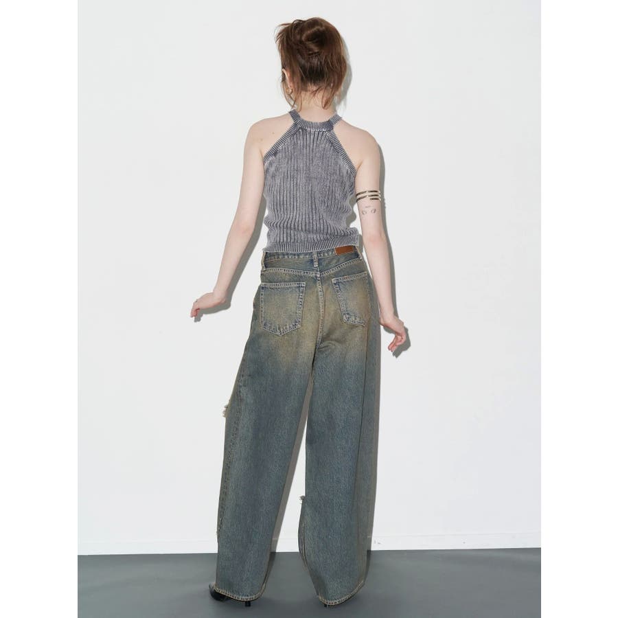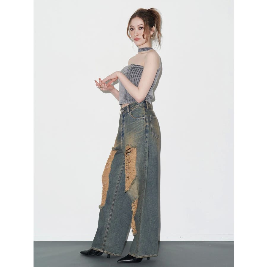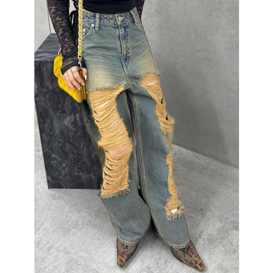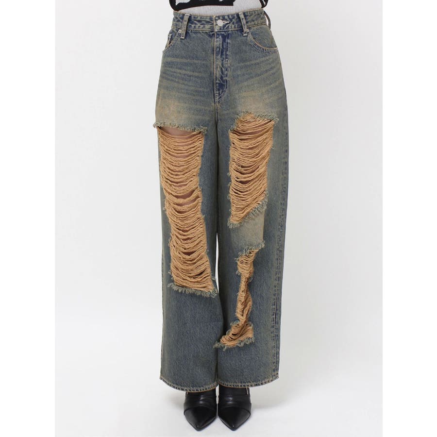 ハードめなダメージをしっかり入れたハイウエストのワイドデニムパンツです。ルーズなサイズでトレンド感のある1枚に仕上がっています。ヴィンテージ感のある黄みがかった色味もポイントです。コンパクトトップスと合わせるとスタイルアップ効果抜群です。■スタイリング・ハードなダメージがコーデの主役になるのでシンプルなキャミソールやタンクトップ合わせで◎・あえてレーストップスを合わせて甘×辛ミックス・ダメージTシャツやオーバーサイズTシャツを合わせてとことんグランジ感を楽しむのも◎