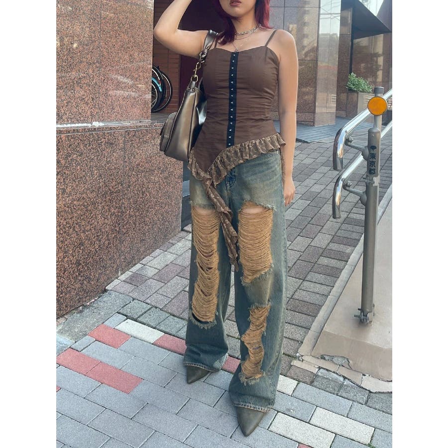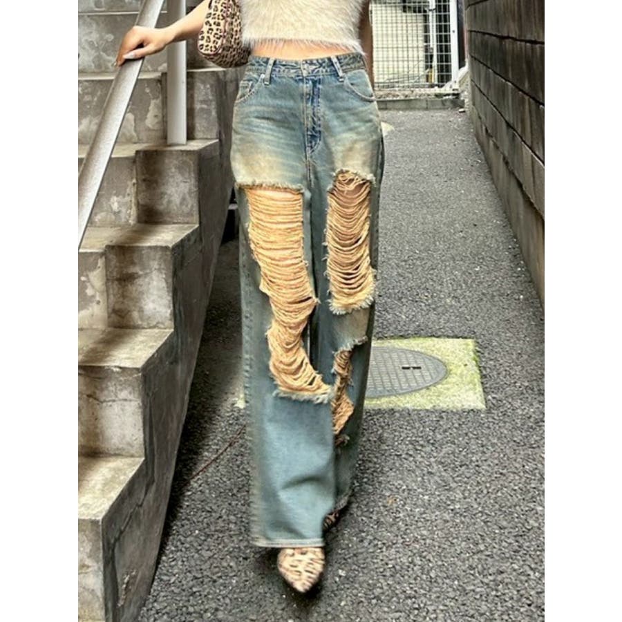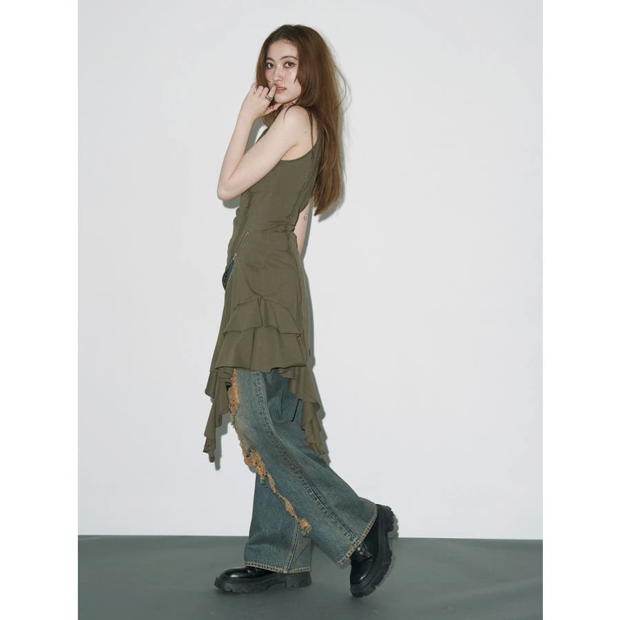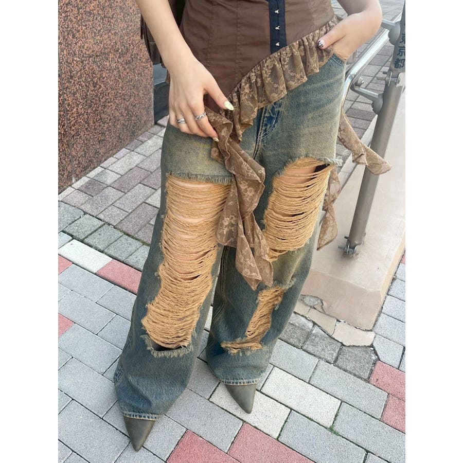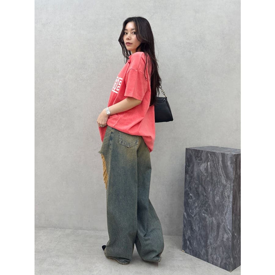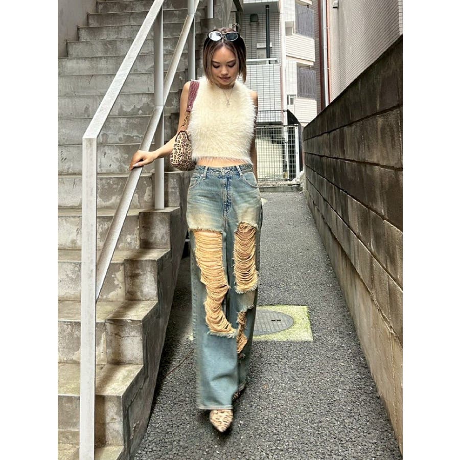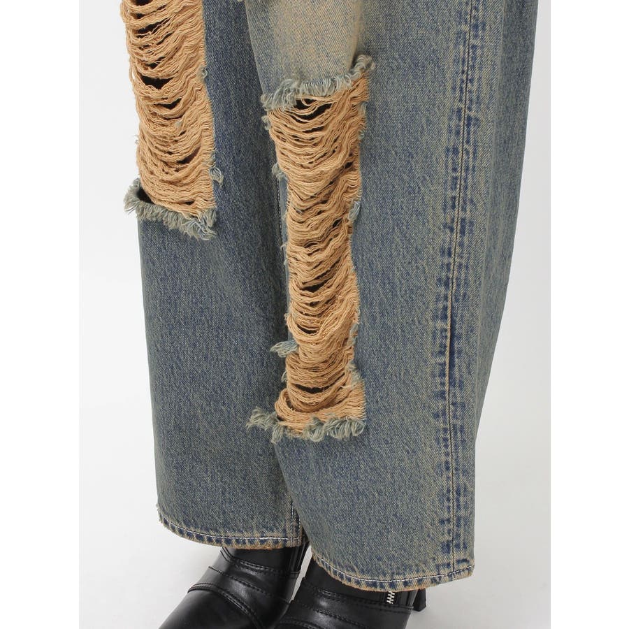 ハードめなダメージをしっかり入れたハイウエストのワイドデニムパンツです。ルーズなサイズでトレンド感のある1枚に仕上がっています。ヴィンテージ感のある黄みがかった色味もポイントです。コンパクトトップスと合わせるとスタイルアップ効果抜群です。■スタイリング・ハードなダメージがコーデの主役になるのでシンプルなキャミソールやタンクトップ合わせで◎・あえてレーストップスを合わせて甘×辛ミックス・ダメージTシャツやオーバーサイズTシャツを合わせてとことんグランジ感を楽しむのも◎