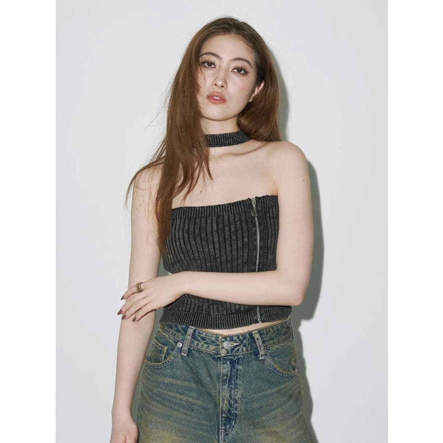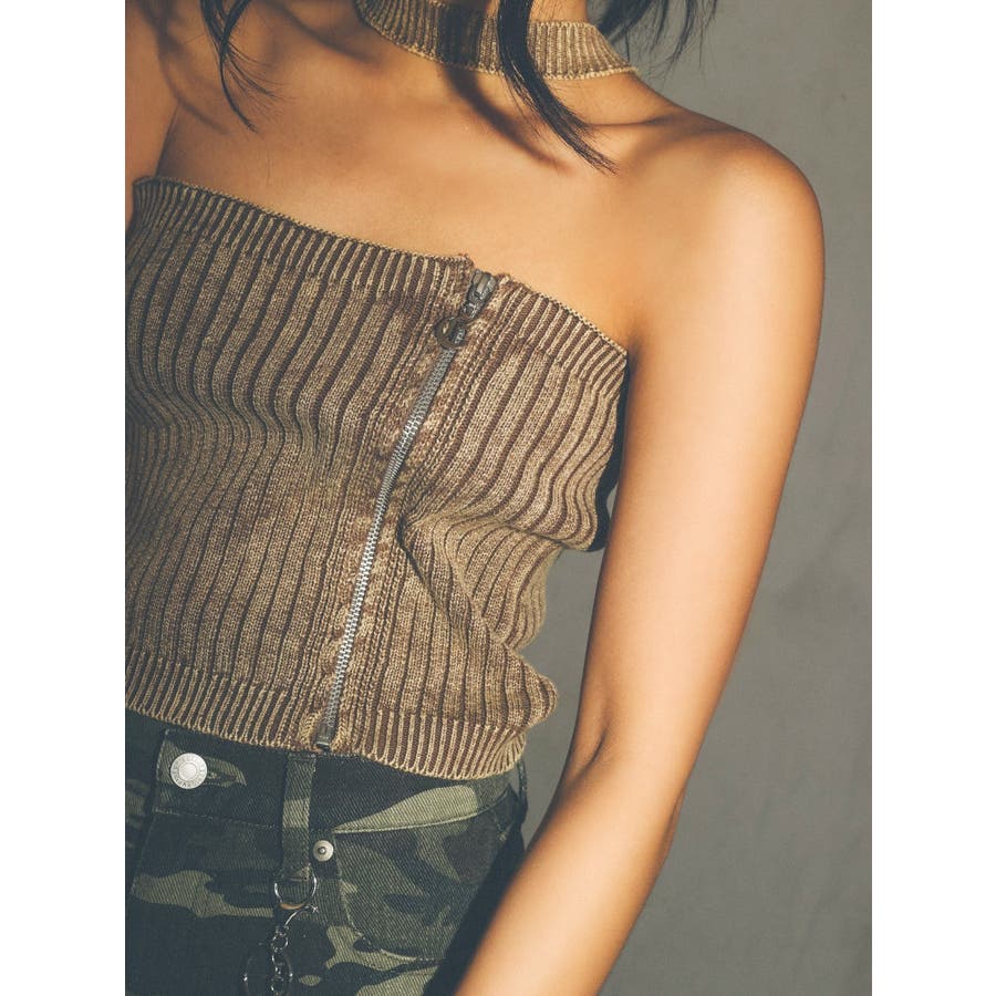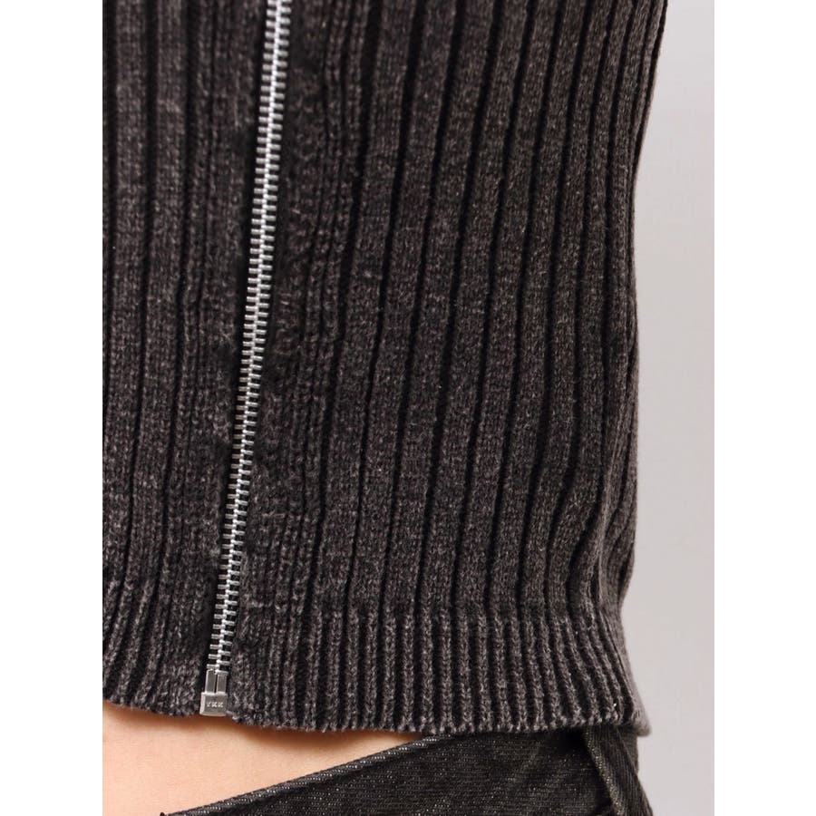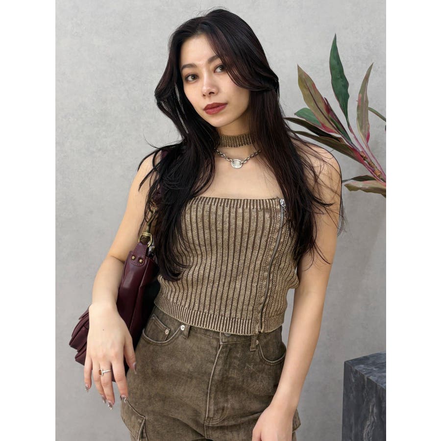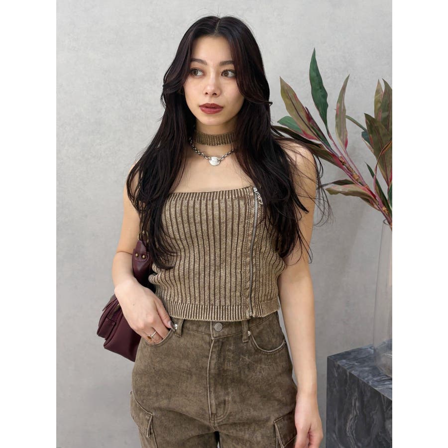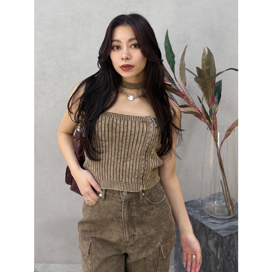 ■デザインフロントにジップとチャームをつけたデザインがポイントのニットトップスです。チョーカーデザインでピグメント加工を入れており、カジュアルながらもエッジの効いた1枚に仕上がっています。ワイドボトムやハイウエストボトムと合わせたスタイリングがスタイルアップ効果がありおすすめです。※一部サンプルでの撮影のため着丈が少し長いものがあります。詳細画像が正しい商品の仕様になります。■スタイリングコンパクトですっきりとしたシルエットを活かしてフレアパンツや、カーゴパンツなどボリュームのあるボトムと合わせるのがおすすめです。--------------透け感:なし裏地:なし生地の厚み:普通伸縮性:あり--------------