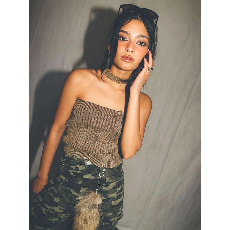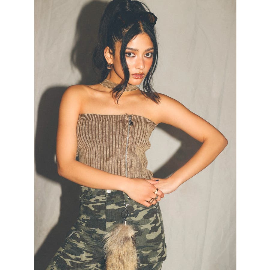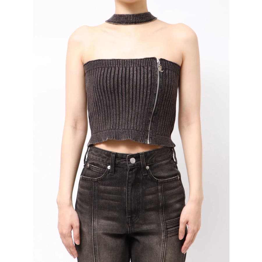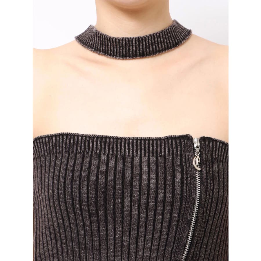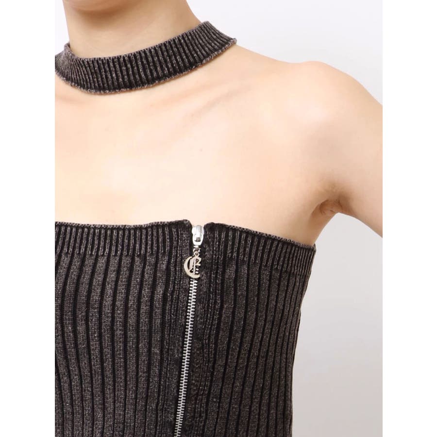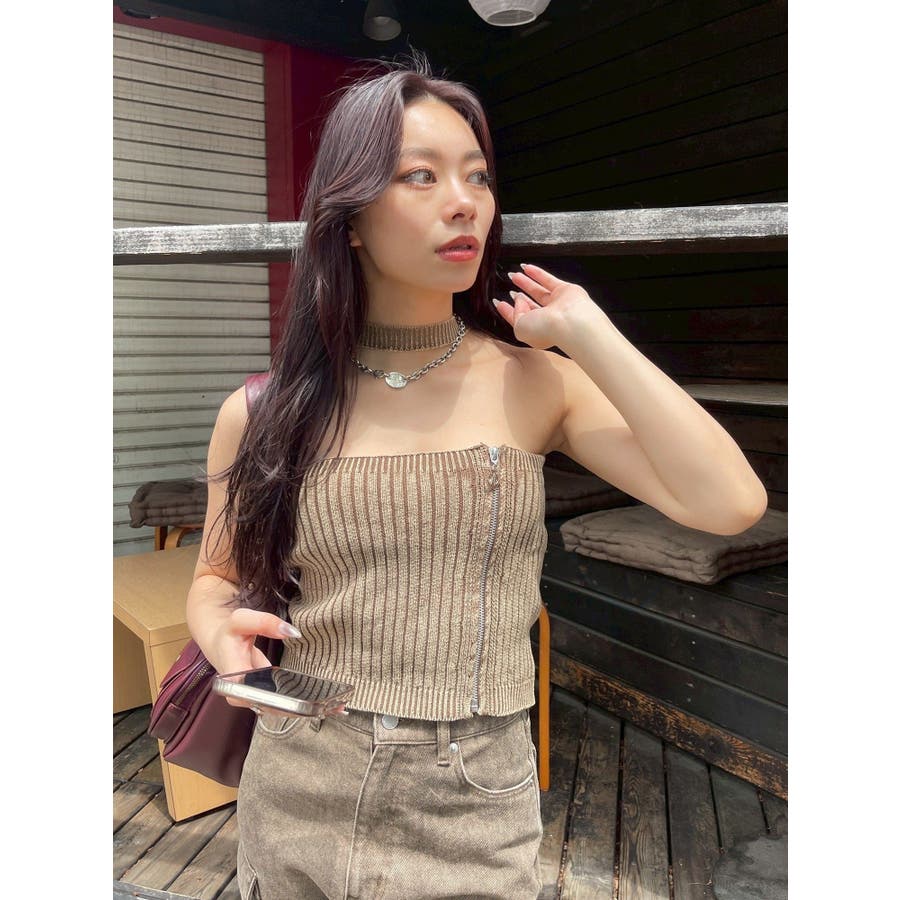 ■デザインフロントにジップとチャームをつけたデザインがポイントのニットトップスです。チョーカーデザインでピグメント加工を入れており、カジュアルながらもエッジの効いた1枚に仕上がっています。ワイドボトムやハイウエストボトムと合わせたスタイリングがスタイルアップ効果がありおすすめです。※一部サンプルでの撮影のため着丈が少し長いものがあります。詳細画像が正しい商品の仕様になります。■スタイリングコンパクトですっきりとしたシルエットを活かしてフレアパンツや、カーゴパンツなどボリュームのあるボトムと合わせるのがおすすめです。--------------透け感:なし裏地:なし生地の厚み:普通伸縮性:あり--------------