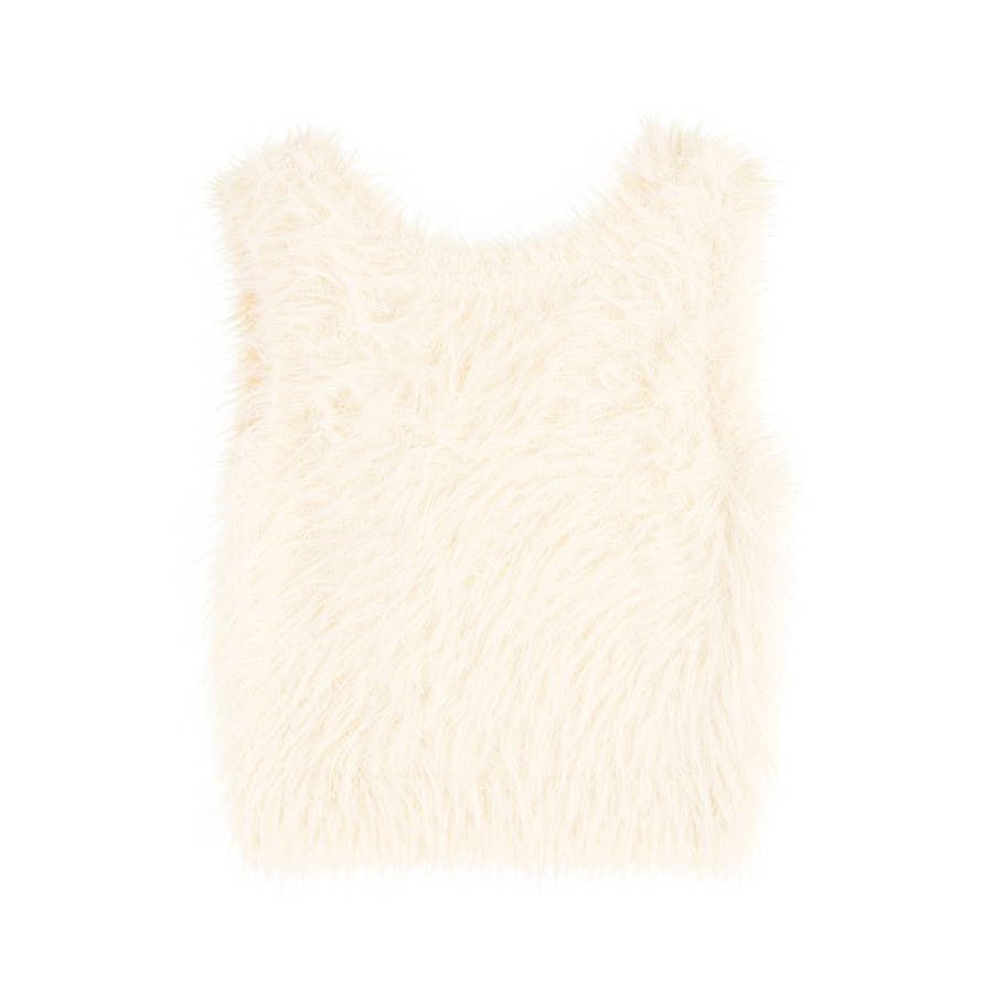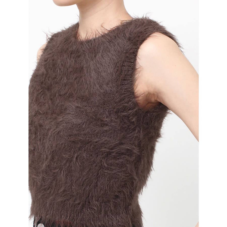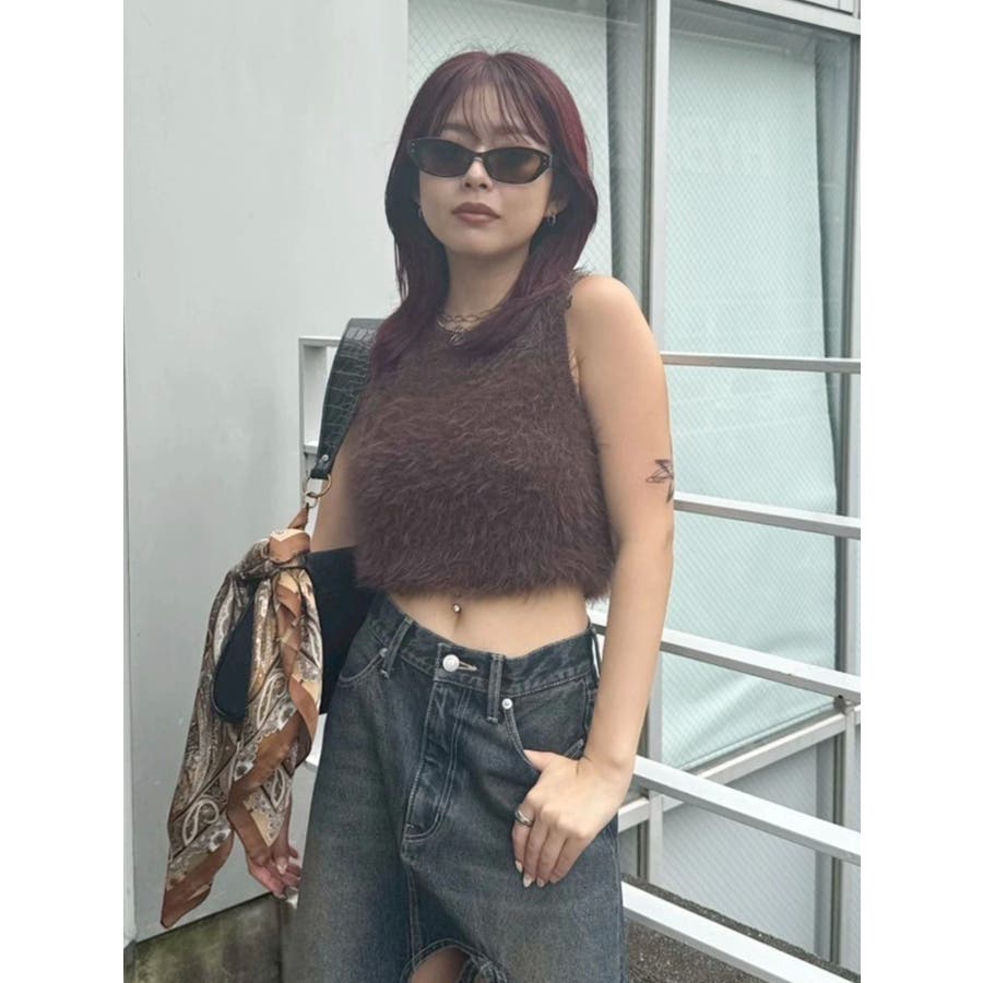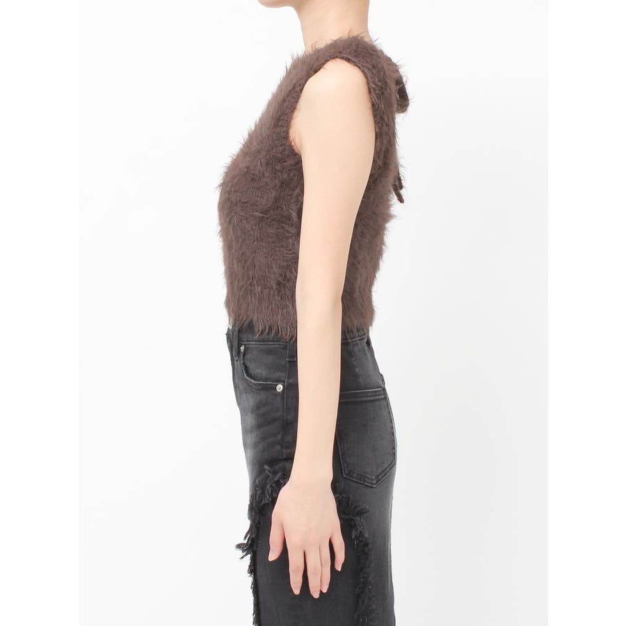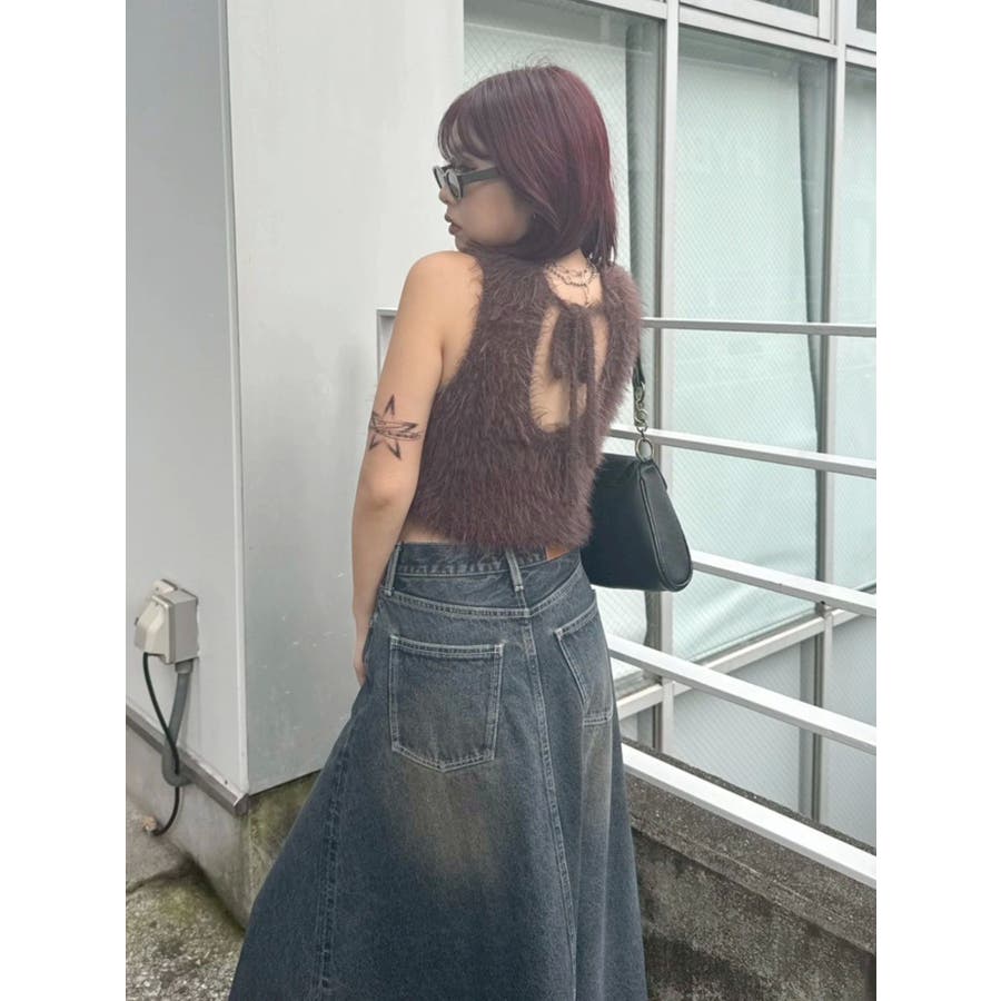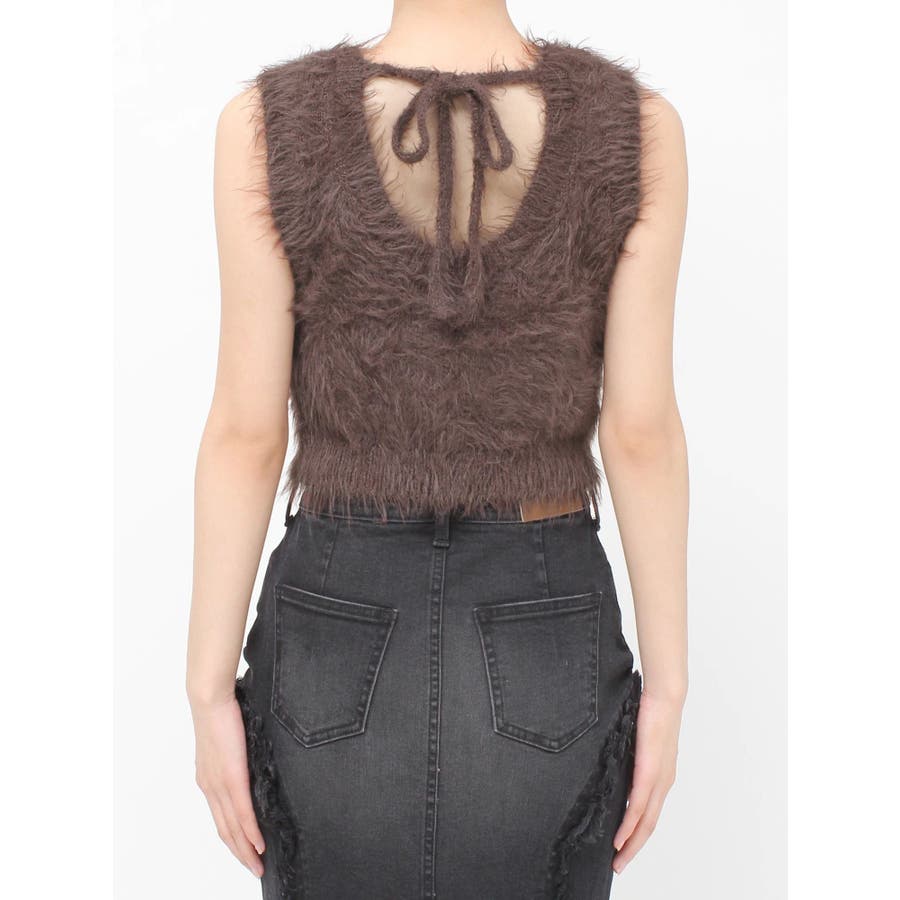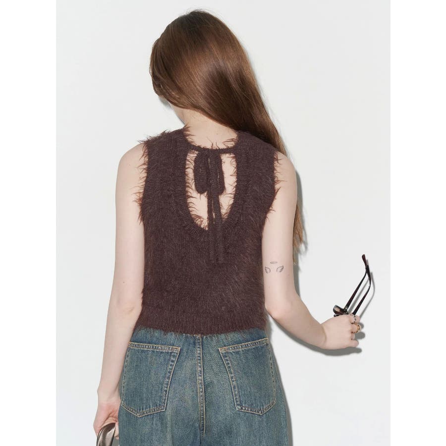 ふわっとしたシャギー素材と背中あきでリボンがポイントのニットタンクです。秋の立ち上がりにはぴったりの、秋めいたデザインのトップスです。ワイドデニムやスカートなど、なんにでも合わせやすいシンプルなデザインのトップスです。