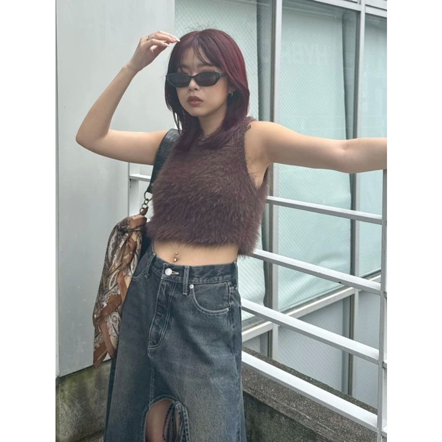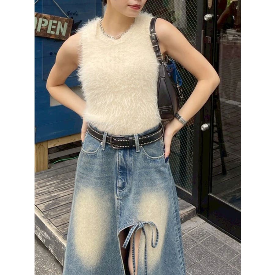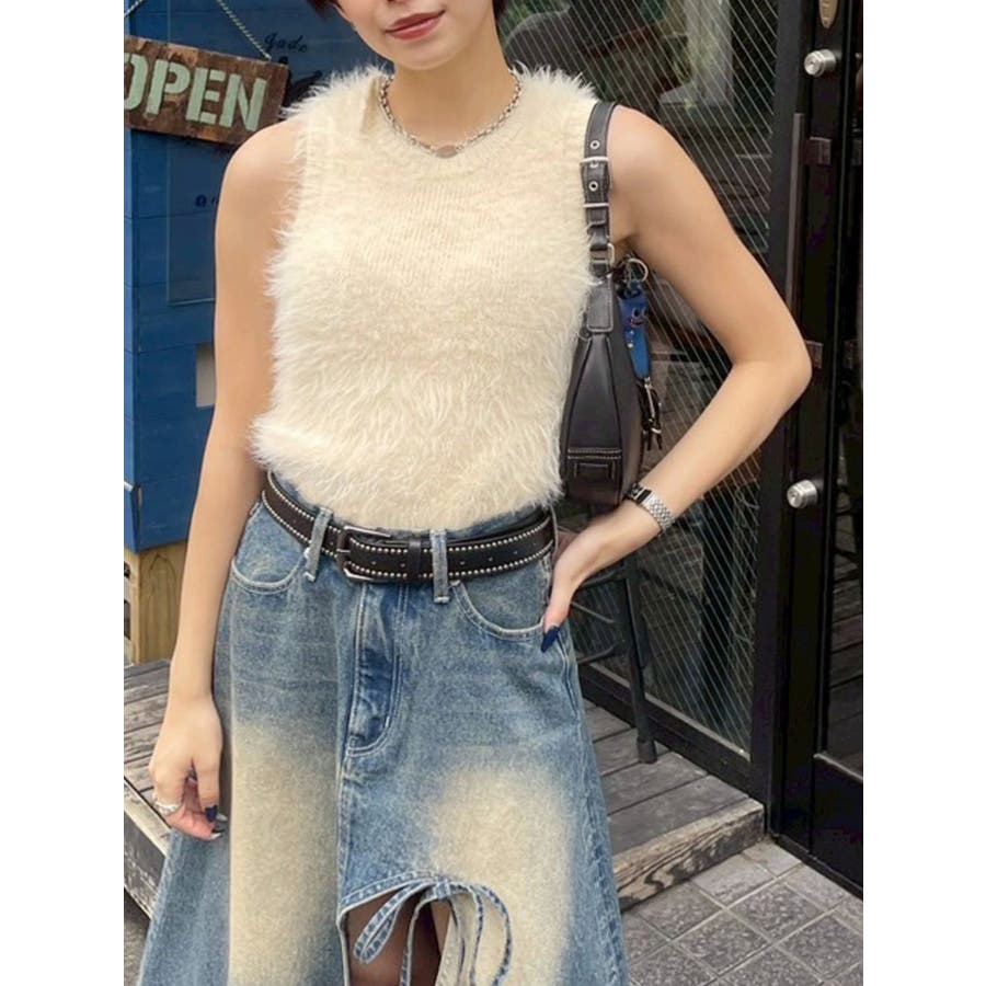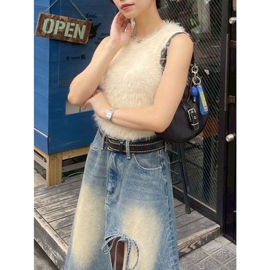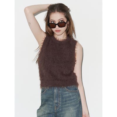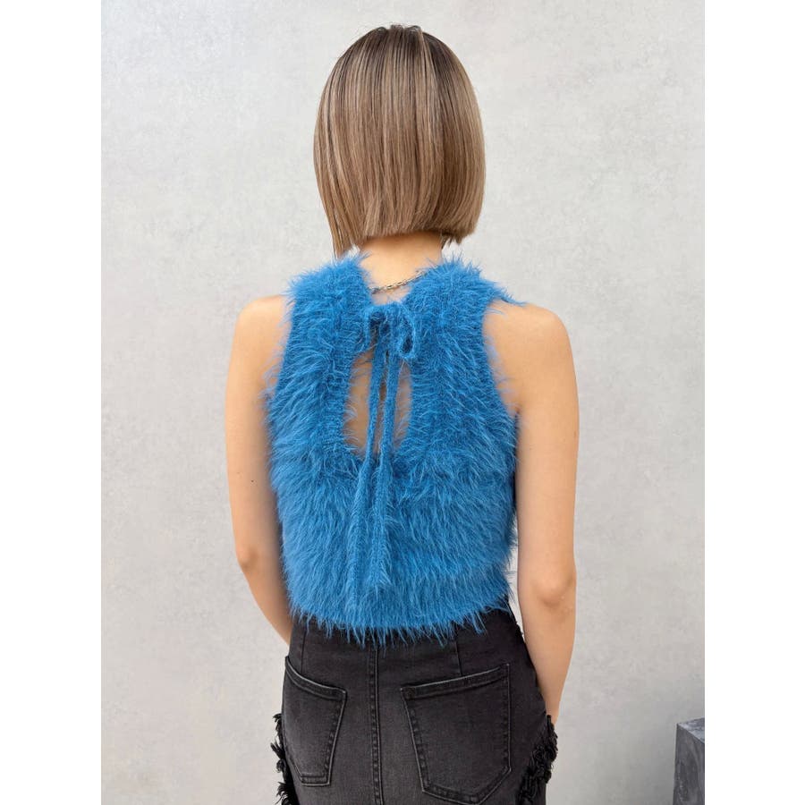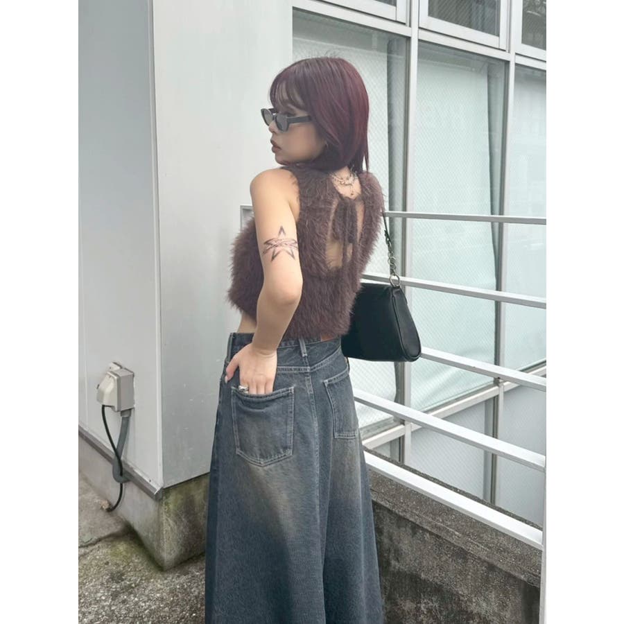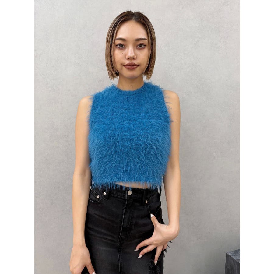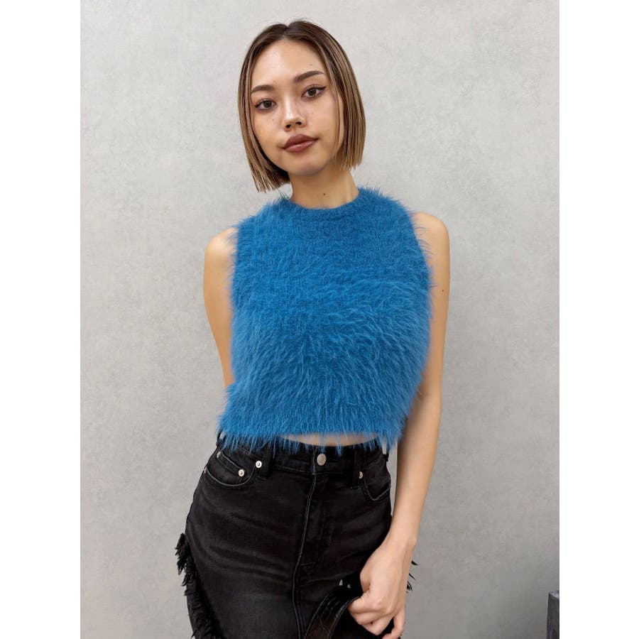 ふわっとしたシャギー素材と背中あきでリボンがポイントのニットタンクです。秋の立ち上がりにはぴったりの、秋めいたデザインのトップスです。ワイドデニムやスカートなど、なんにでも合わせやすいシンプルなデザインのトップスです。