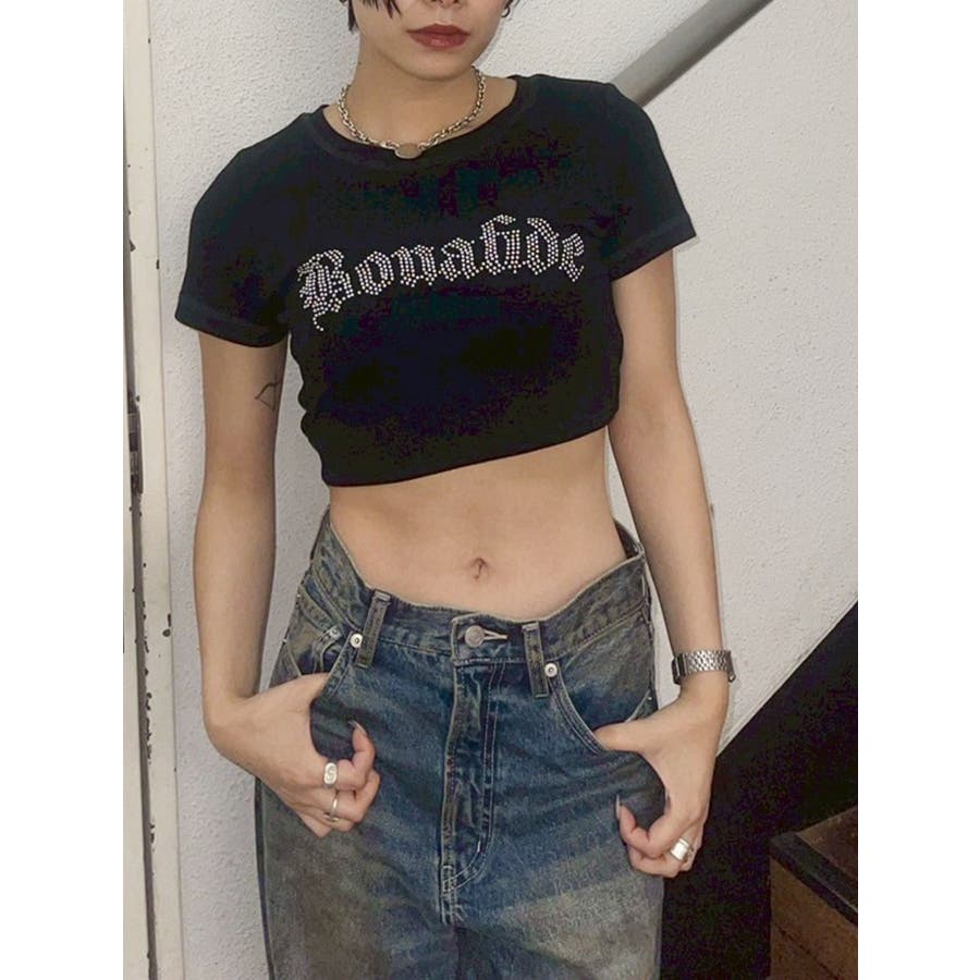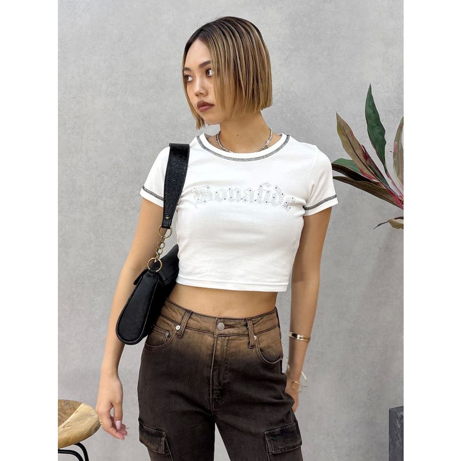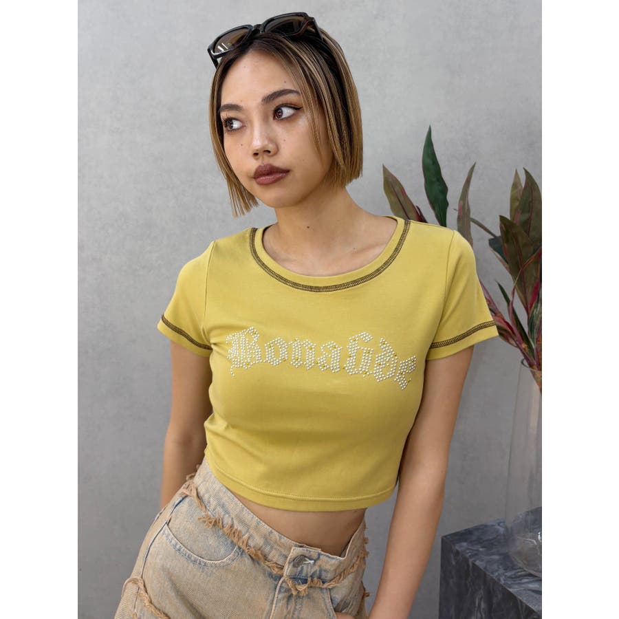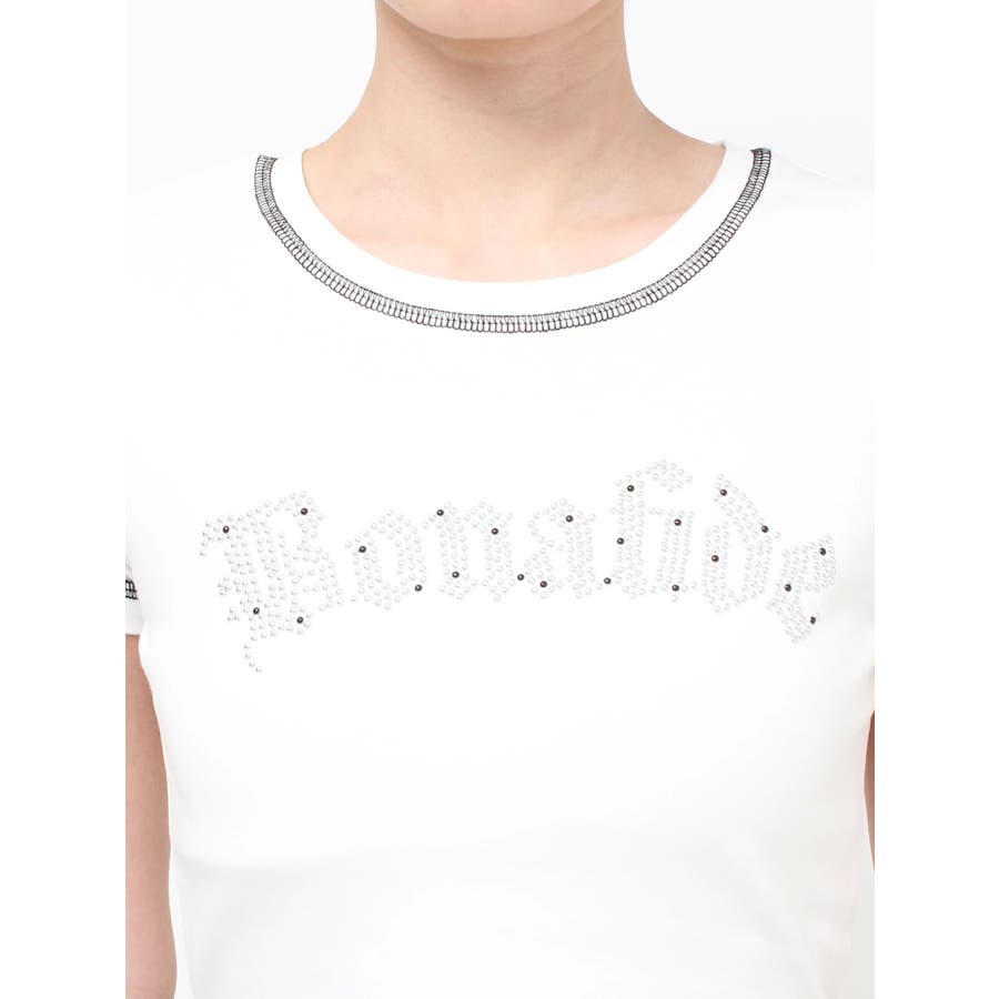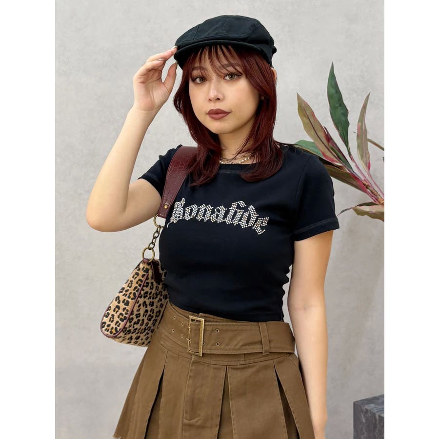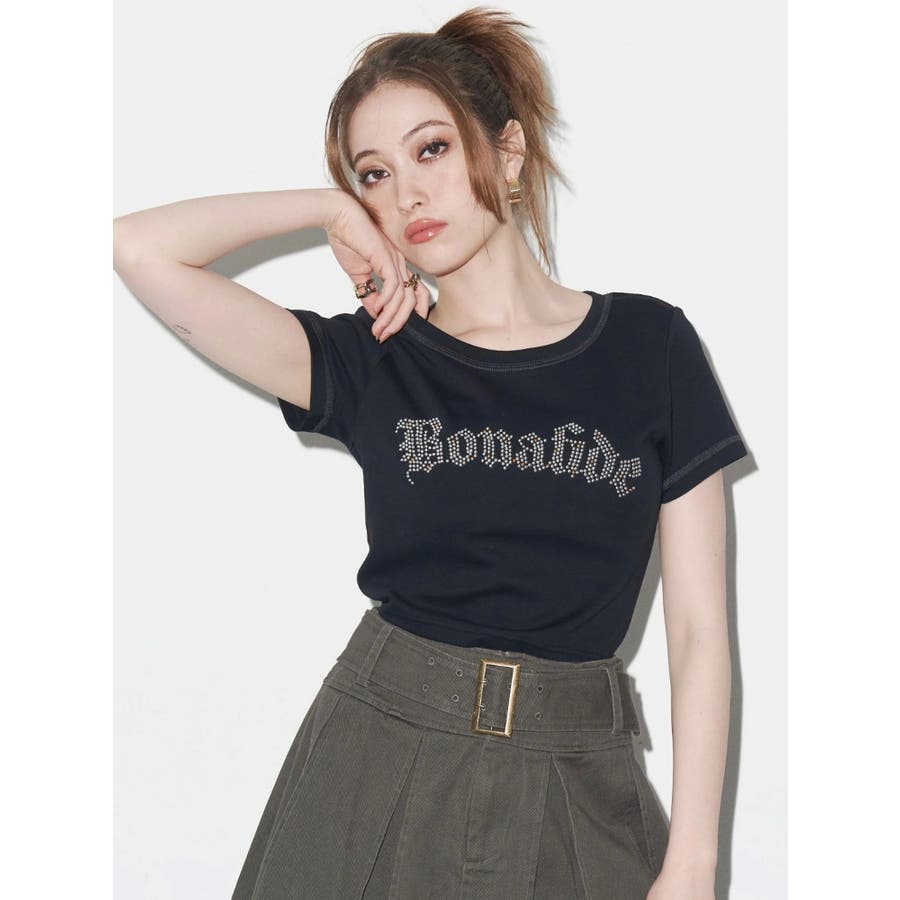 スタッズで入れたグラフィックと配色ステッチがポイントのコンパクトTシャツです。伸縮性のあるスムース生地を使用しております。トレンドのスタッズを使用したグラフィックでエッジが効いているデザインです。2色のスタッズを使用しています。ハイウエストボトムやワイドボトムとの相性が抜群です。■ロゴの意味Bona fide=正真正銘の。本物。(ラテン語)