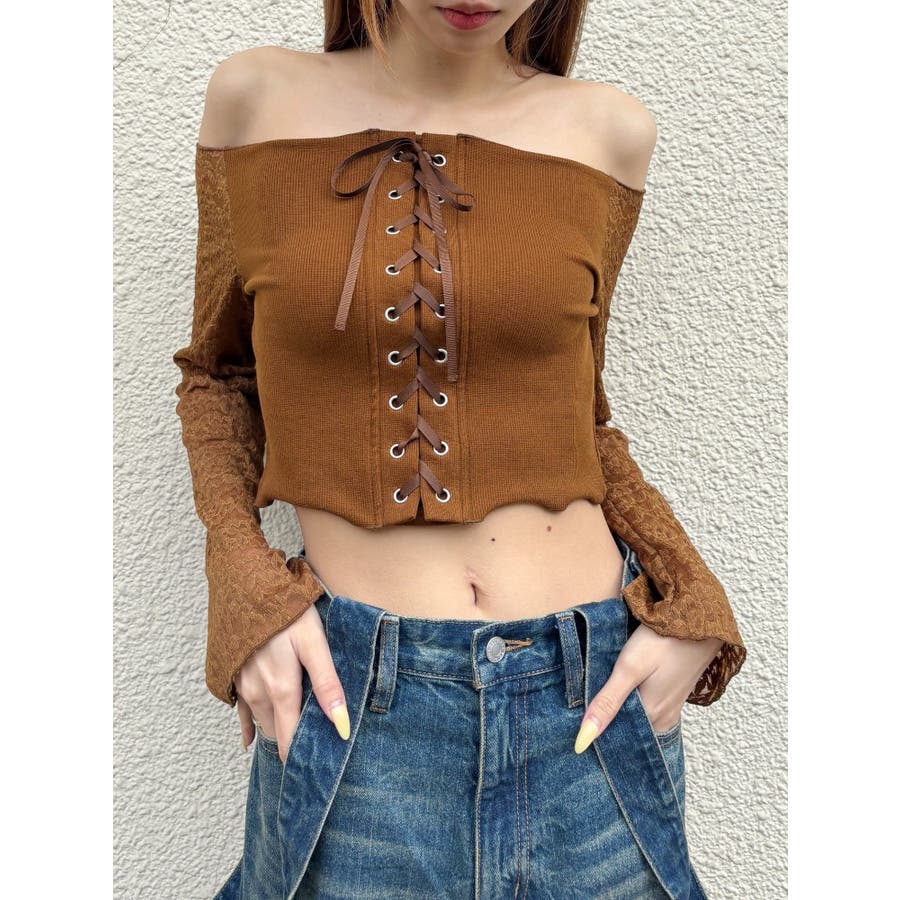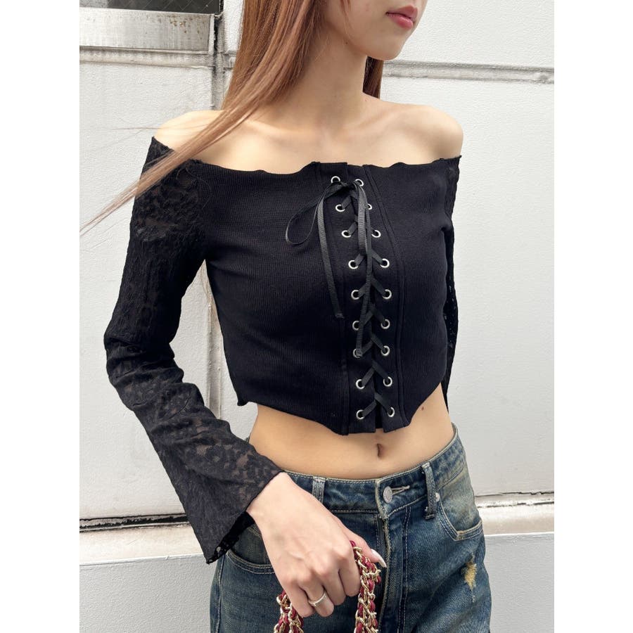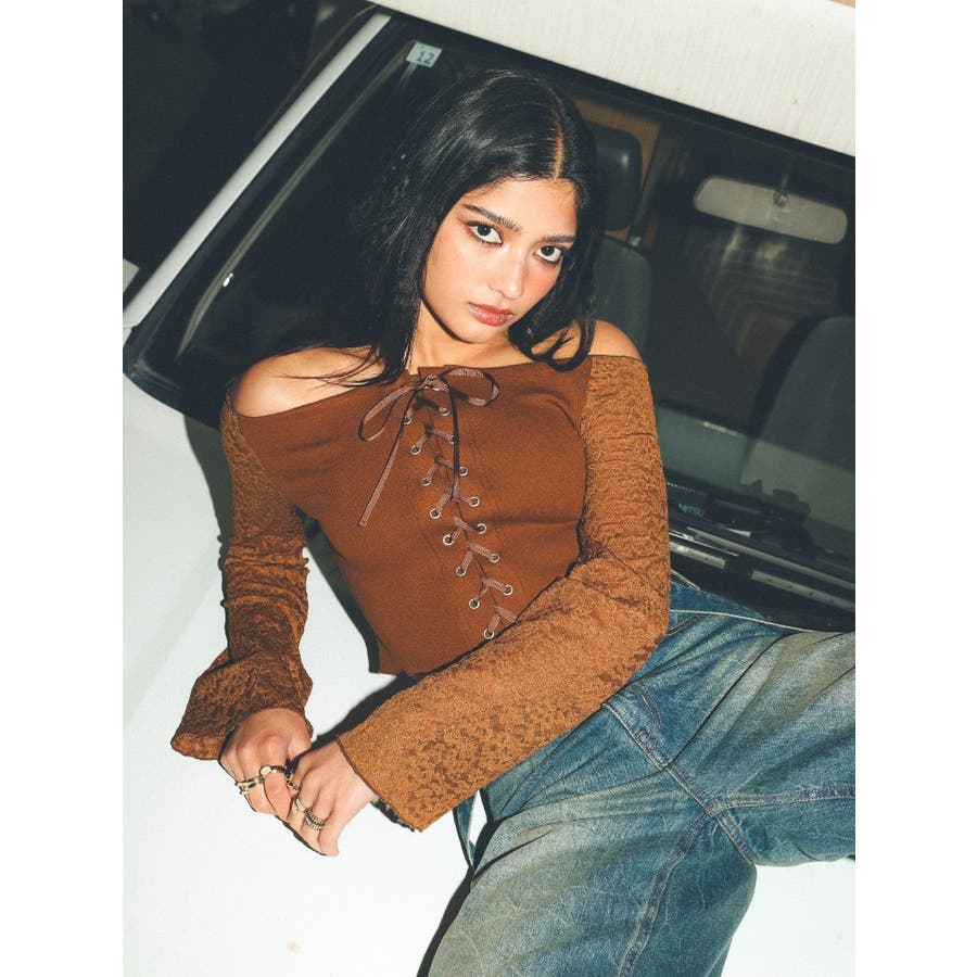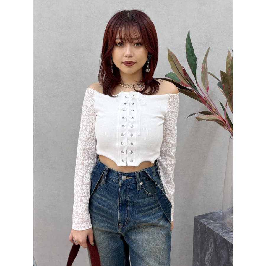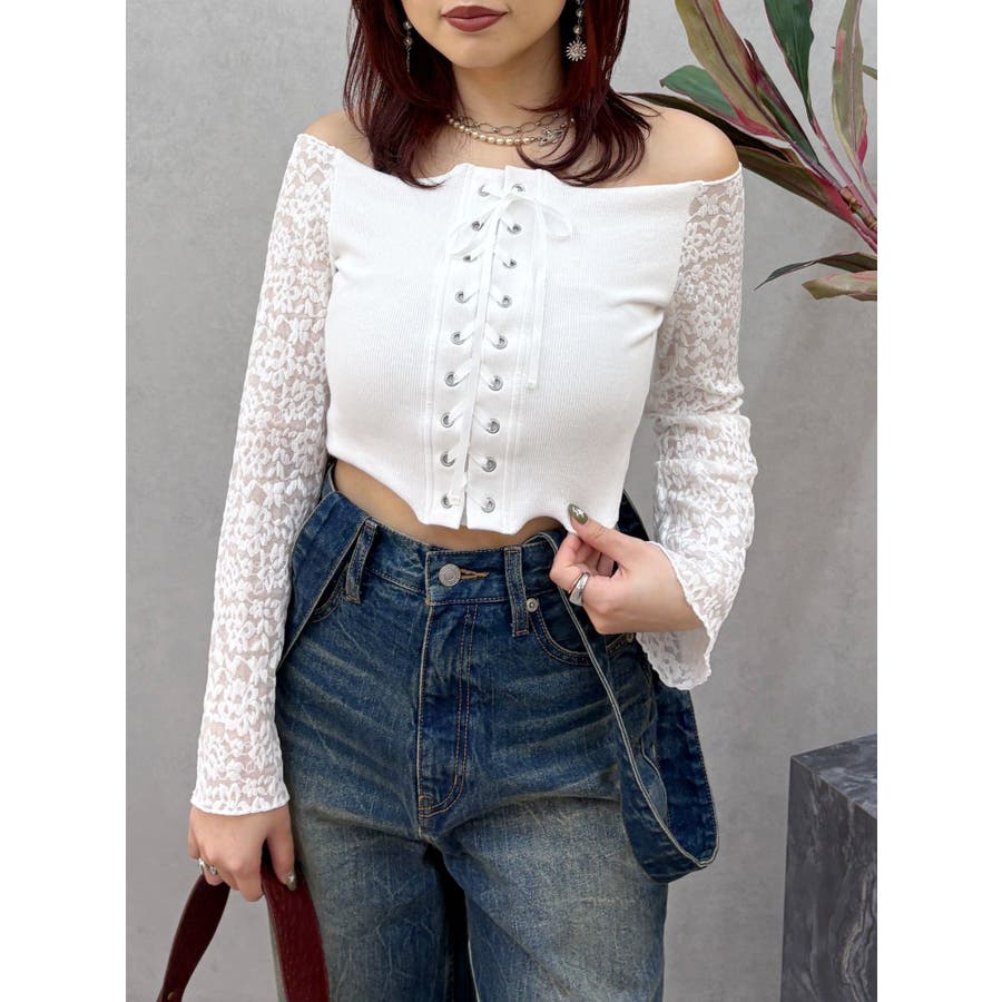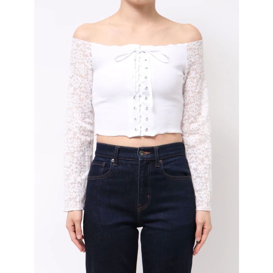 ■デザイントレンドのBOHOスタイルをかなえるレースコンビのオフショルトップスです。フロントのレースアップデザインは女性らしい印象。袖のレースも透け感が強くないものを使用しており、露出が高くなりすぎず、デイリーにも着用しやすいアイテムです。■スタイリングカジュアルな印象をプラスする>>2WAYサロペットワイドデニムパンツとの合わせが今季イチオシです。-------------- 透け感:一部あり裏地:なし 生地の厚み:普通伸縮性:あり--------------