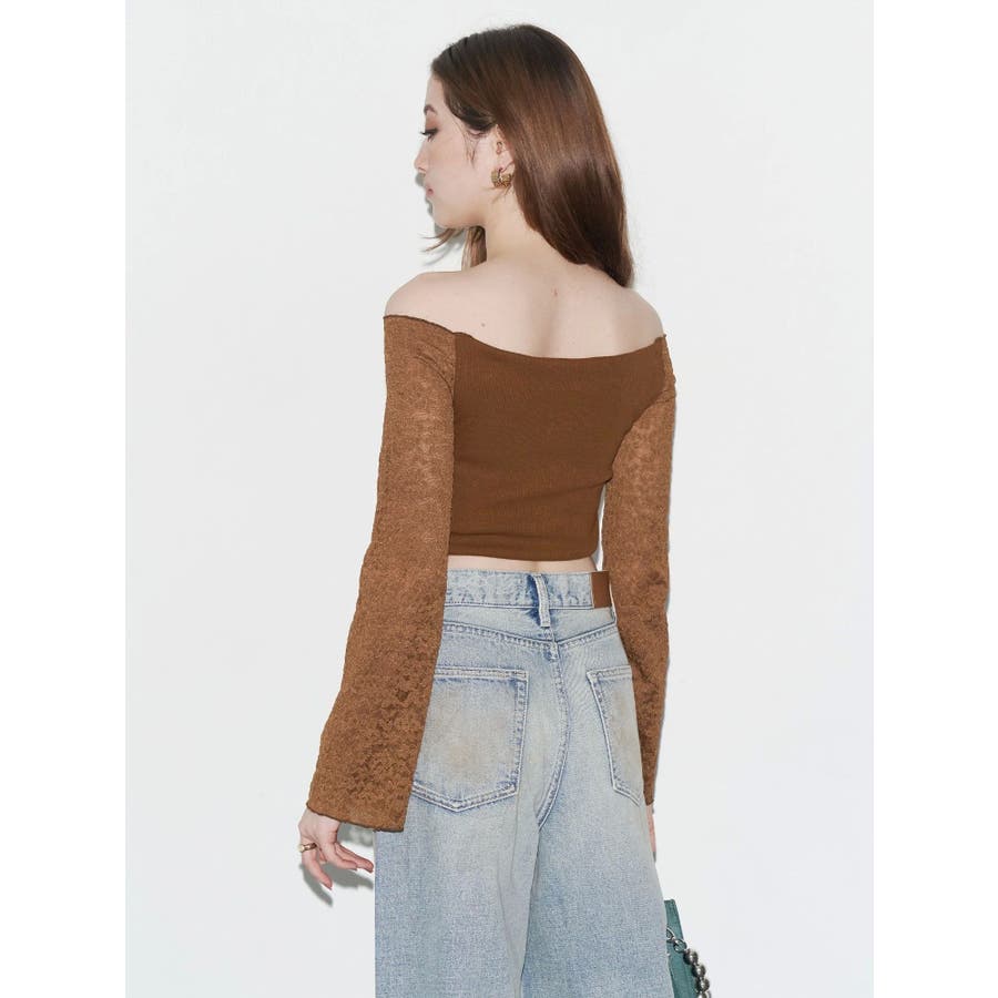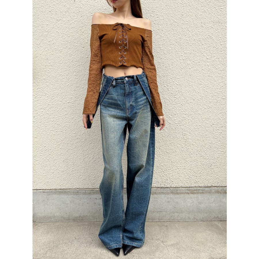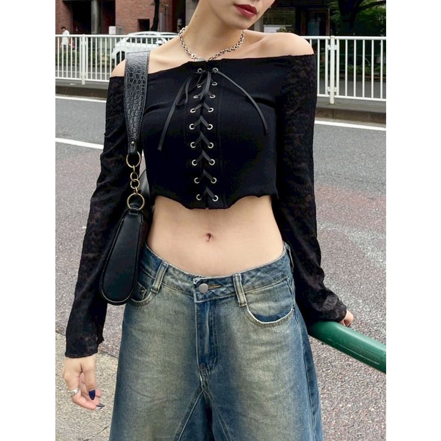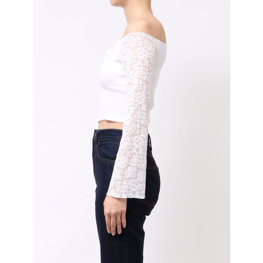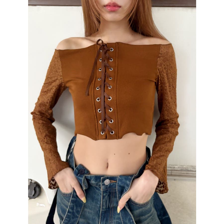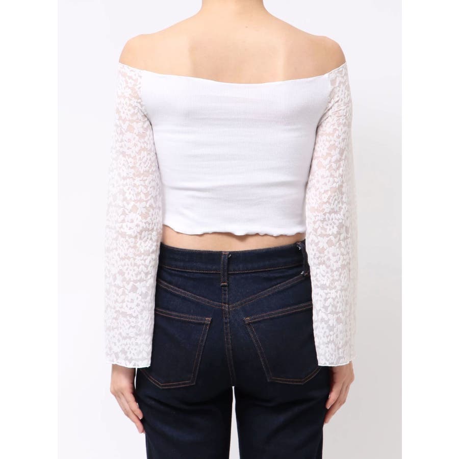 ■デザイントレンドのBOHOスタイルをかなえるレースコンビのオフショルトップスです。フロントのレースアップデザインは女性らしい印象。袖のレースも透け感が強くないものを使用しており、露出が高くなりすぎず、デイリーにも着用しやすいアイテムです。■スタイリングカジュアルな印象をプラスする>>2WAYサロペットワイドデニムパンツとの合わせが今季イチオシです。-------------- 透け感:一部あり裏地:なし 生地の厚み:普通伸縮性:あり--------------