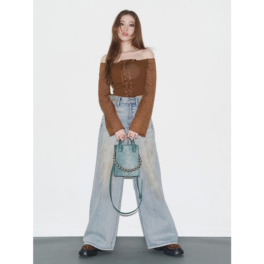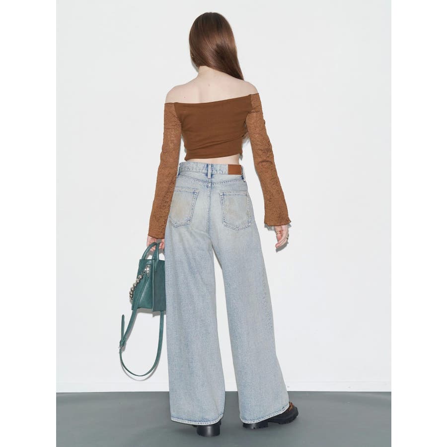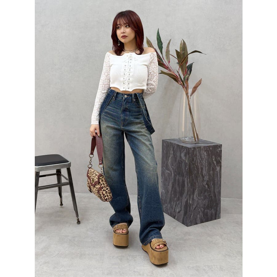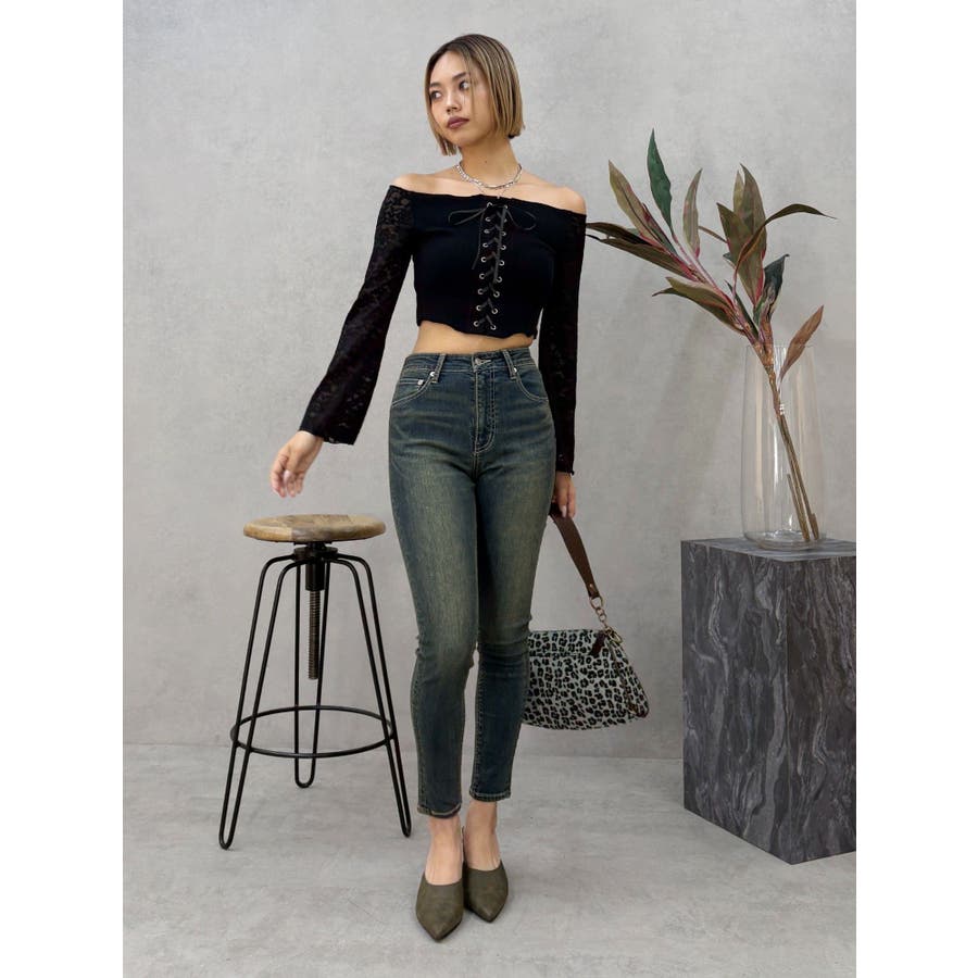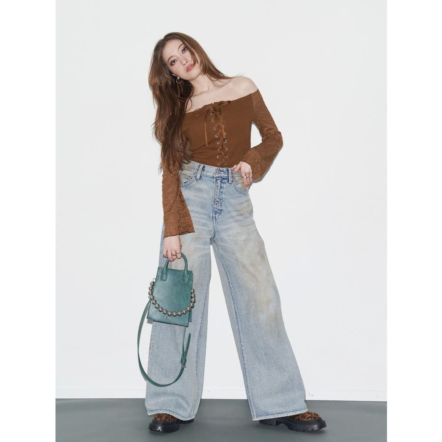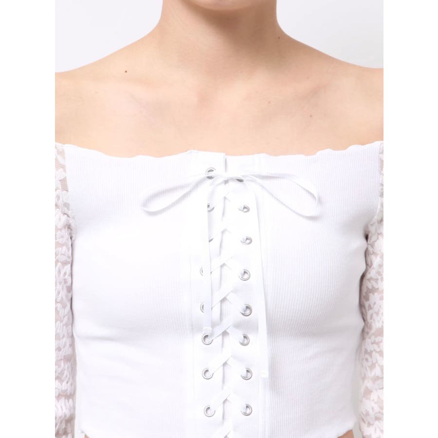 ■デザイントレンドのBOHOスタイルをかなえるレースコンビのオフショルトップスです。フロントのレースアップデザインは女性らしい印象。袖のレースも透け感が強くないものを使用しており、露出が高くなりすぎず、デイリーにも着用しやすいアイテムです。■スタイリングカジュアルな印象をプラスする>>2WAYサロペットワイドデニムパンツとの合わせが今季イチオシです。-------------- 透け感:一部あり裏地:なし 生地の厚み:普通伸縮性:あり--------------