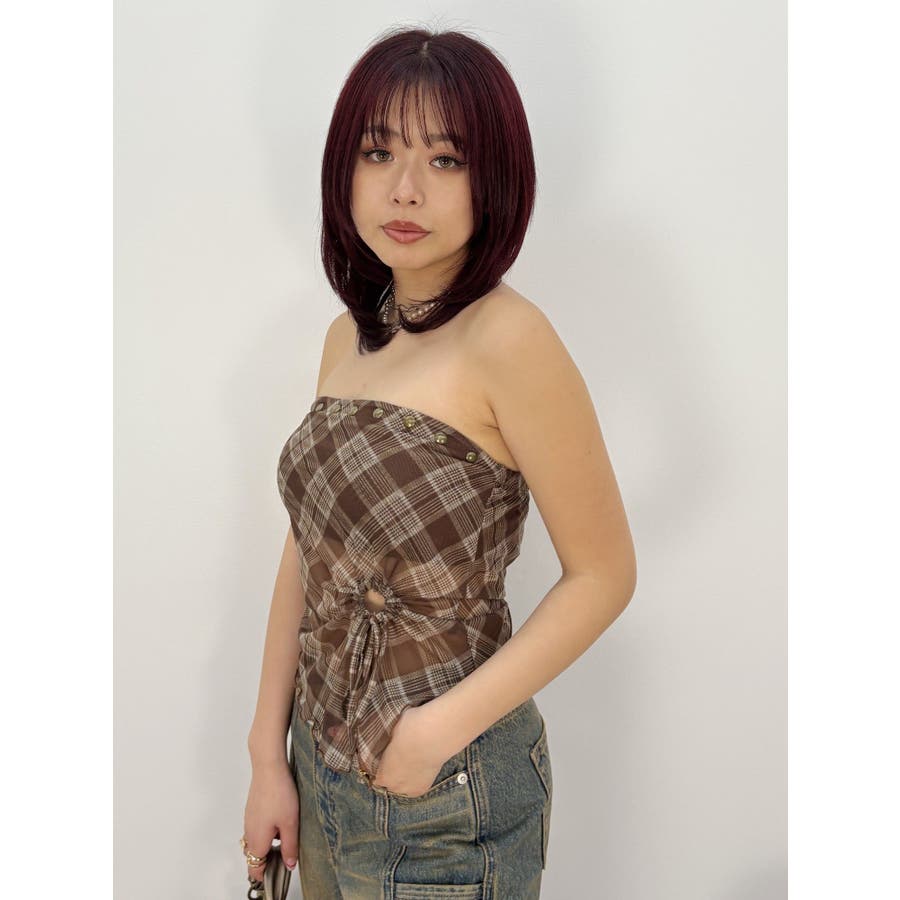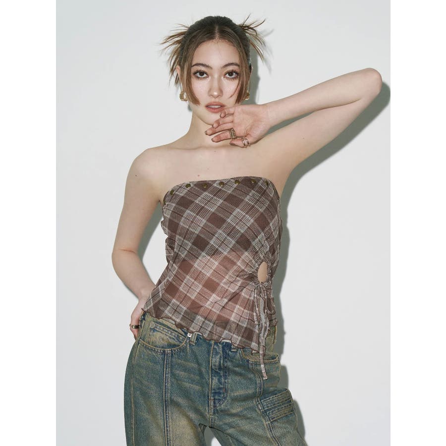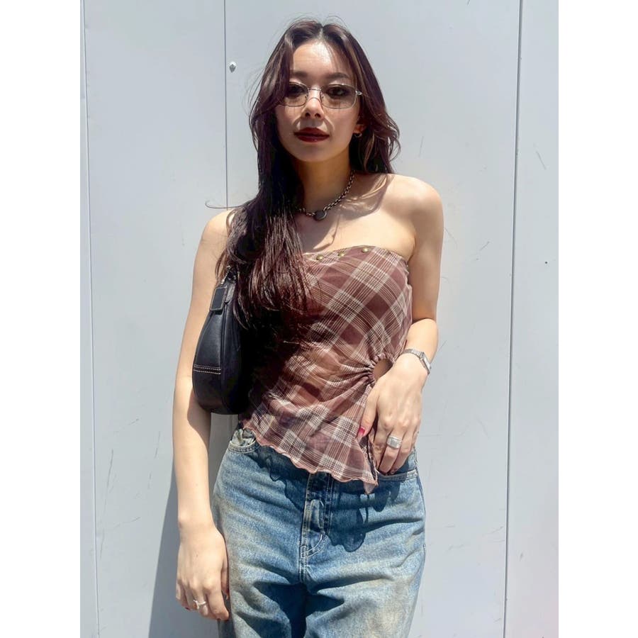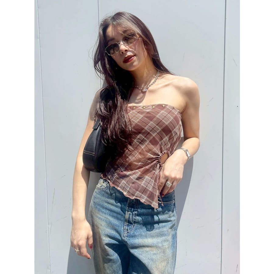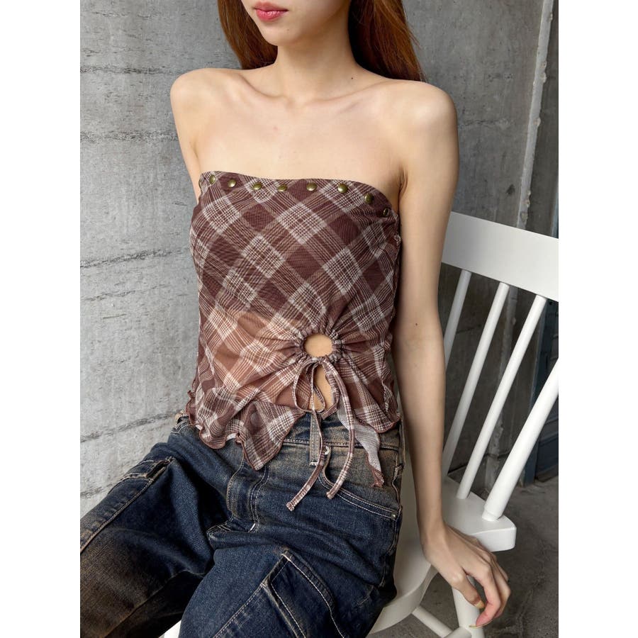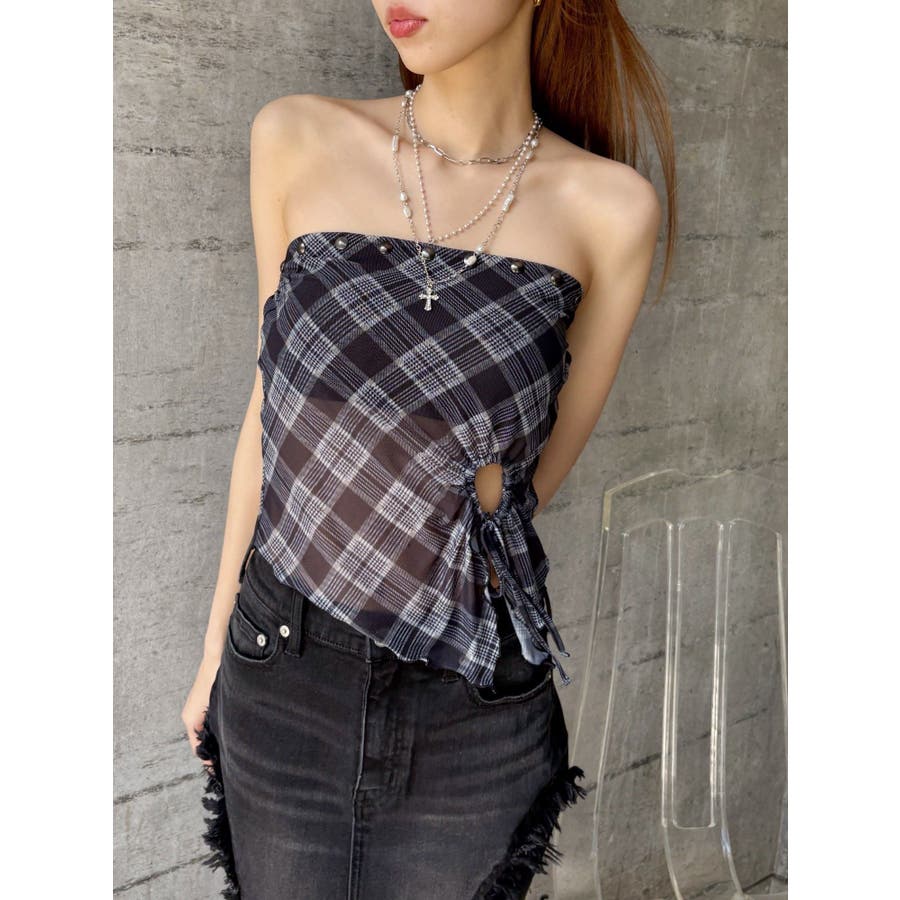 ■デザイントレンドのチェック柄生地を使用したベアトップです。ポイントであしらったスタッズがより今年らしい印象に。パッド付きで、下着を気にせず着用できるのも嬉しいポイント。伸縮性のあるメッシュ生地を使用しているためフィット感があり、着心地も◎裾はアシンメトリーデザインになっており、ドロストで程よい肌見せスタイルが楽しめます。■スタイリグコンパクトなシルエットのためワイドデニムとの相性抜群です。フレアパンツや、マーメイドスカートなども◎ボリューム感のあるボトムと合わせるのがおすすめです。-------------- 透け感:なし 裏地:あり生地の厚み:普通伸縮性:なし --------------