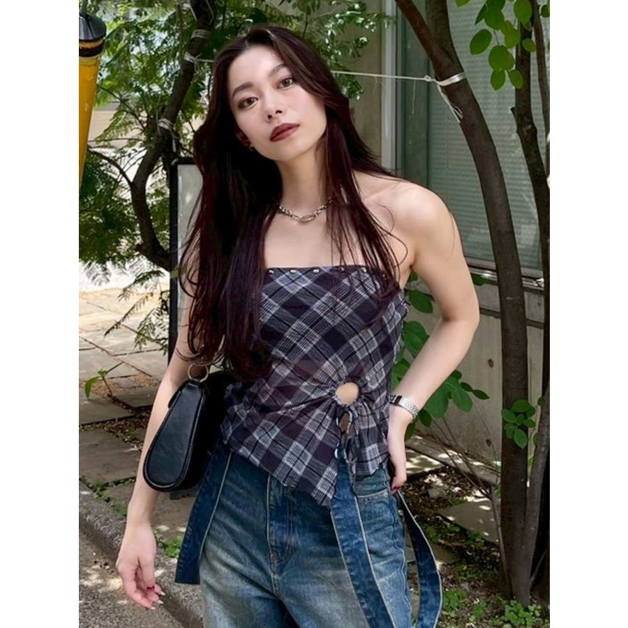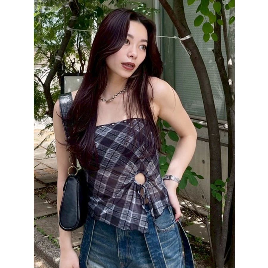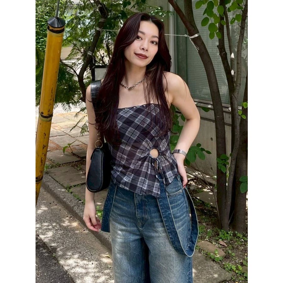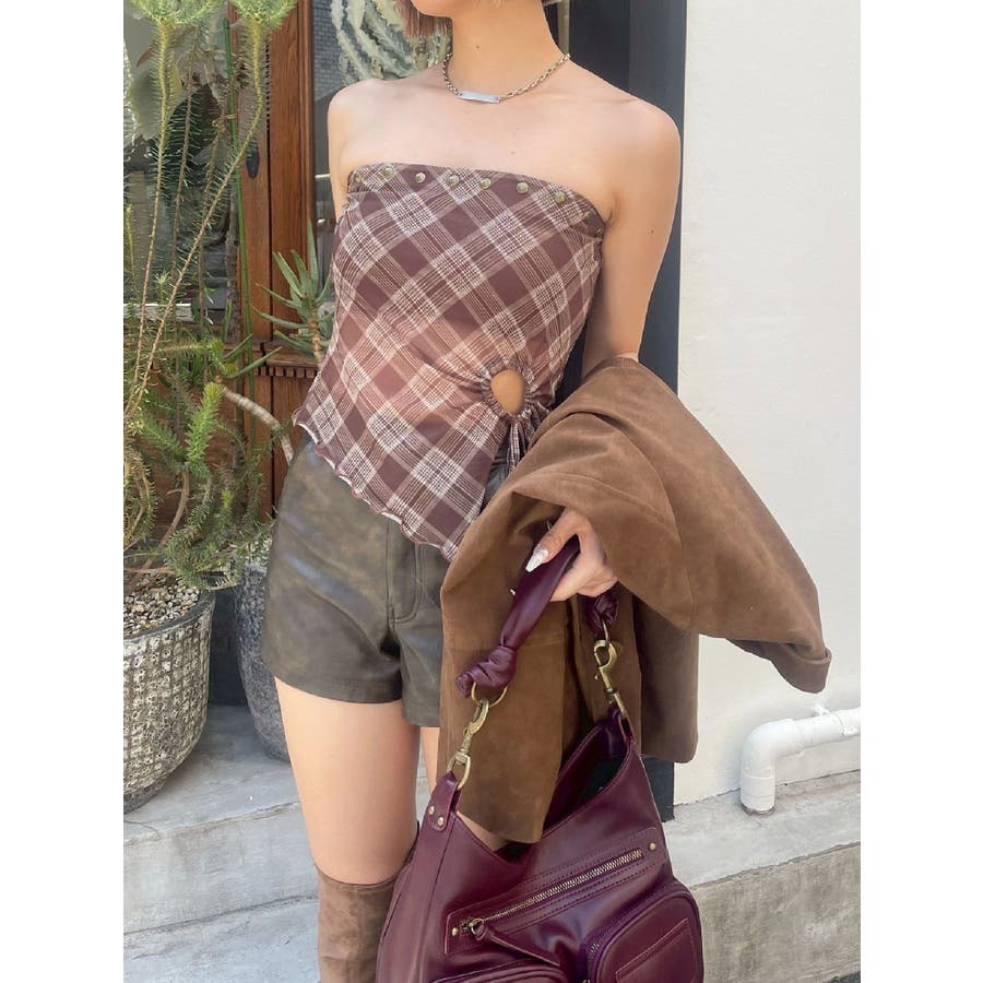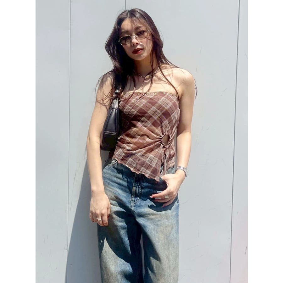 ■デザイントレンドのチェック柄生地を使用したベアトップです。ポイントであしらったスタッズがより今年らしい印象に。パッド付きで、下着を気にせず着用できるのも嬉しいポイント。伸縮性のあるメッシュ生地を使用しているためフィット感があり、着心地も◎裾はアシンメトリーデザインになっており、ドロストで程よい肌見せスタイルが楽しめます。■スタイリグコンパクトなシルエットのためワイドデニムとの相性抜群です。フレアパンツや、マーメイドスカートなども◎ボリューム感のあるボトムと合わせるのがおすすめです。-------------- 透け感:なし 裏地:あり生地の厚み:普通伸縮性:なし --------------