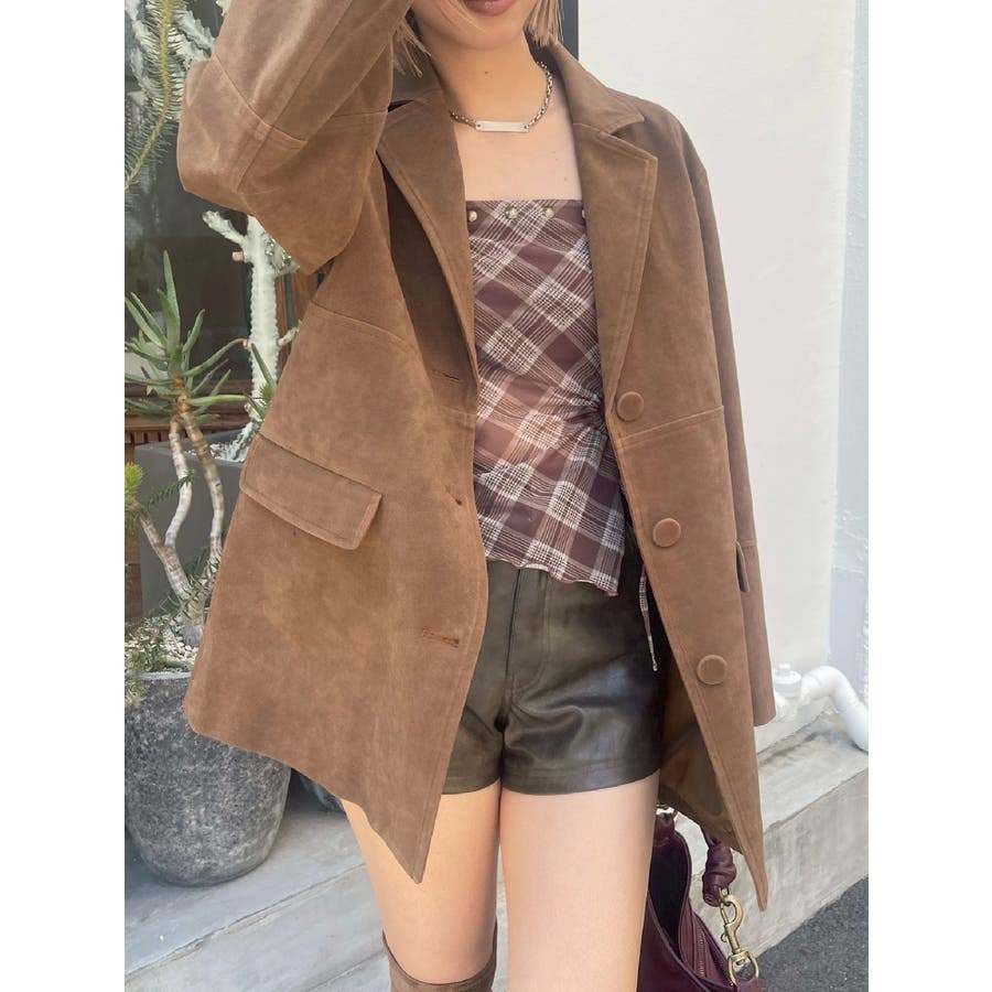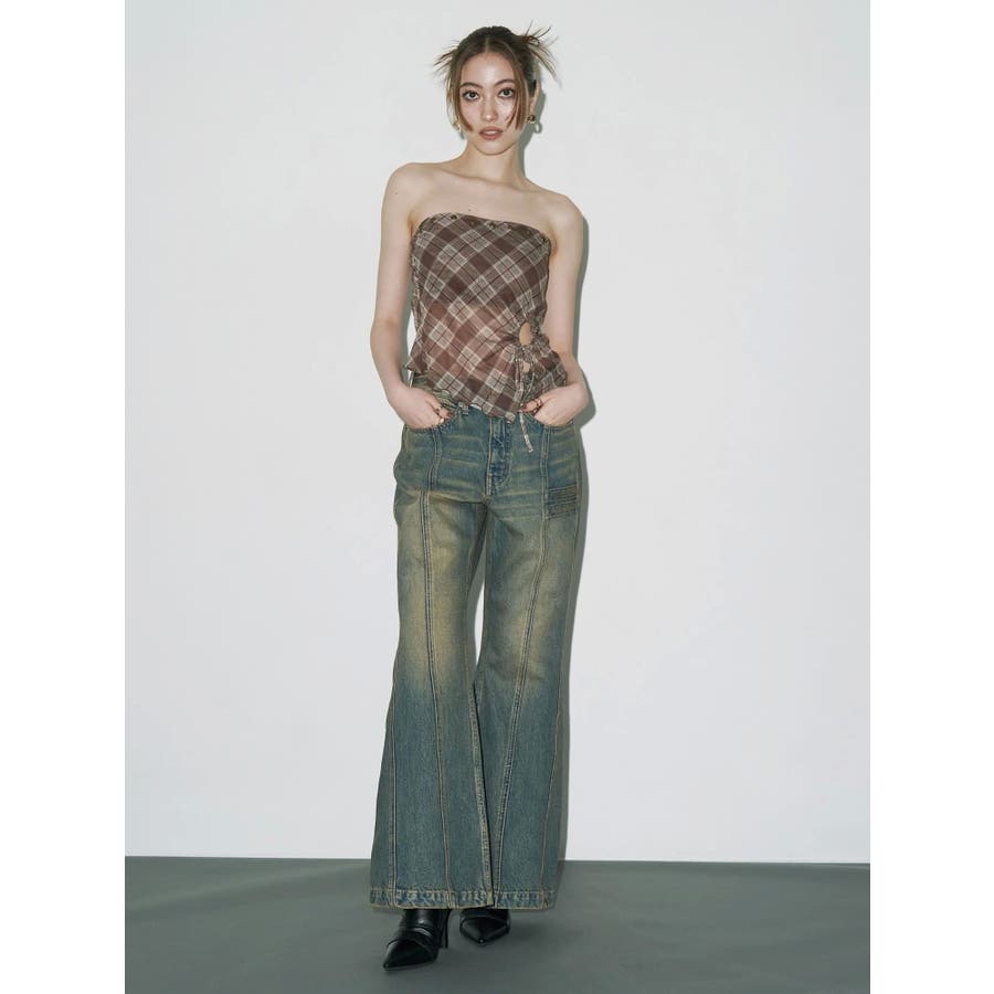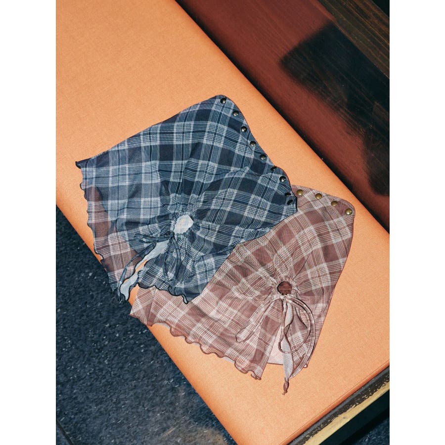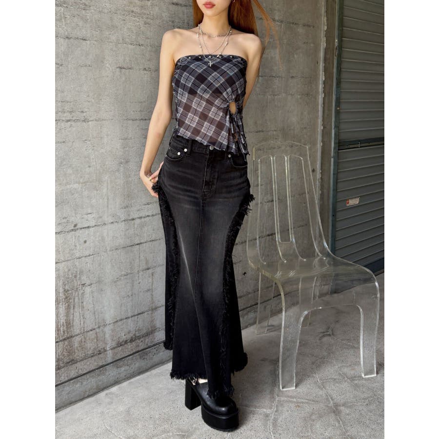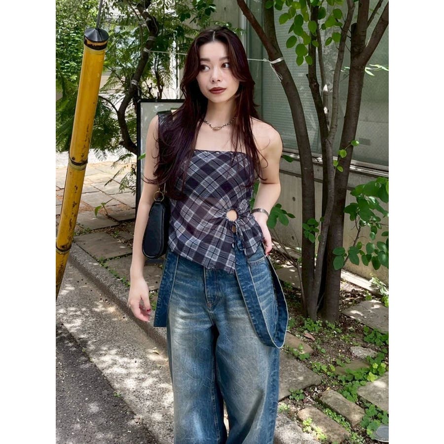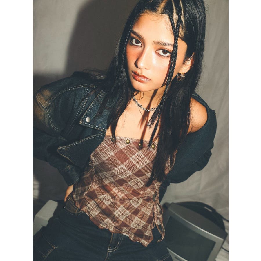 ■デザイントレンドのチェック柄生地を使用したベアトップです。ポイントであしらったスタッズがより今年らしい印象に。パッド付きで、下着を気にせず着用できるのも嬉しいポイント。伸縮性のあるメッシュ生地を使用しているためフィット感があり、着心地も◎裾はアシンメトリーデザインになっており、ドロストで程よい肌見せスタイルが楽しめます。■スタイリグコンパクトなシルエットのためワイドデニムとの相性抜群です。フレアパンツや、マーメイドスカートなども◎ボリューム感のあるボトムと合わせるのがおすすめです。-------------- 透け感:なし 裏地:あり生地の厚み:普通伸縮性:なし --------------