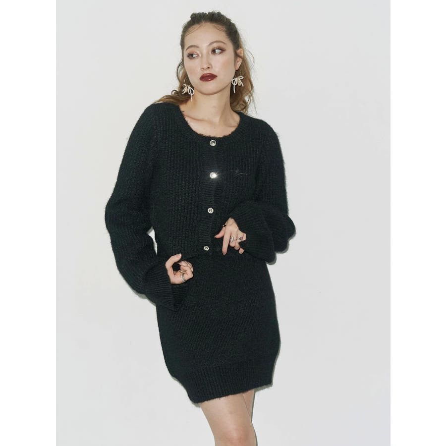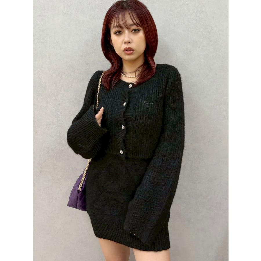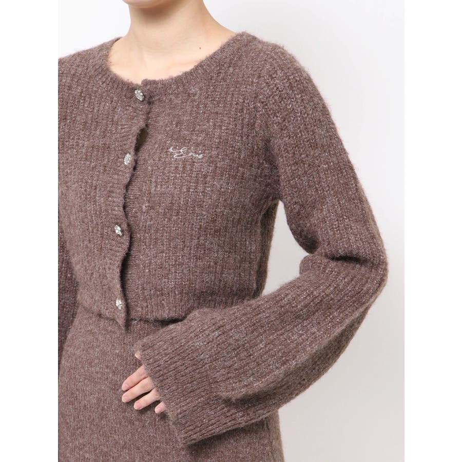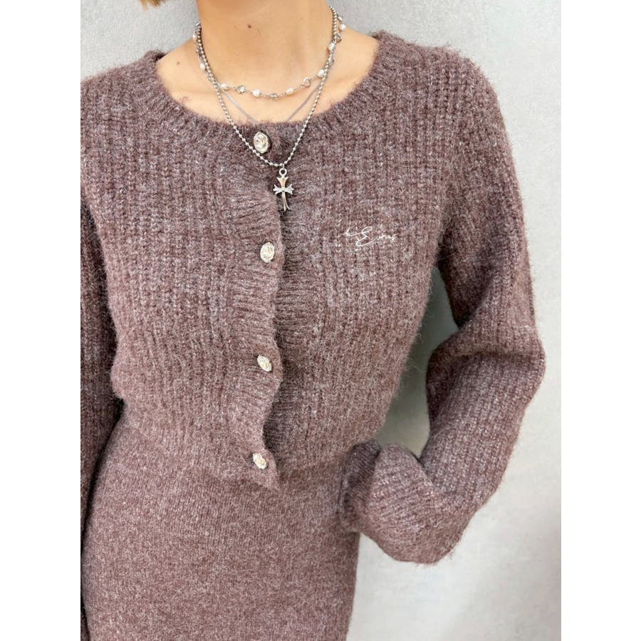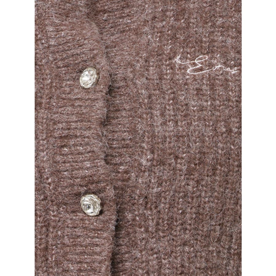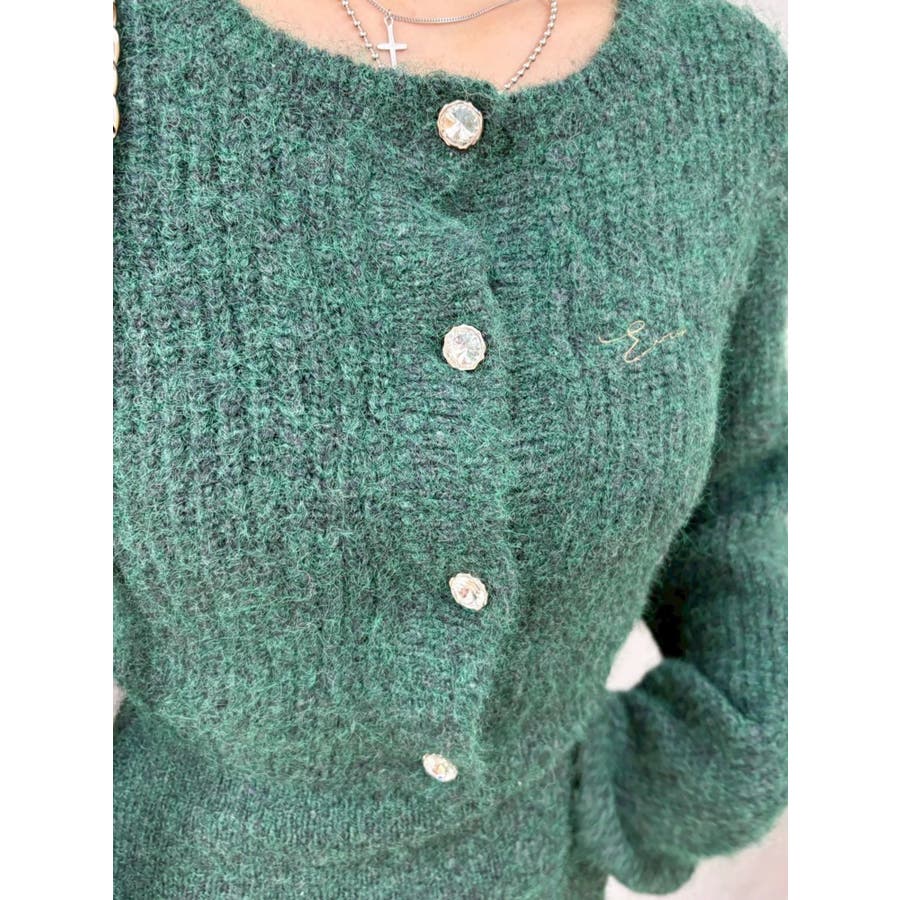 左胸には刺繍でEVRIS(エヴリス)のロゴを、カーディガンのボタンはキラキラ輝くビジューボタンになっています。