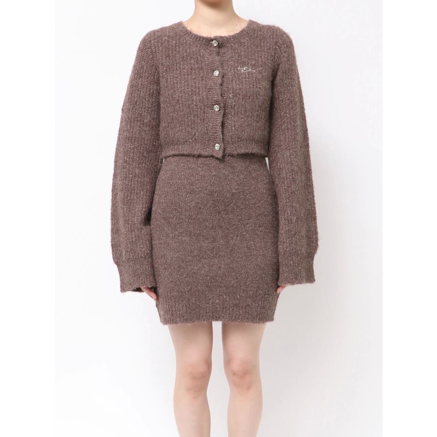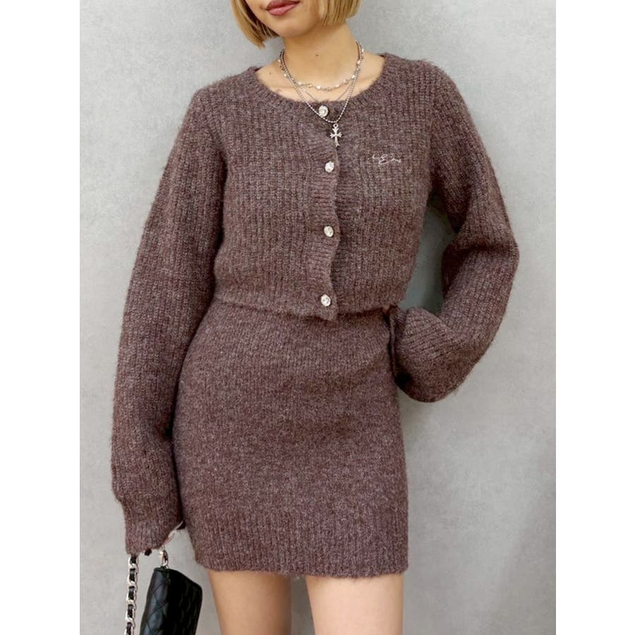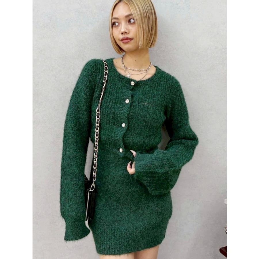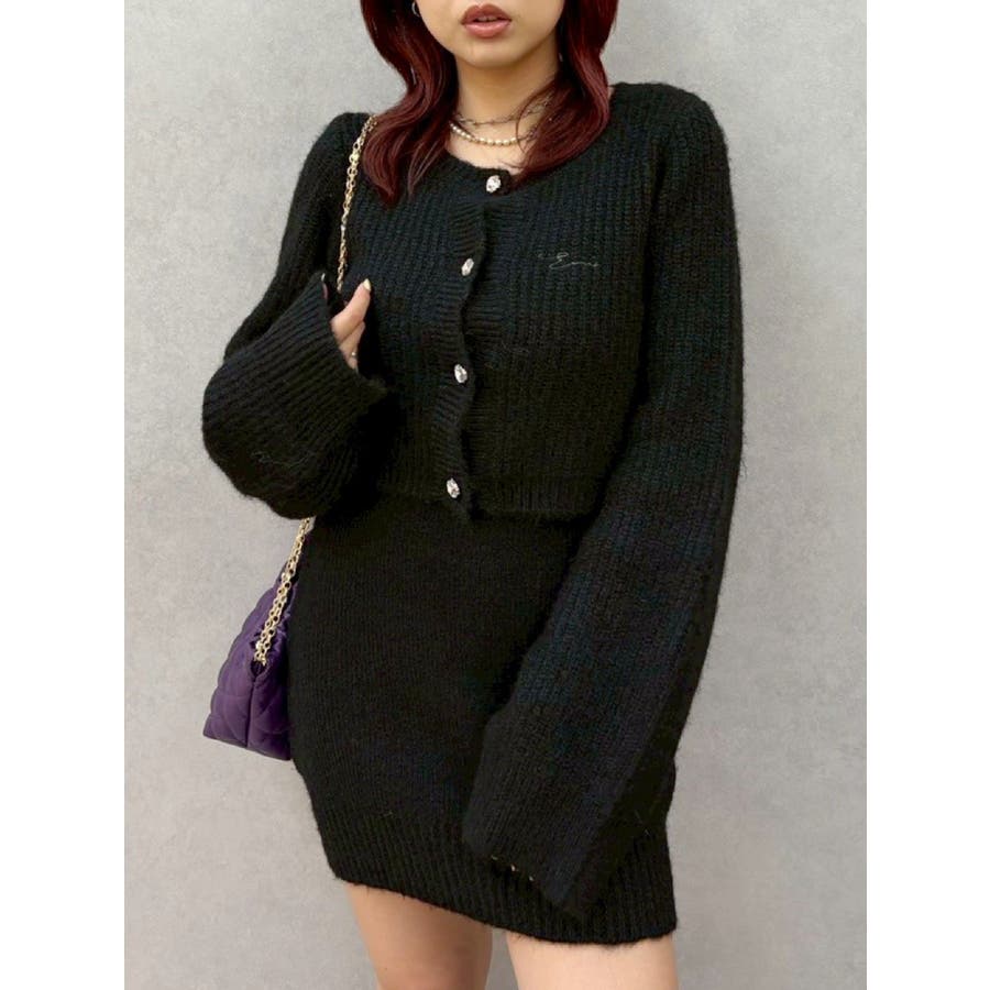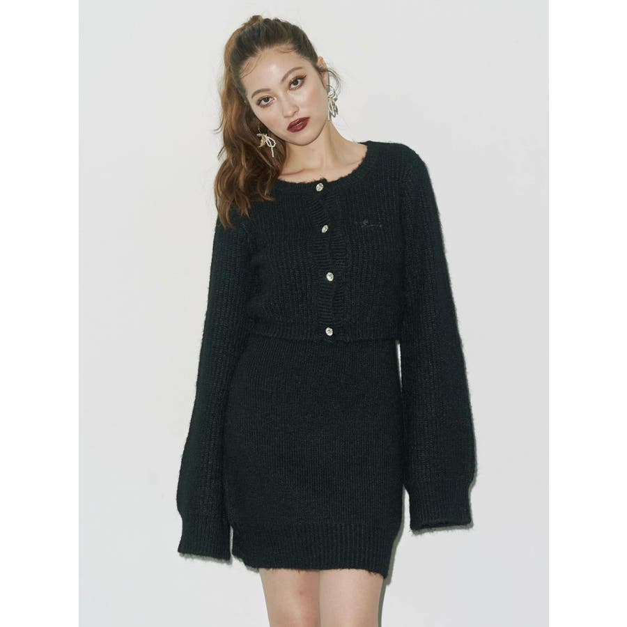 左胸には刺繍でEVRIS(エヴリス)のロゴを、カーディガンのボタンはキラキラ輝くビジューボタンになっています。
