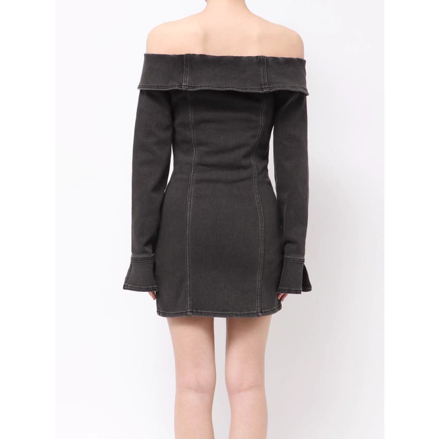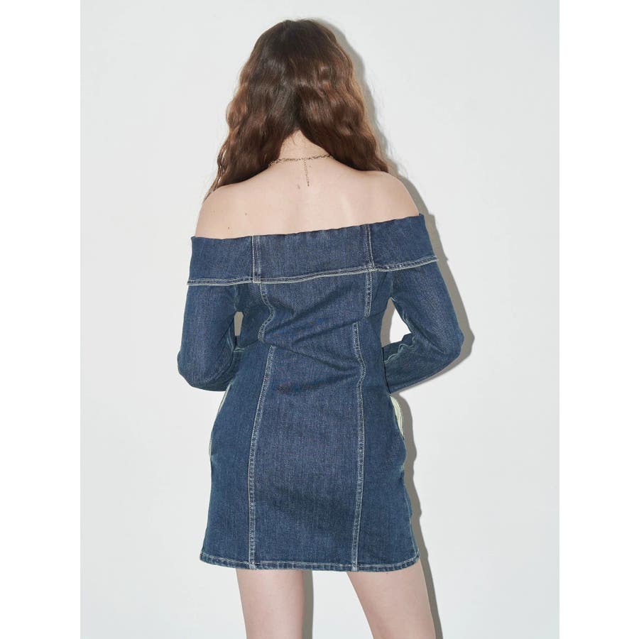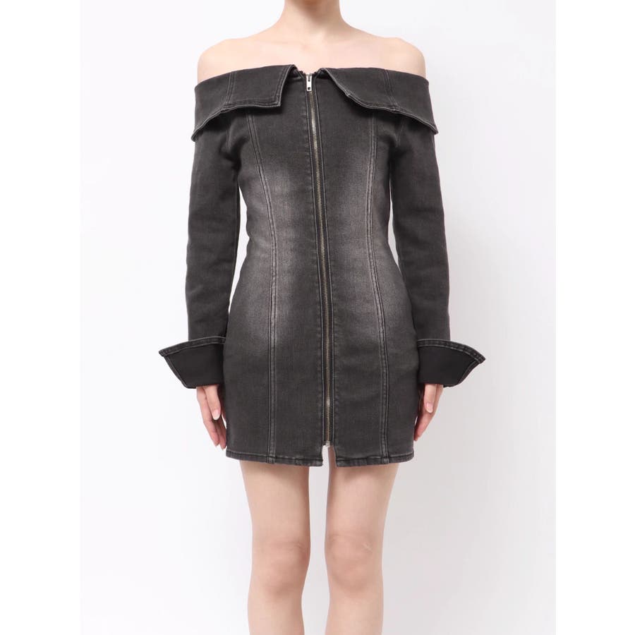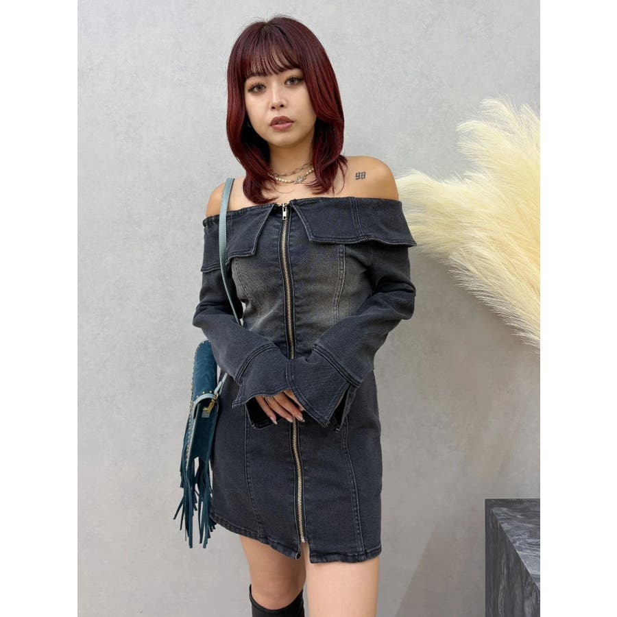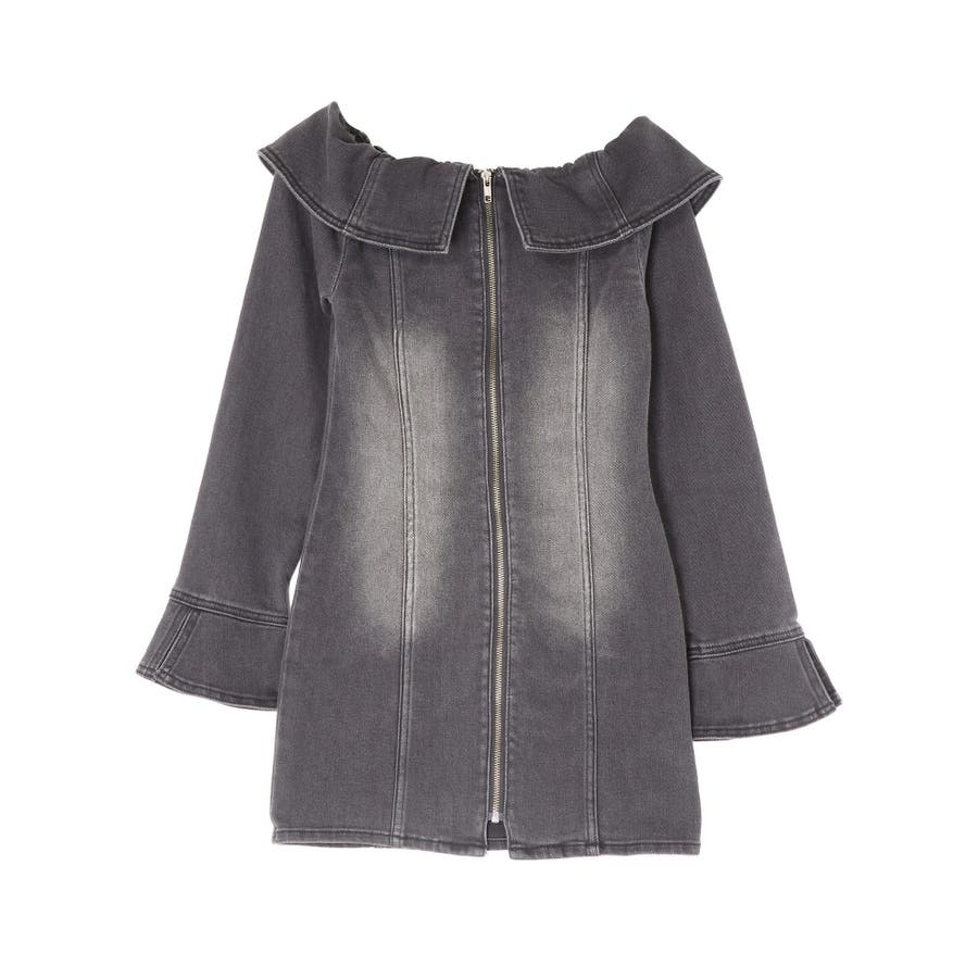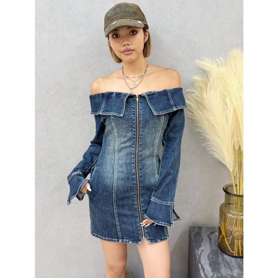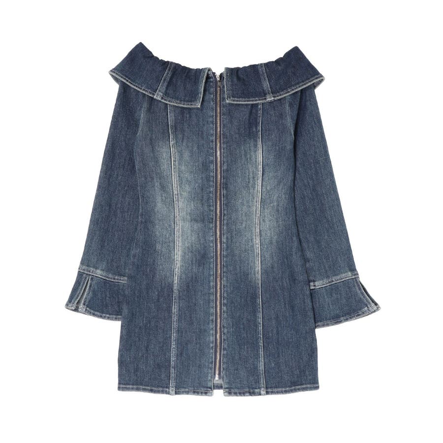 トレンドのオフショルデザインのミニワンピース。デニム素材でカジュアルながらも程よい露出で女性らしく着用できる1枚です。デコルテ部分にはゴムが入っており、フィット感があります。生地自体にもストレッチ性があるので着心地良く仕上がっています。アタリや加工もしっかり入れているので、ガーリーになりすぎずにEVRIS(エヴリス)らしく着用できます。袖のカフスはロールアップしても着用できます。※脇のポケットは無くなります。※詳細画像が正しい仕様となります。
