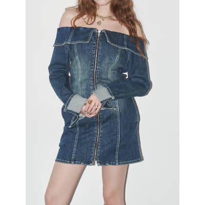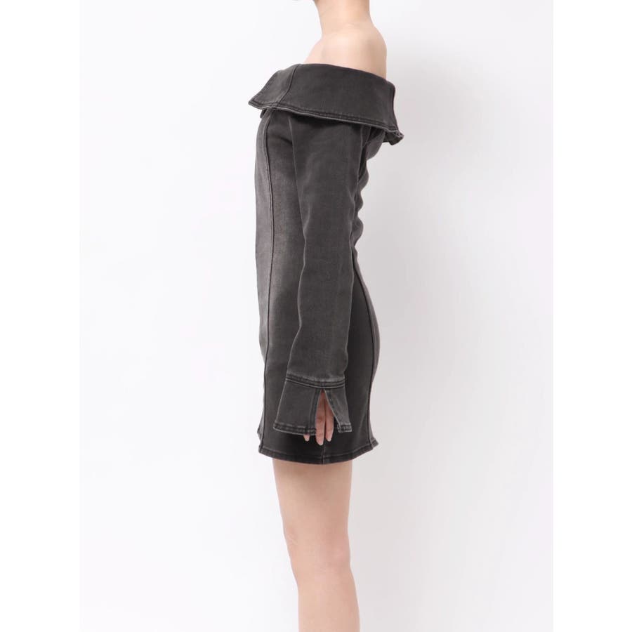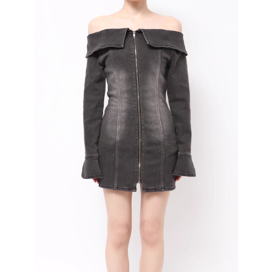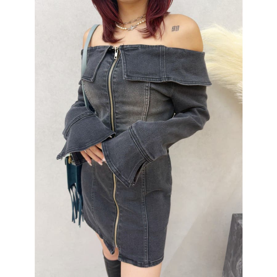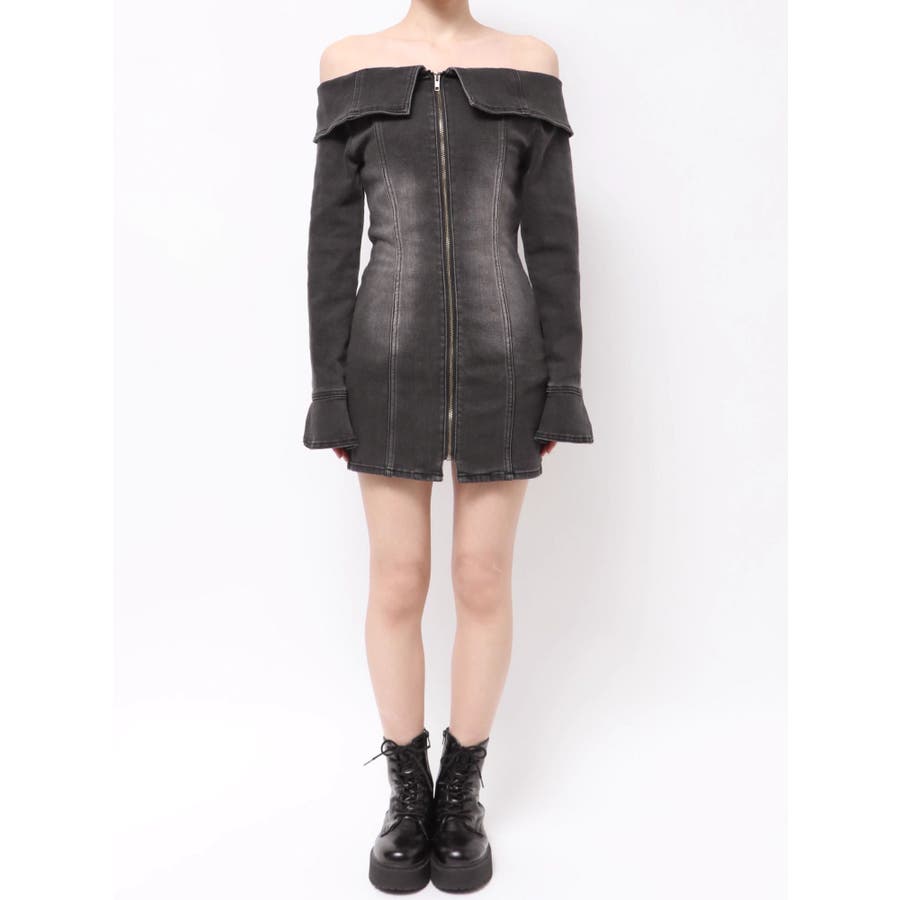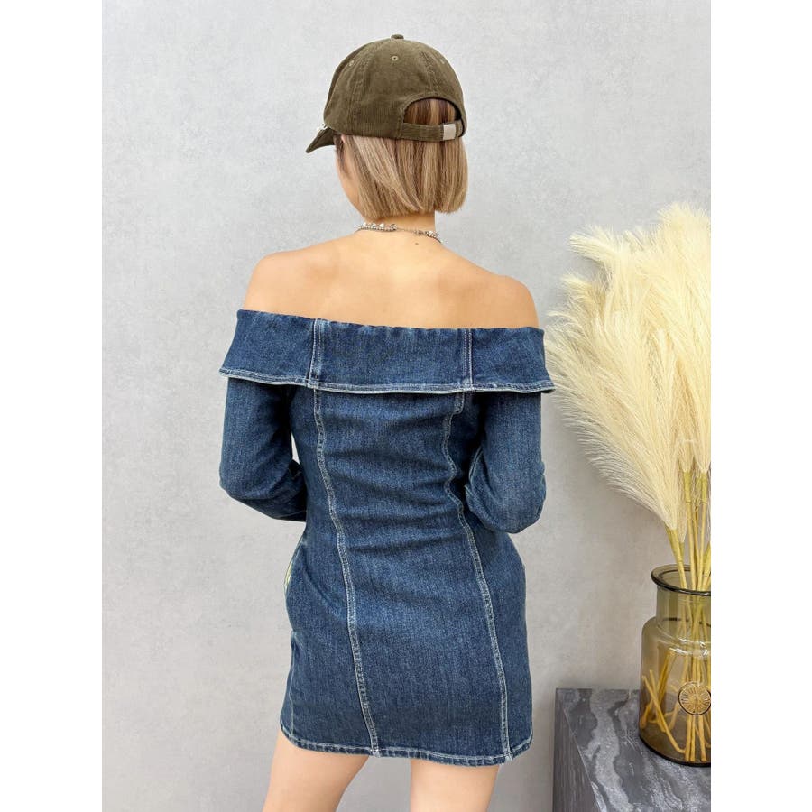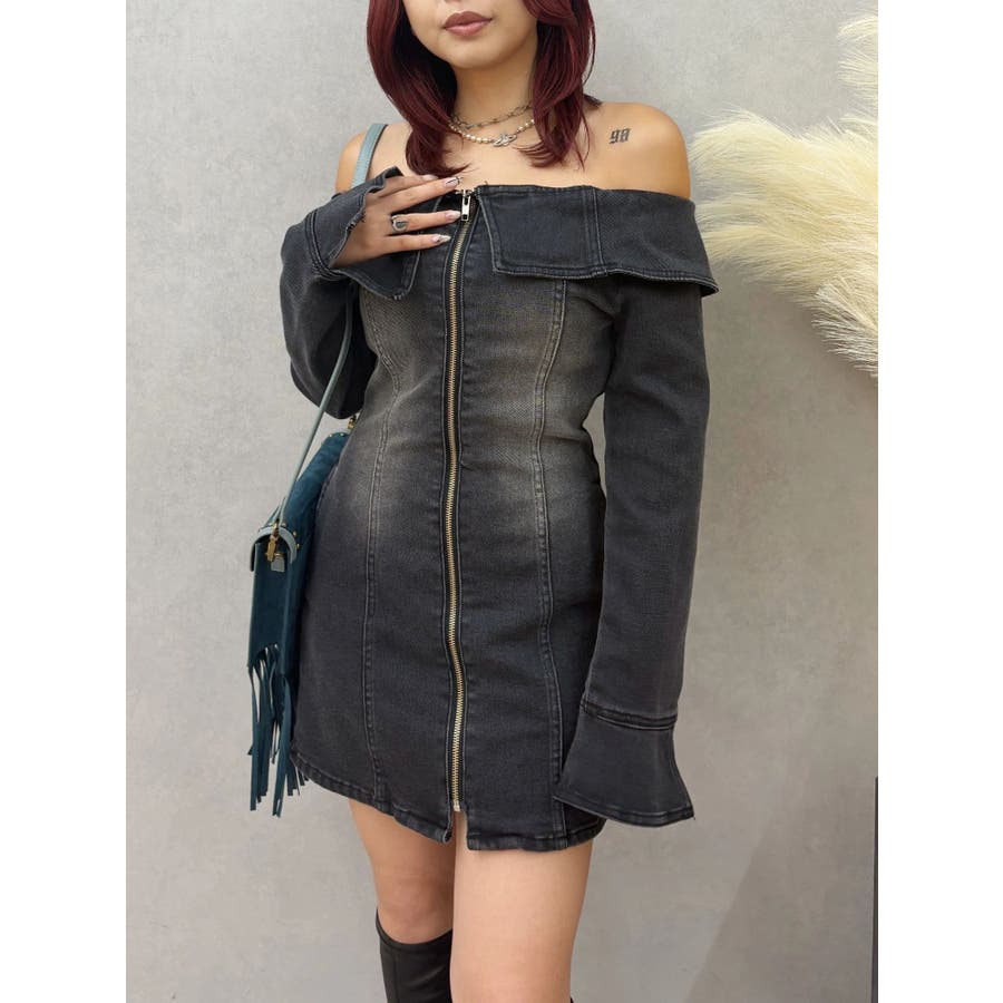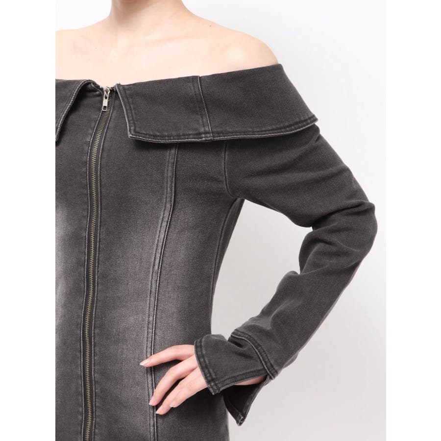 トレンドのオフショルデザインのミニワンピース。デニム素材でカジュアルながらも程よい露出で女性らしく着用できる1枚です。デコルテ部分にはゴムが入っており、フィット感があります。生地自体にもストレッチ性があるので着心地良く仕上がっています。アタリや加工もしっかり入れているので、ガーリーになりすぎずにEVRIS(エヴリス)らしく着用できます。袖のカフスはロールアップしても着用できます。※脇のポケットは無くなります。※詳細画像が正しい仕様となります。