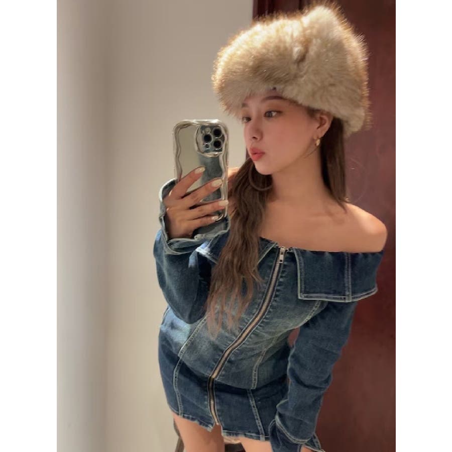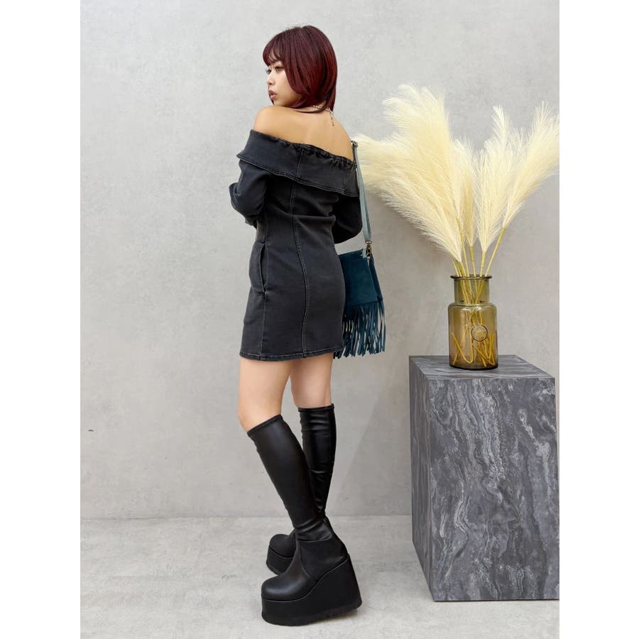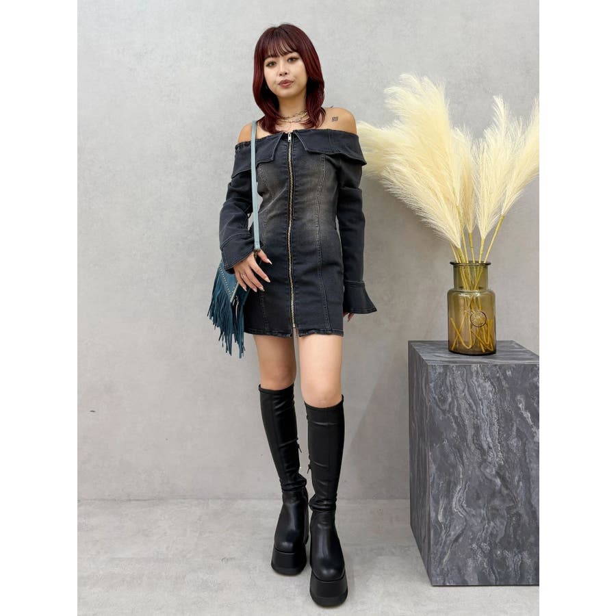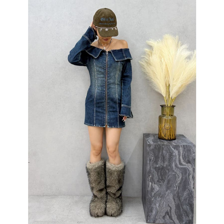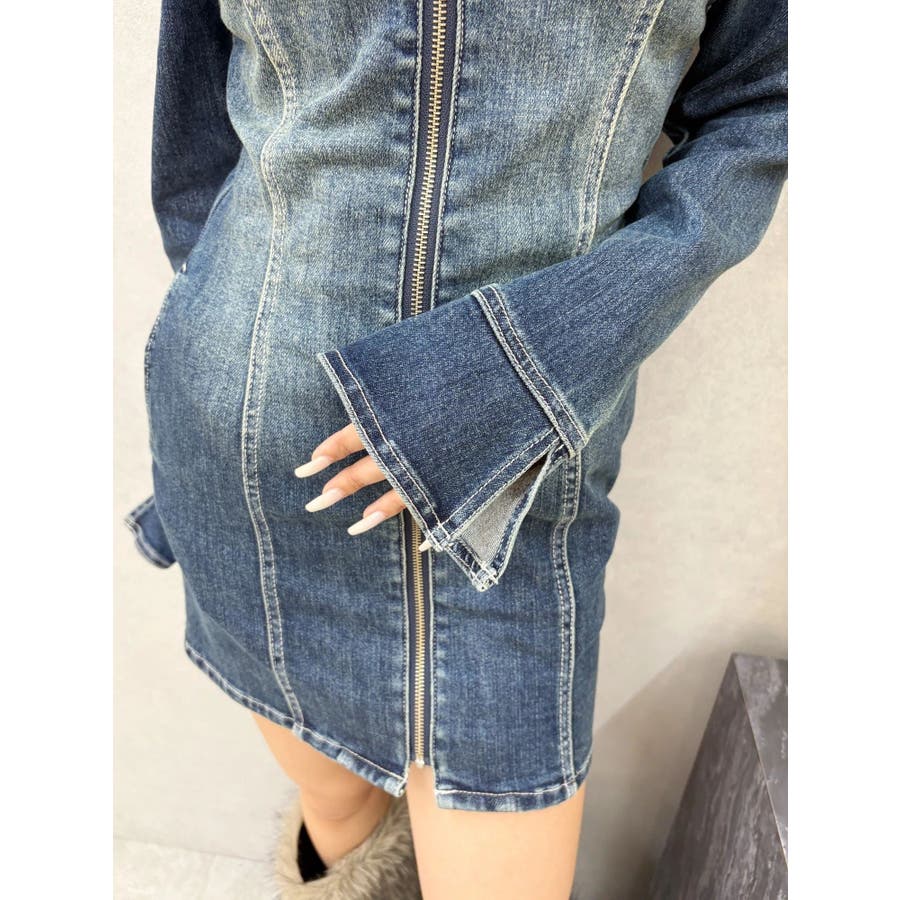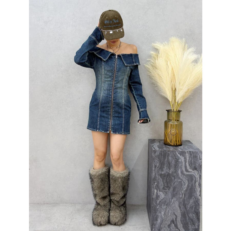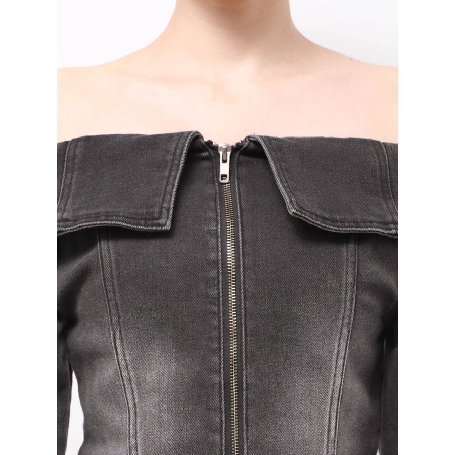 トレンドのオフショルデザインのミニワンピース。デニム素材でカジュアルながらも程よい露出で女性らしく着用できる1枚です。デコルテ部分にはゴムが入っており、フィット感があります。生地自体にもストレッチ性があるので着心地良く仕上がっています。アタリや加工もしっかり入れているので、ガーリーになりすぎずにEVRIS(エヴリス)らしく着用できます。袖のカフスはロールアップしても着用できます。※脇のポケットは無くなります。※詳細画像が正しい仕様となります。