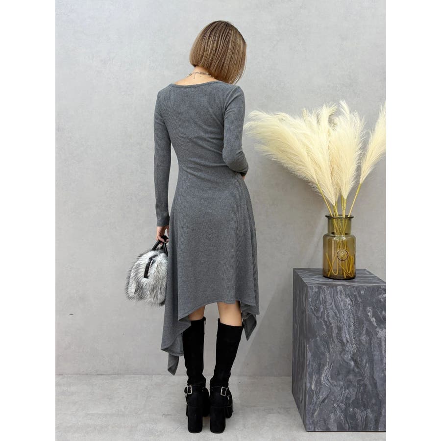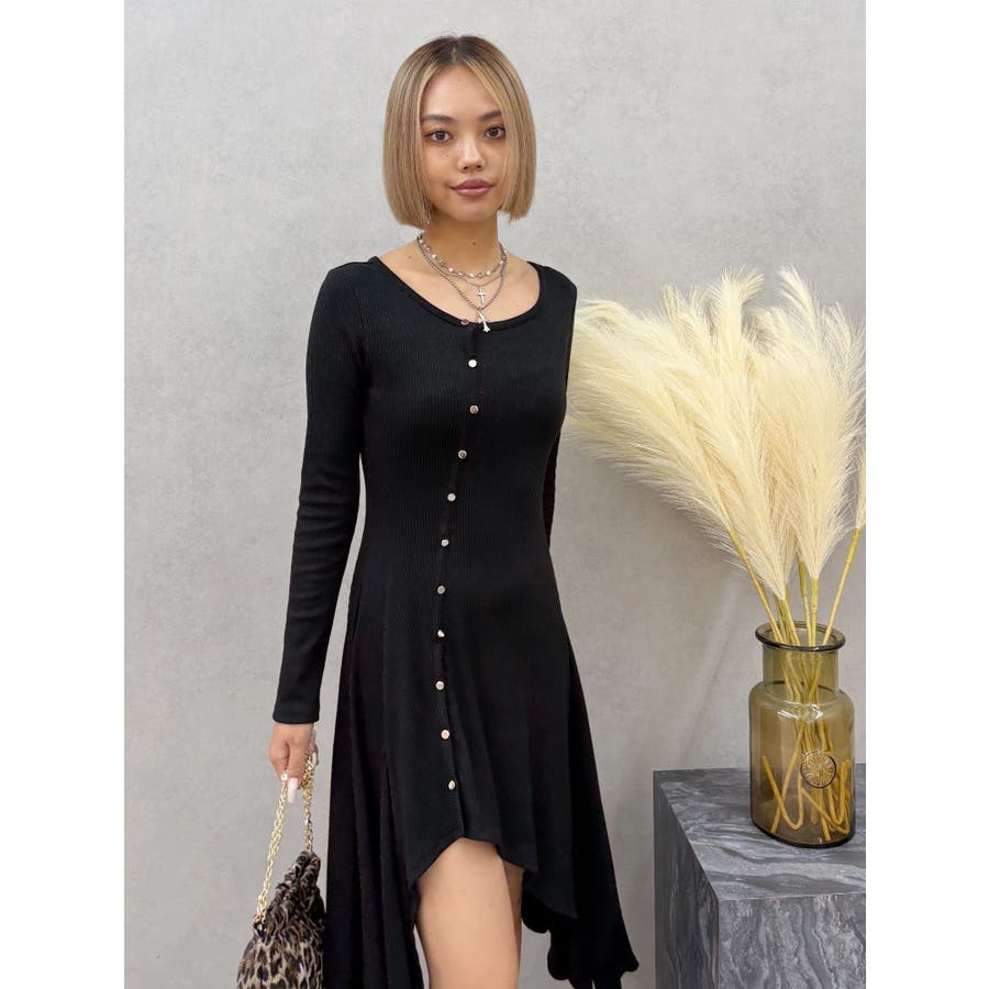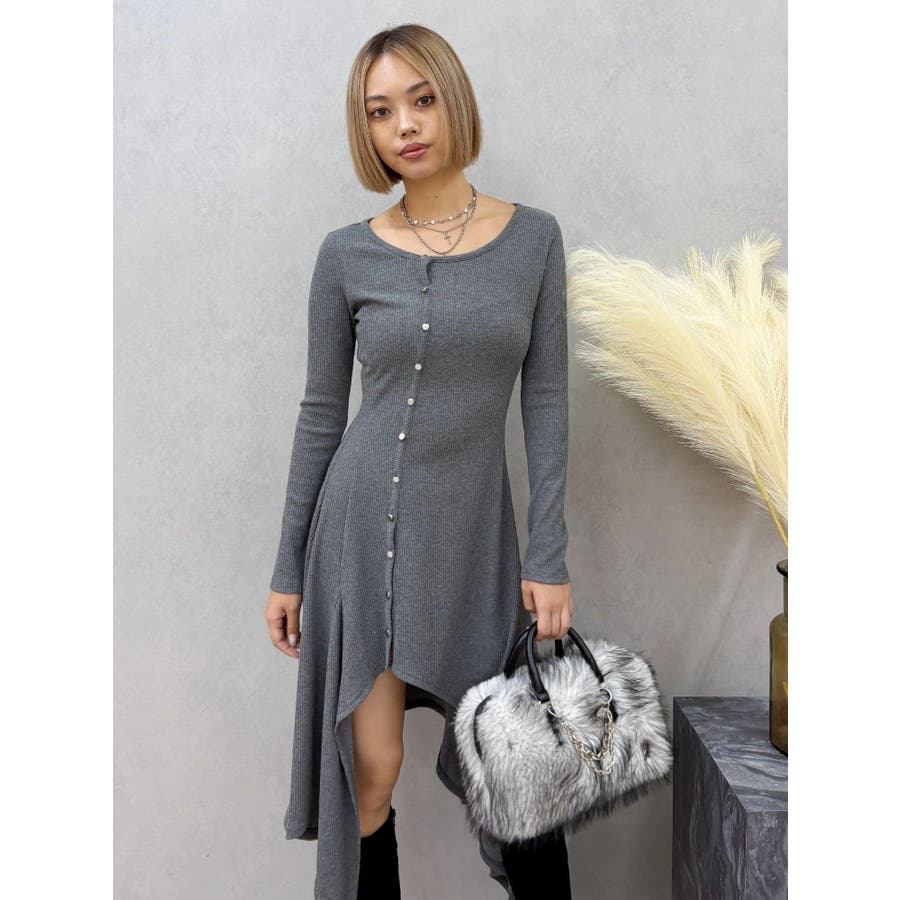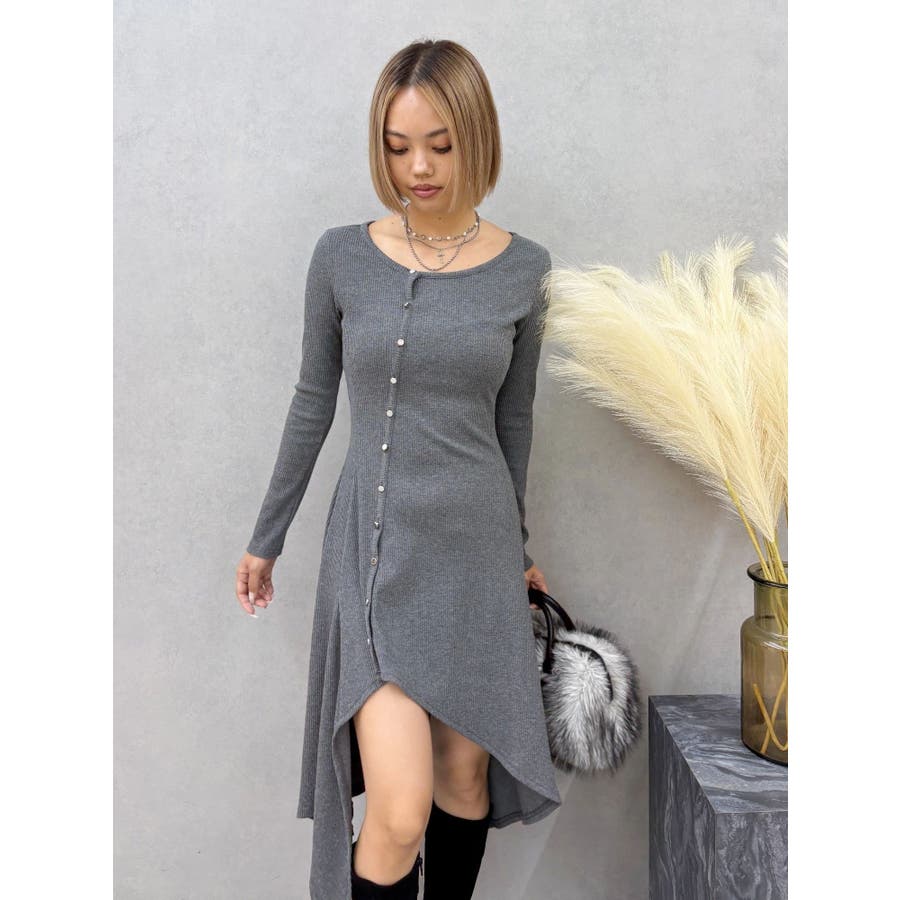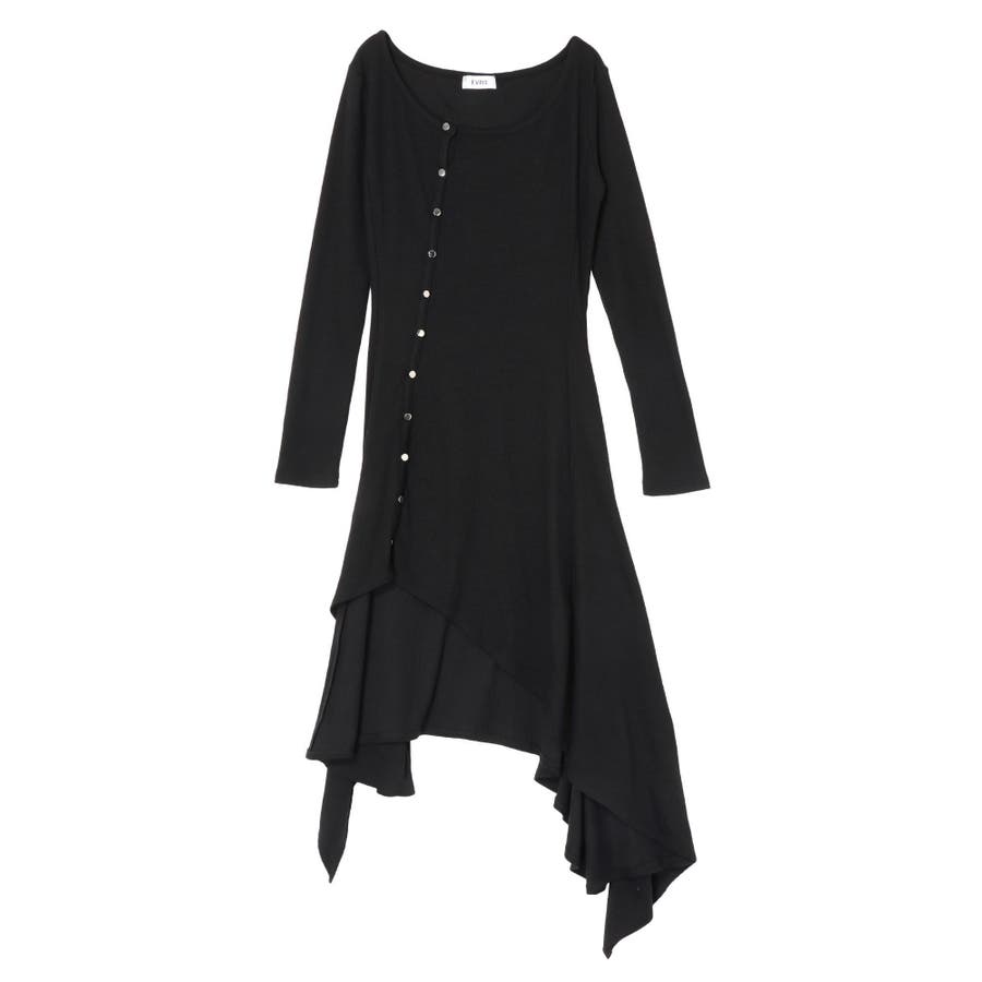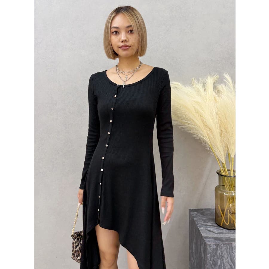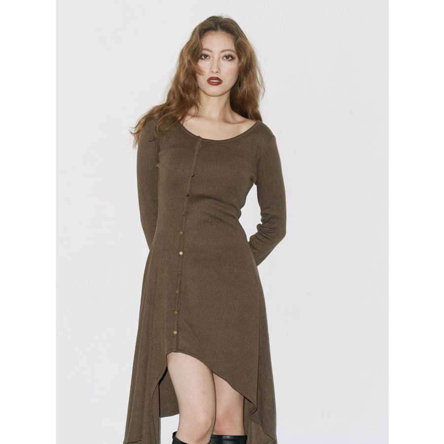 ■デザイン柔らかなリブカットソー素材で、肌なじみと着心地の良さを両立したワンピース。斜めに並んだフロントボタンが印象的でシンプルながらモードな雰囲気を演出します。アシンメトリーな裾のラインが動くたびに揺れて、軽やかさと個性をプラス。1枚でスタイルが決まるアイテムです。■スタイリング大人っぽく着れるワンピースですがアシンメトリーな裾のラインになっているのでデニムパンツをあわせてカジュアルダウンさせて着るとガラッと雰囲気を変えて楽しんでいただけます。--------------透け感:なし 裏地:なし生地の厚み:薄め伸縮性:あり--------------