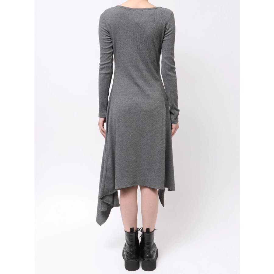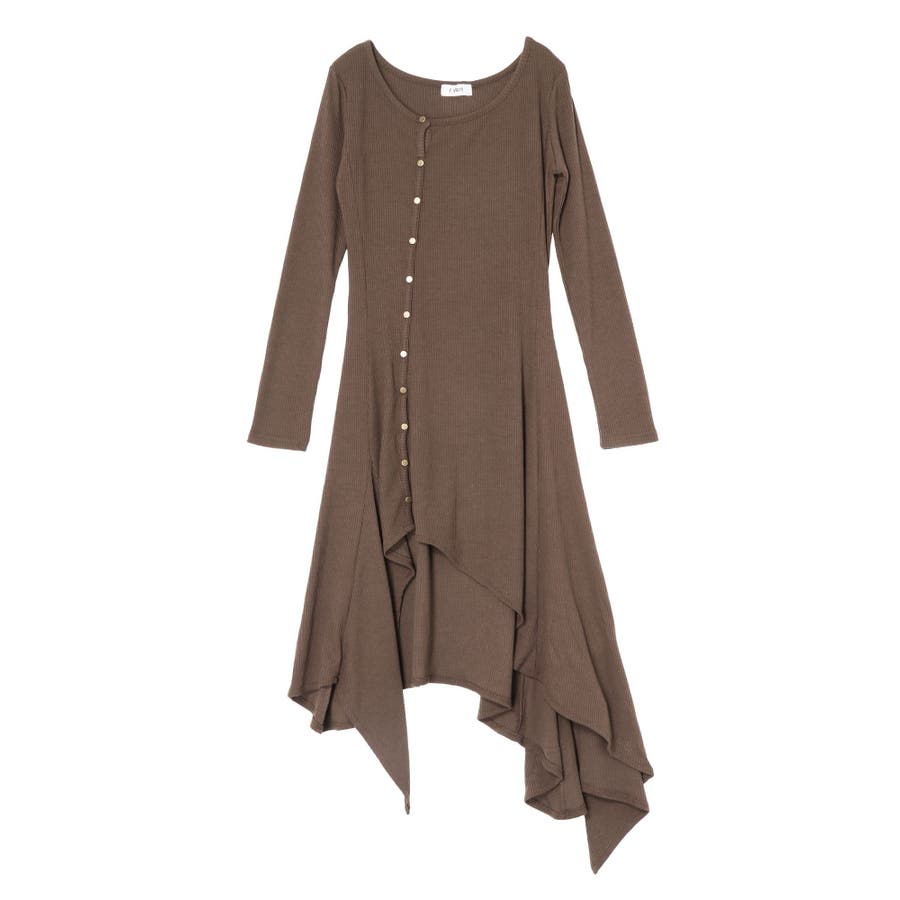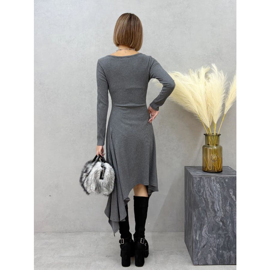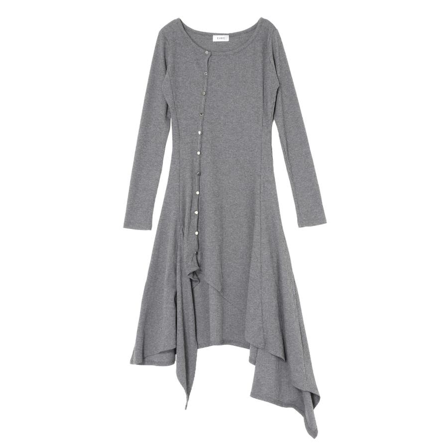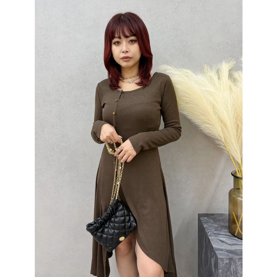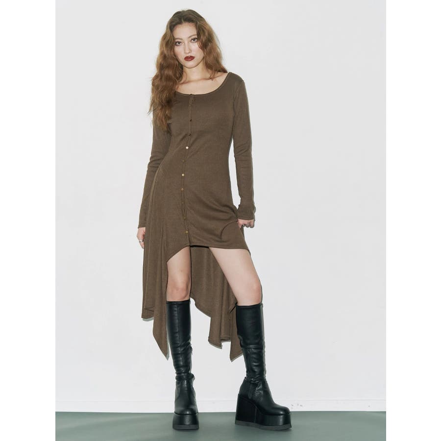 ■デザイン柔らかなリブカットソー素材で、肌なじみと着心地の良さを両立したワンピース。斜めに並んだフロントボタンが印象的でシンプルながらモードな雰囲気を演出します。アシンメトリーな裾のラインが動くたびに揺れて、軽やかさと個性をプラス。1枚でスタイルが決まるアイテムです。■スタイリング大人っぽく着れるワンピースですがアシンメトリーな裾のラインになっているのでデニムパンツをあわせてカジュアルダウンさせて着るとガラッと雰囲気を変えて楽しんでいただけます。--------------透け感:なし 裏地:なし生地の厚み:薄め伸縮性:あり--------------