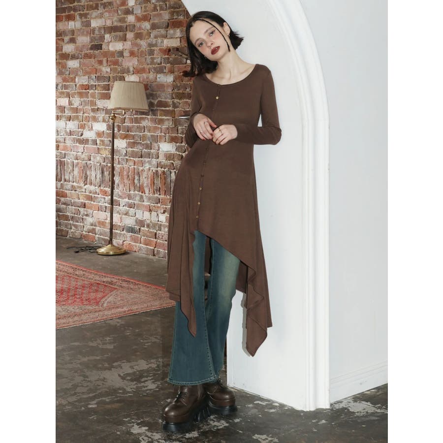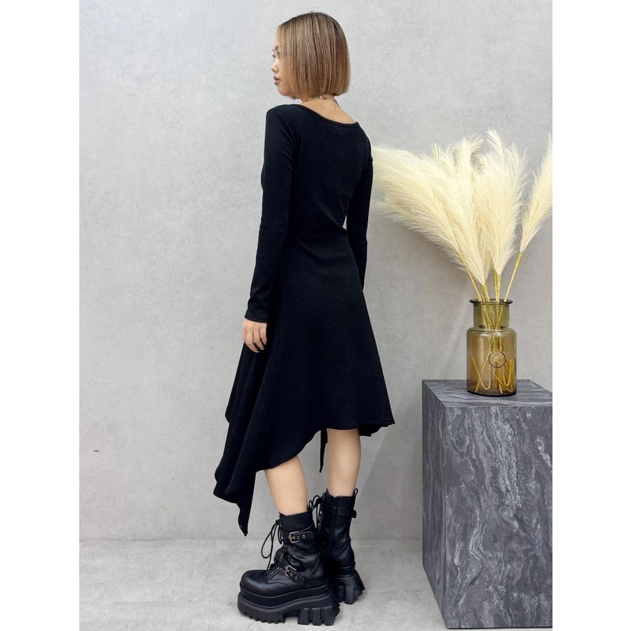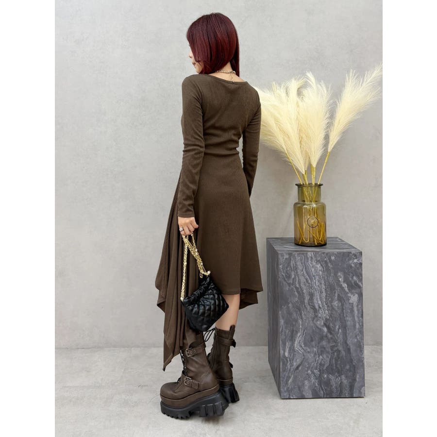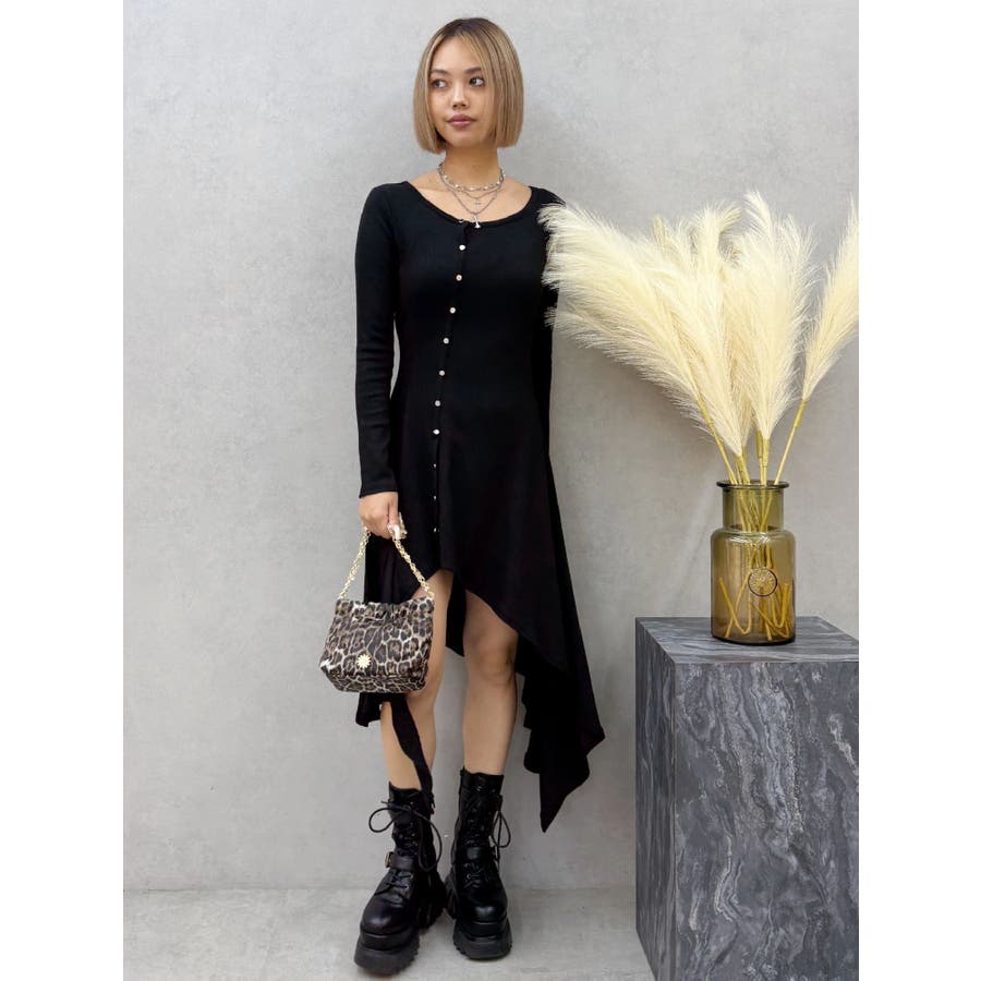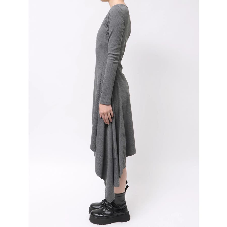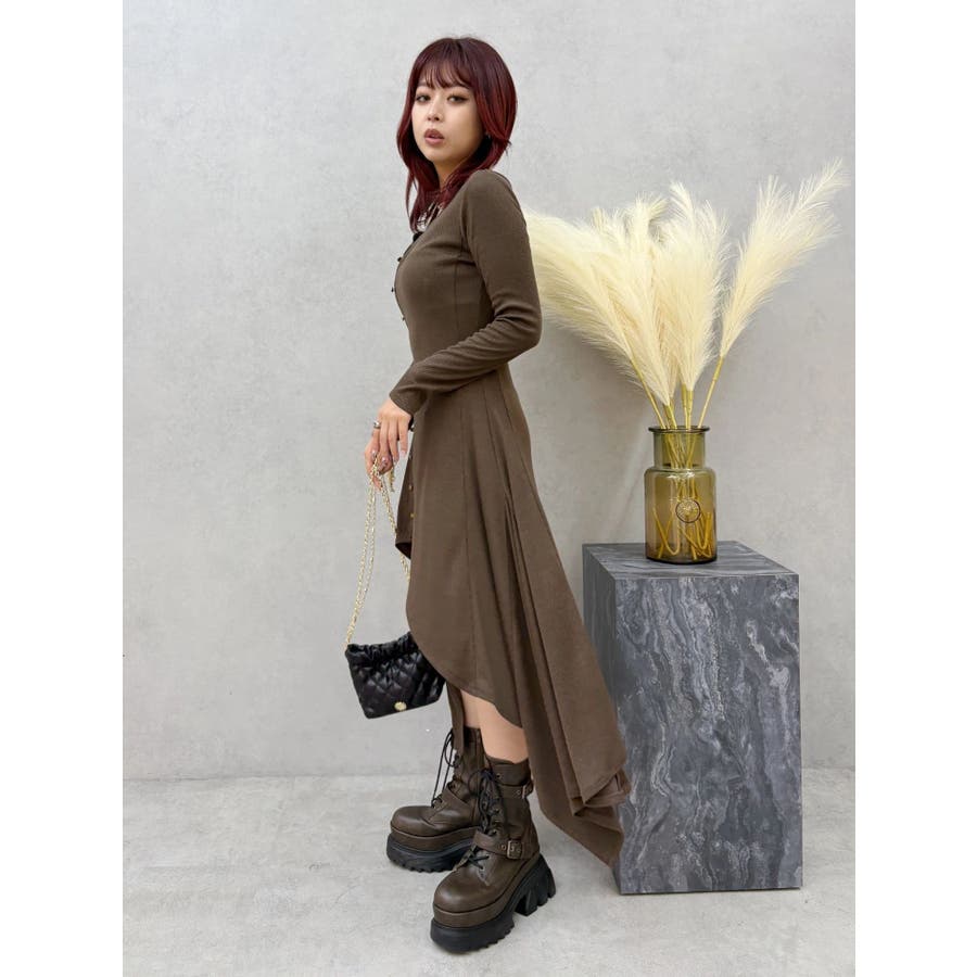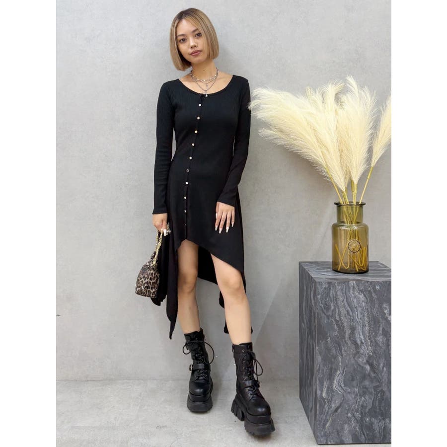 ■デザイン柔らかなリブカットソー素材で、肌なじみと着心地の良さを両立したワンピース。斜めに並んだフロントボタンが印象的でシンプルながらモードな雰囲気を演出します。アシンメトリーな裾のラインが動くたびに揺れて、軽やかさと個性をプラス。1枚でスタイルが決まるアイテムです。■スタイリング大人っぽく着れるワンピースですがアシンメトリーな裾のラインになっているのでデニムパンツをあわせてカジュアルダウンさせて着るとガラッと雰囲気を変えて楽しんでいただけます。--------------透け感:なし 裏地:なし生地の厚み:薄め伸縮性:あり--------------