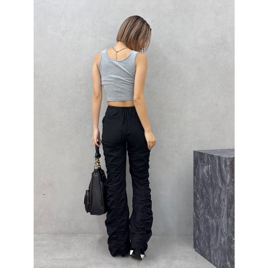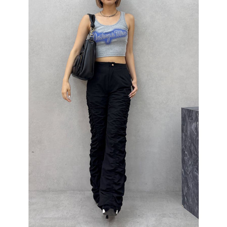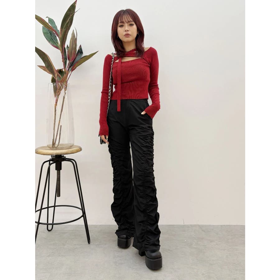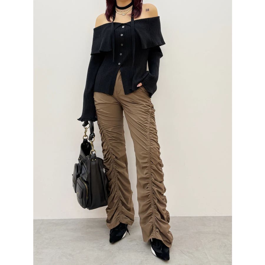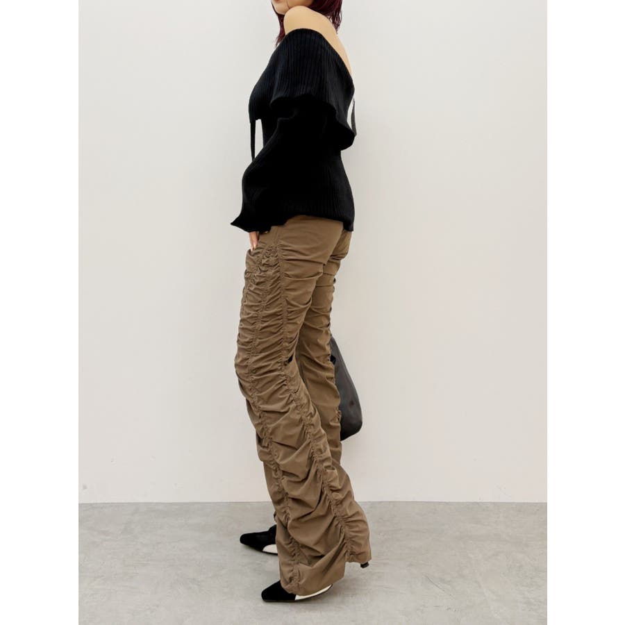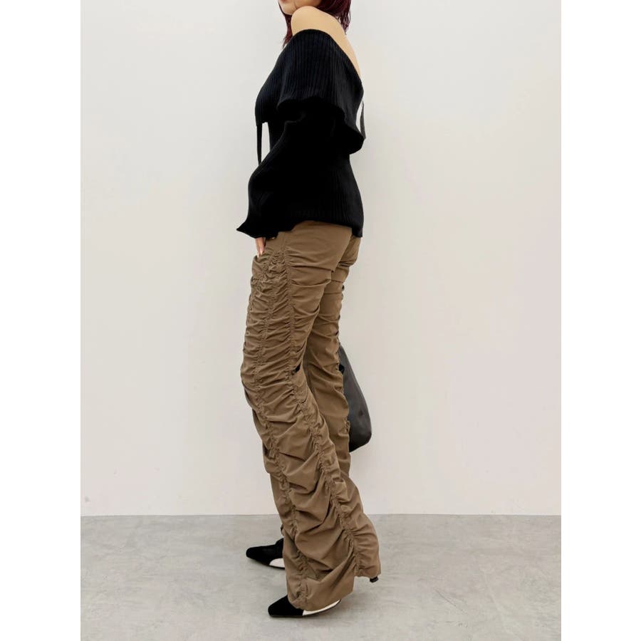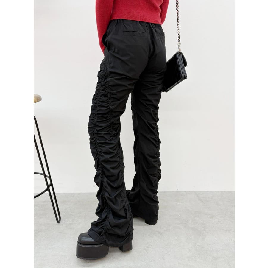 レッグ部分にたっぷりと施したボリュームギャザーがポイントとなったフレアパンツです。ヒップ周りはすっきりとしたシルエットとなっておりスタイルアップして着用いただけるデザインです。ストレッチ性のあるデザインのため、履き心地も良くストレスのない履き心地です。