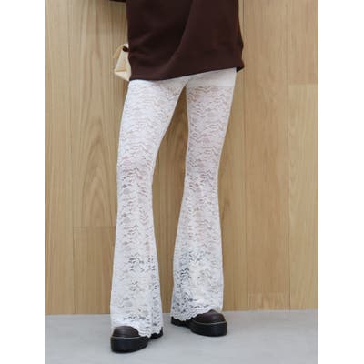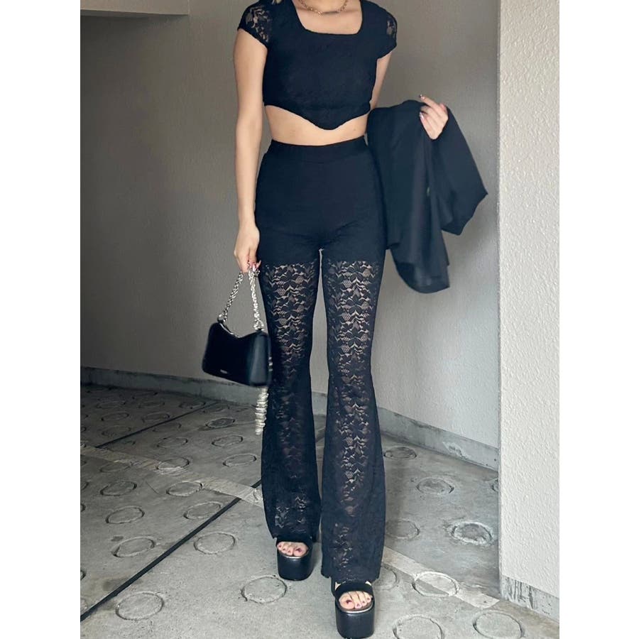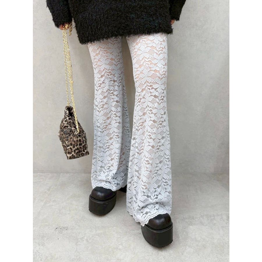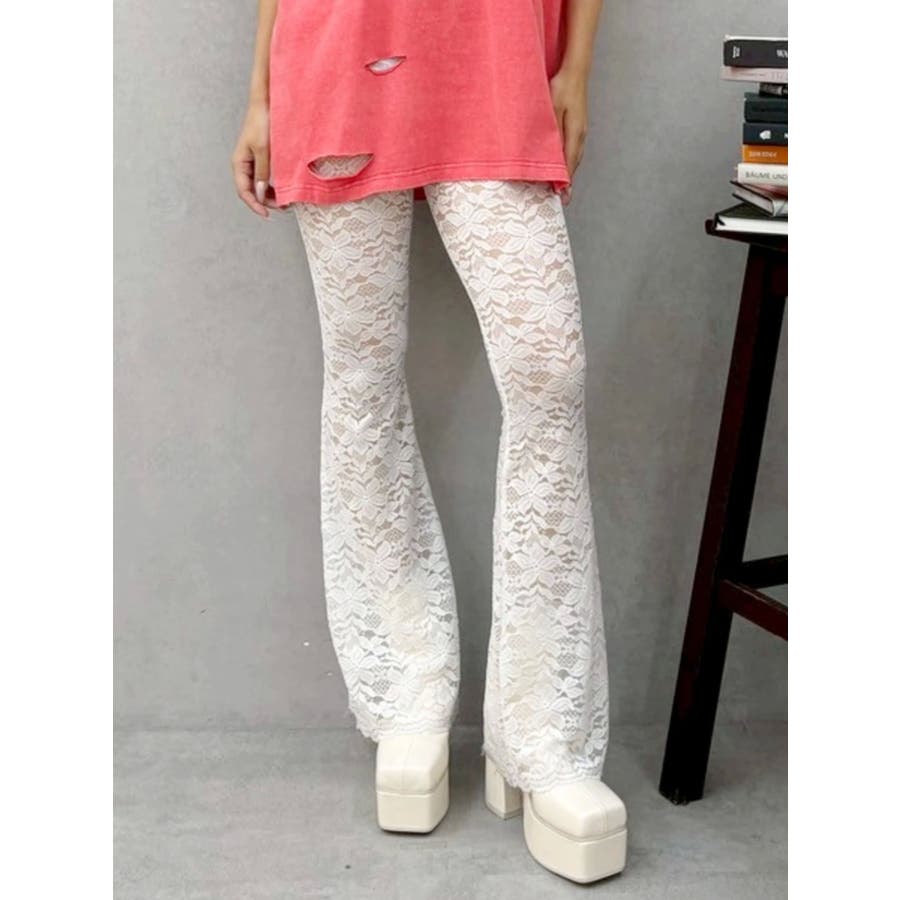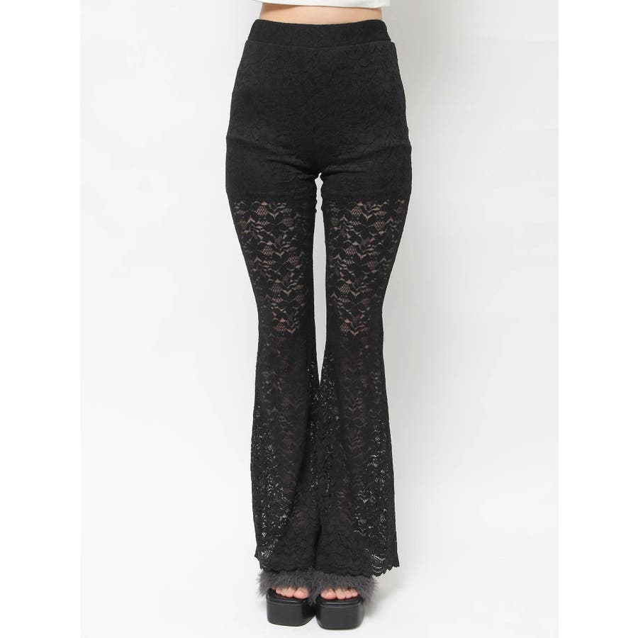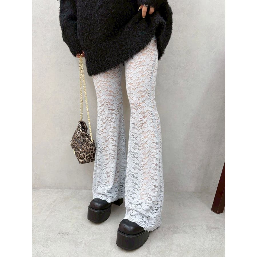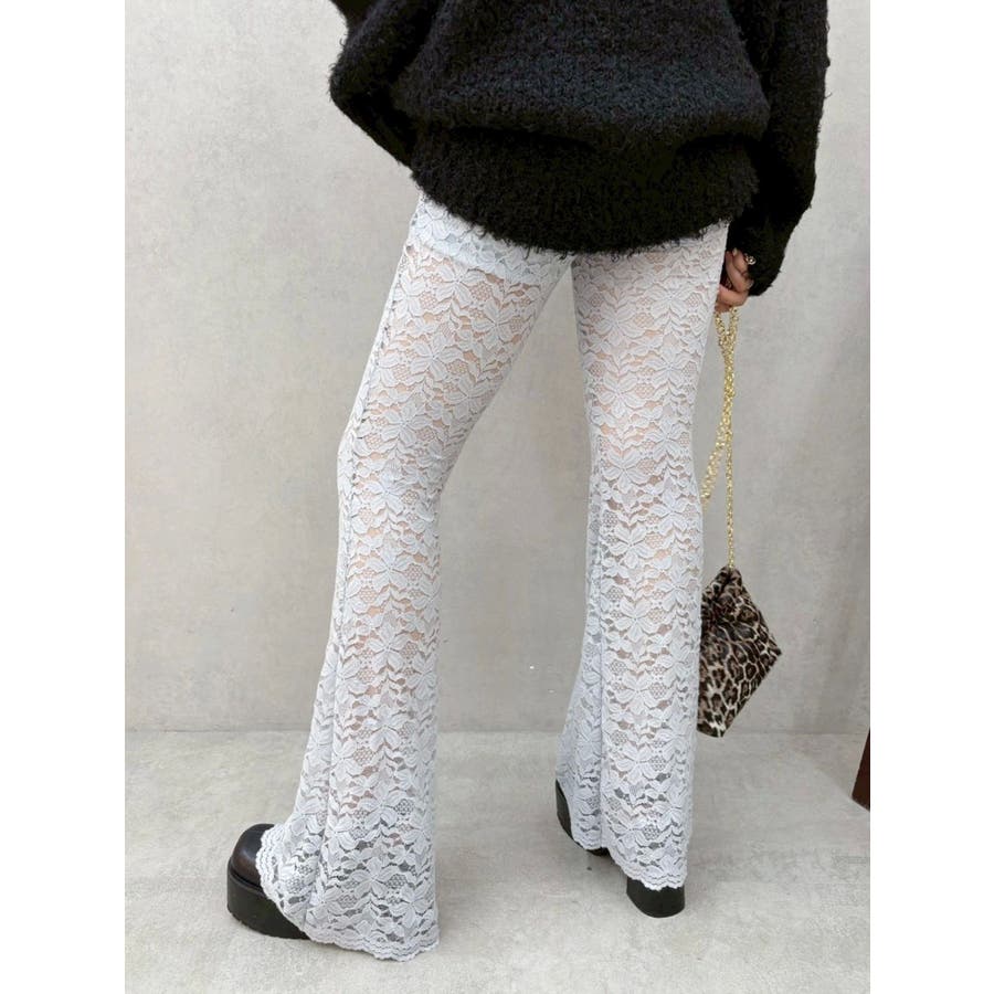 トレンドのレース素材を使用したフレアパンツです。太もも真ん中まで裏地が付いているので1枚で安心して履いて頂けます。伸縮性のあるレースを使用しており、ウエストもゴム仕様なので着用して頂きやすく、フィット感があり、スタイルアップ効果のあるパンツです。※Sサイズより、Mサイズ4cm長いです。