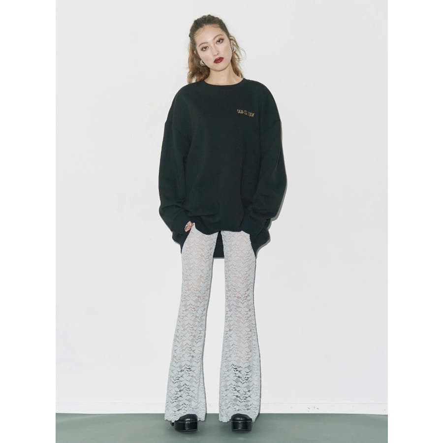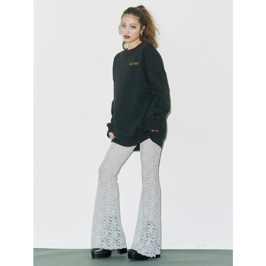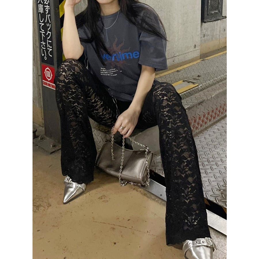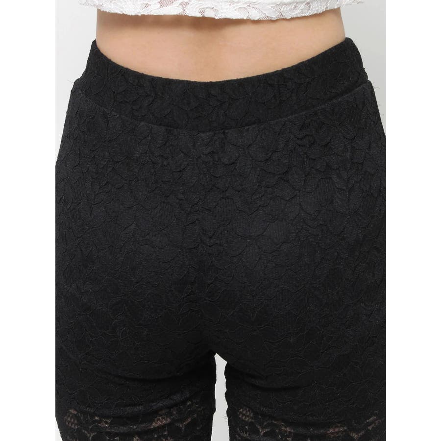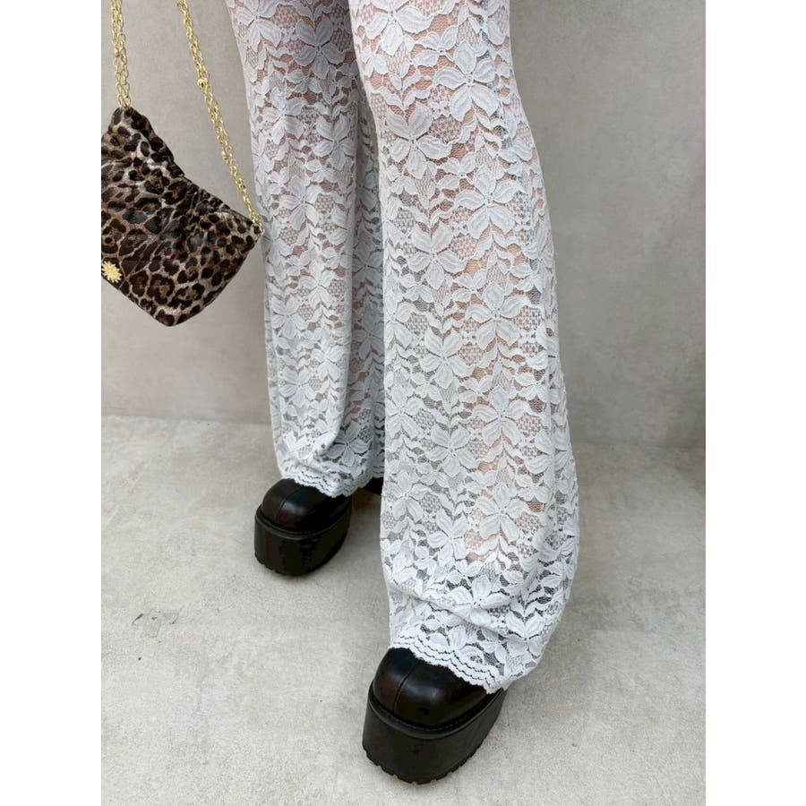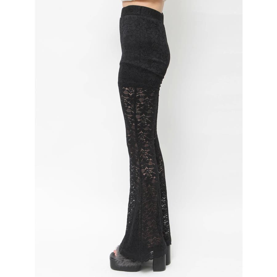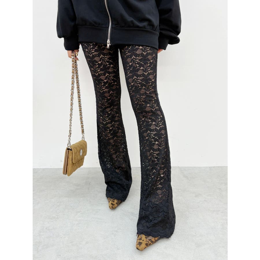 トレンドのレース素材を使用したフレアパンツです。太もも真ん中まで裏地が付いているので1枚で安心して履いて頂けます。伸縮性のあるレースを使用しており、ウエストもゴム仕様なので着用して頂きやすく、フィット感があり、スタイルアップ効果のあるパンツです。※Sサイズより、Mサイズ4cm長いです。