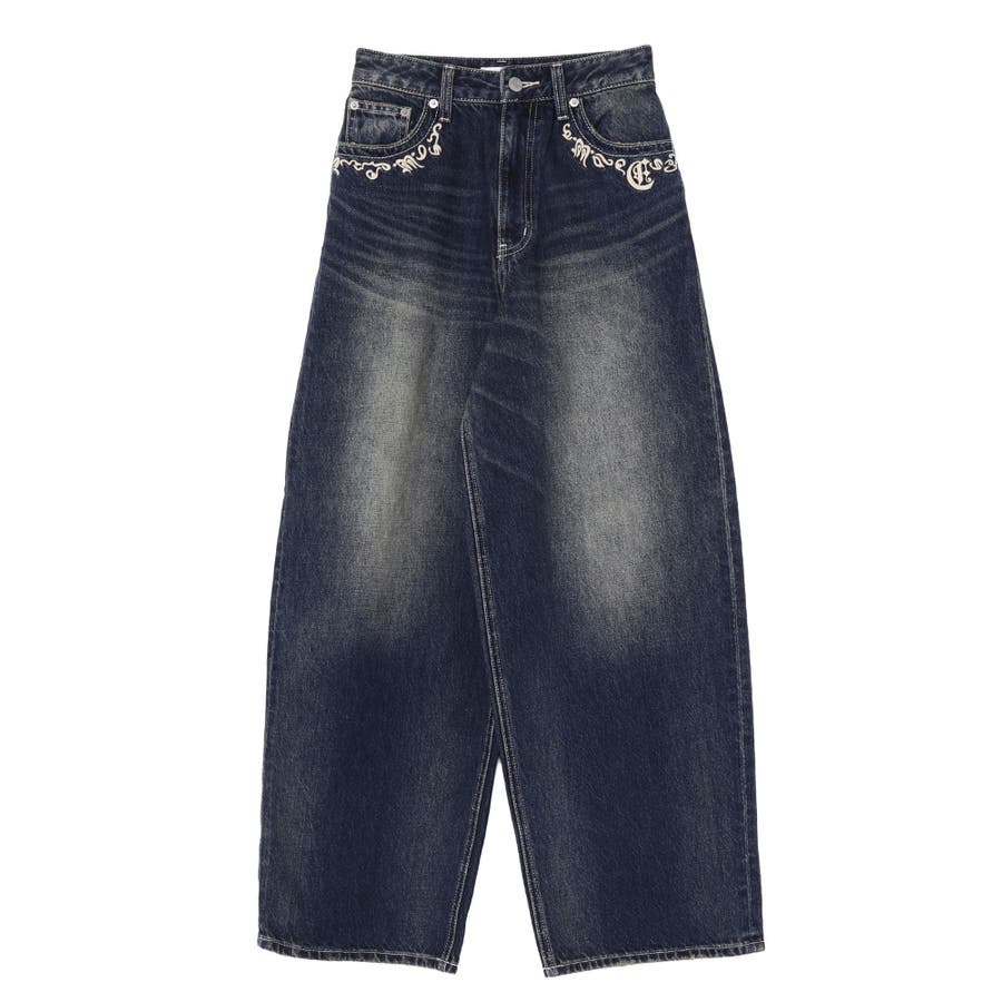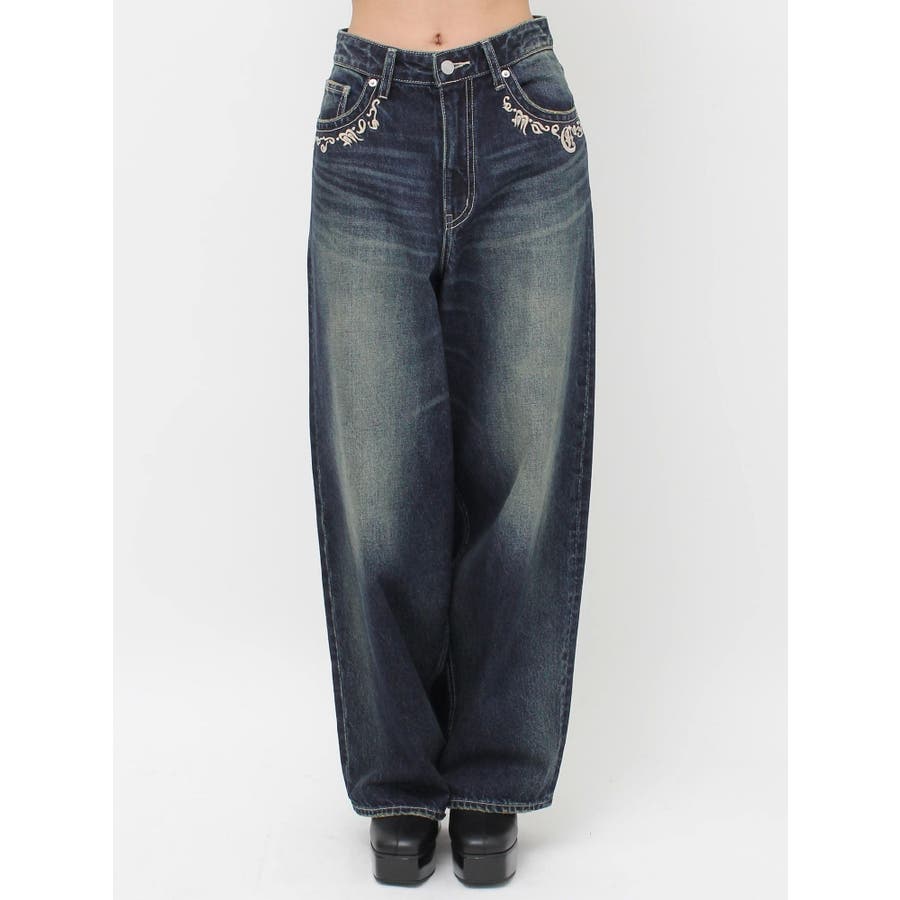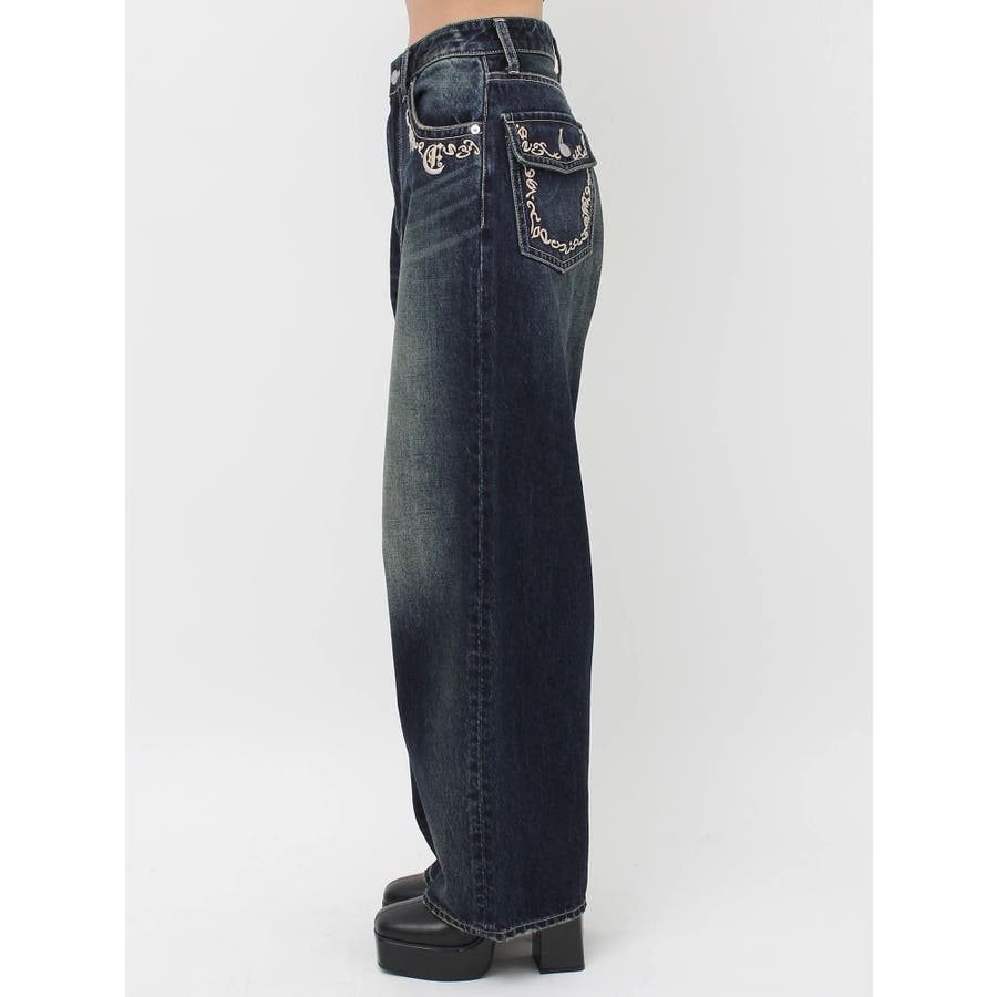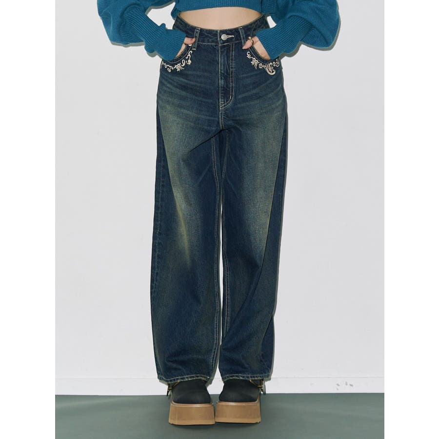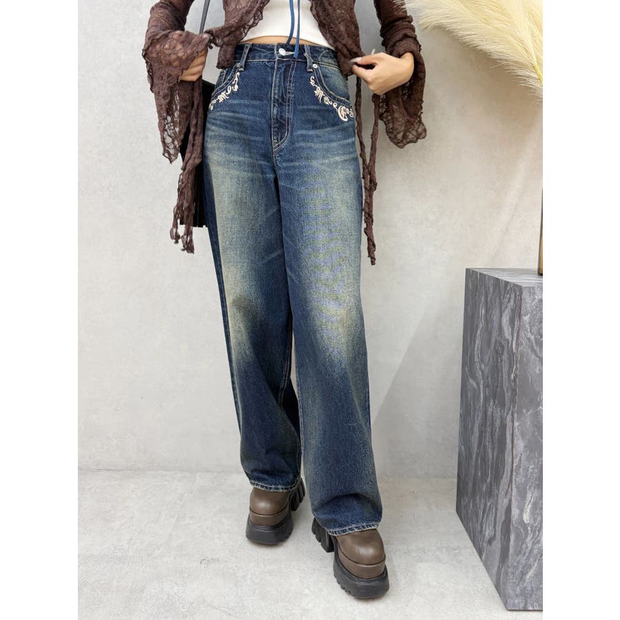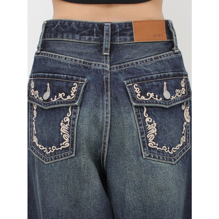 オリジナルの刺繍をポケットに施したエッジの効いたデニムパンツです。ワイドシルエットでルーズに着こなすのがトレンド感がありおすすめです。オリジナルのグラフィックの中にはEVRIS(エヴリス)のEマークをさりげなく入れており、ブランドらしさのある1着に仕上がっています。ヴィンテージ感のある加工でこなれた雰囲気に仕上がっています。