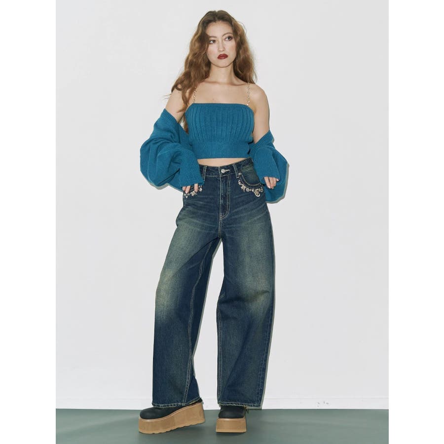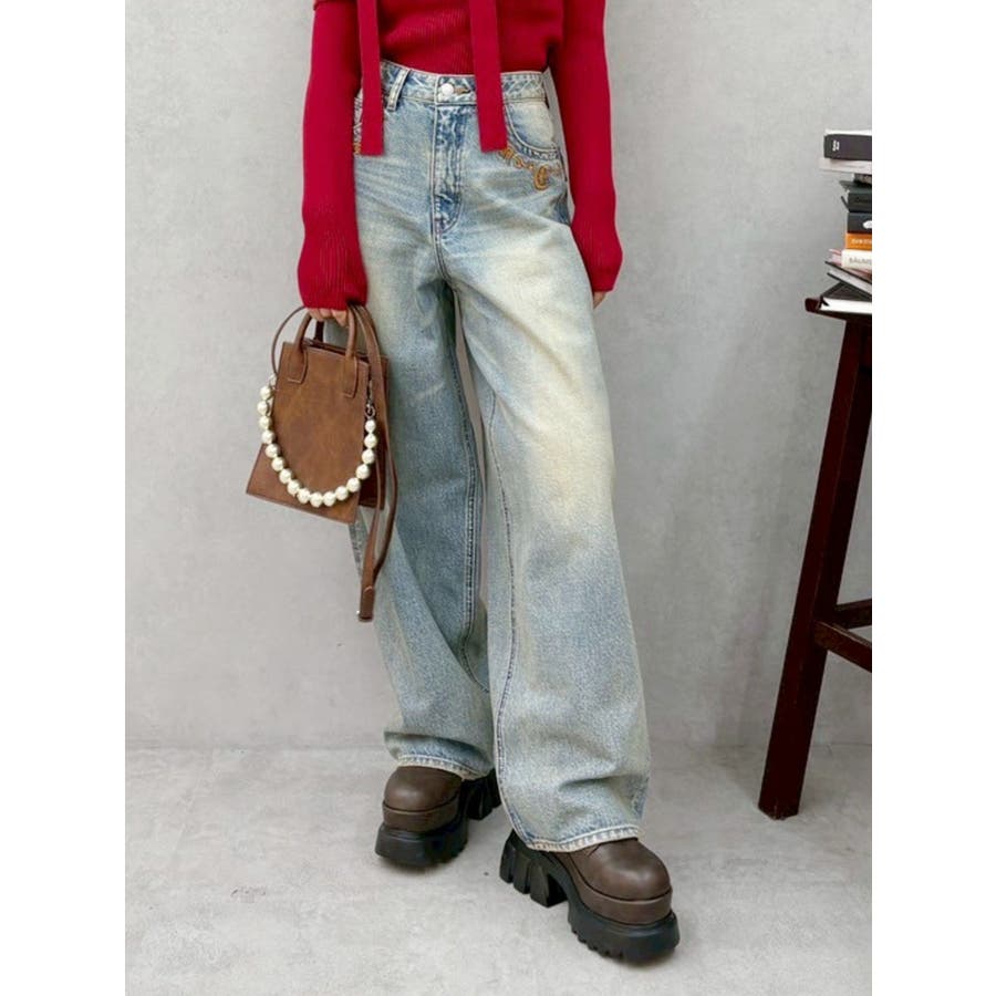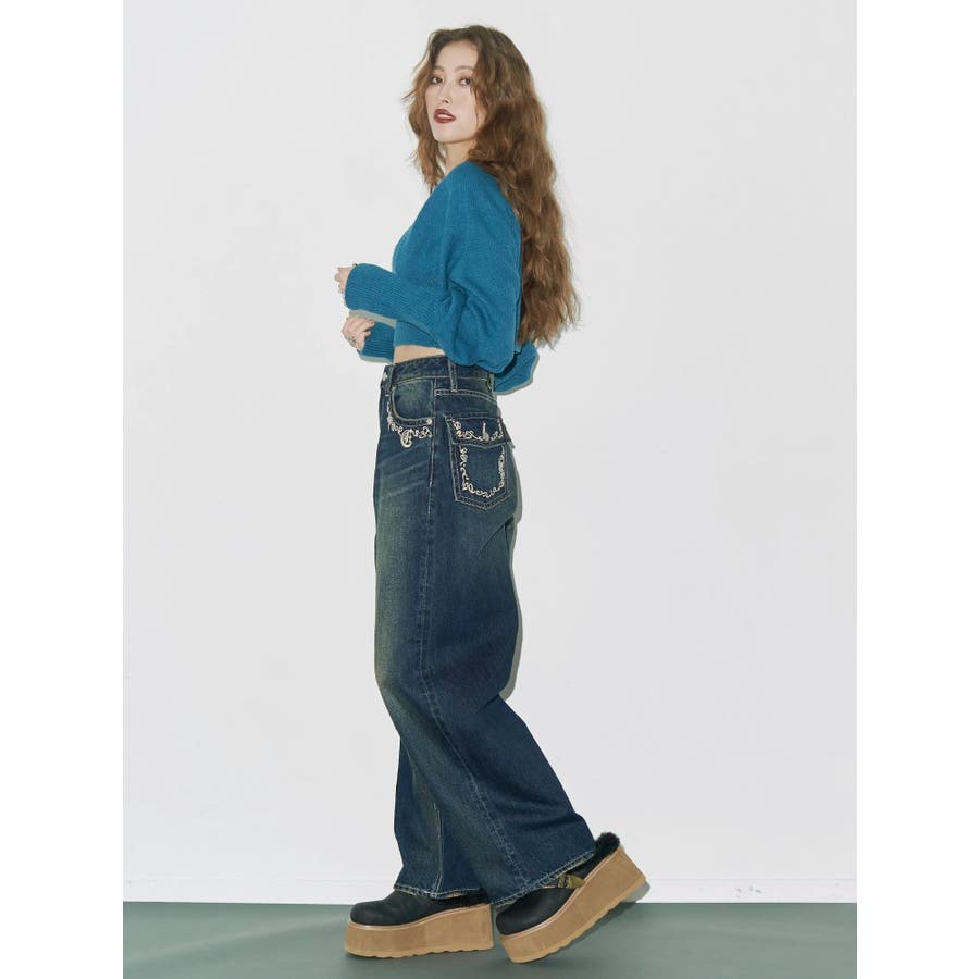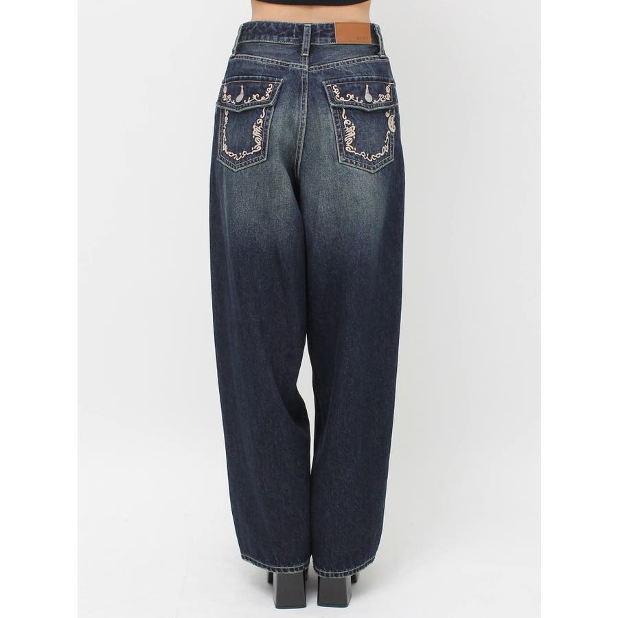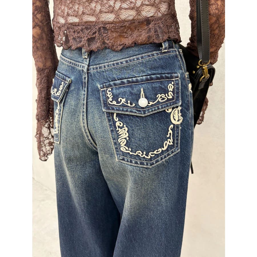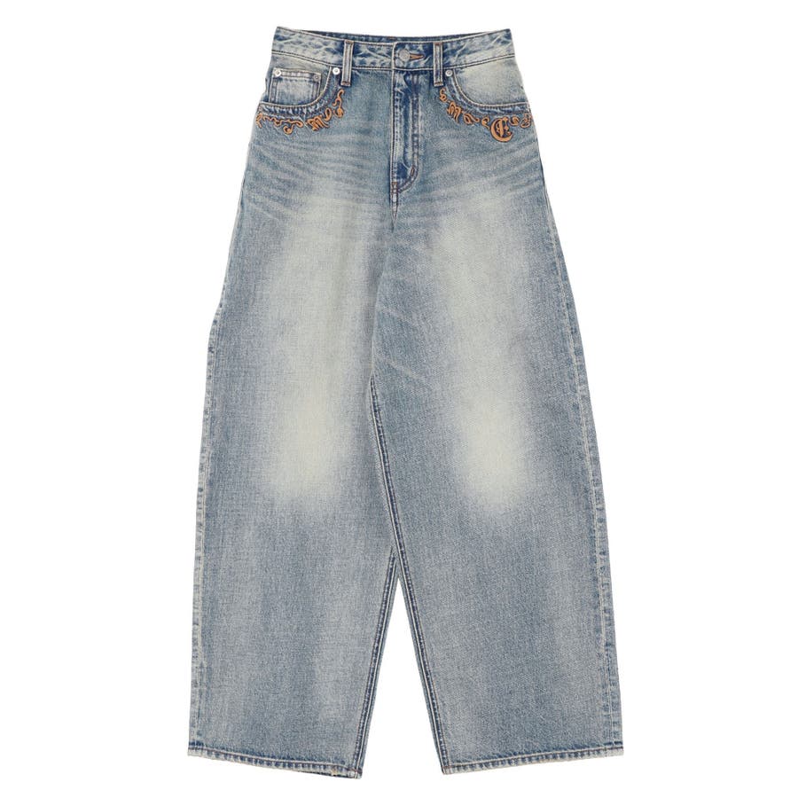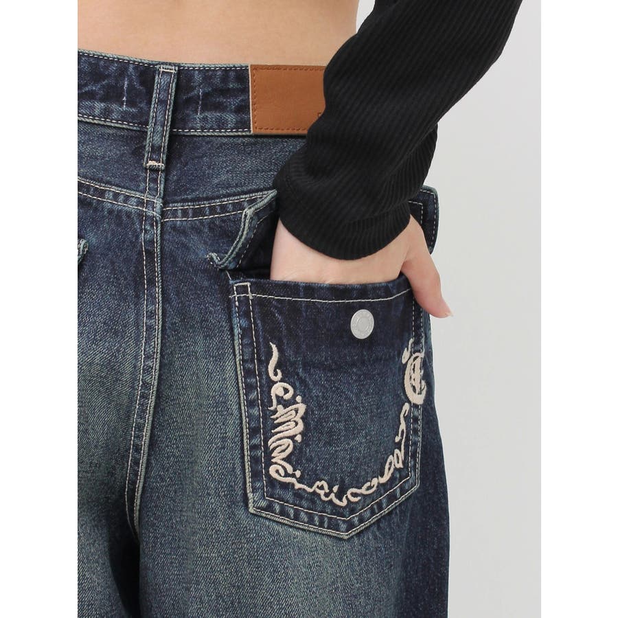 オリジナルの刺繍をポケットに施したエッジの効いたデニムパンツです。ワイドシルエットでルーズに着こなすのがトレンド感がありおすすめです。オリジナルのグラフィックの中にはEVRIS(エヴリス)のEマークをさりげなく入れており、ブランドらしさのある1着に仕上がっています。ヴィンテージ感のある加工でこなれた雰囲気に仕上がっています。