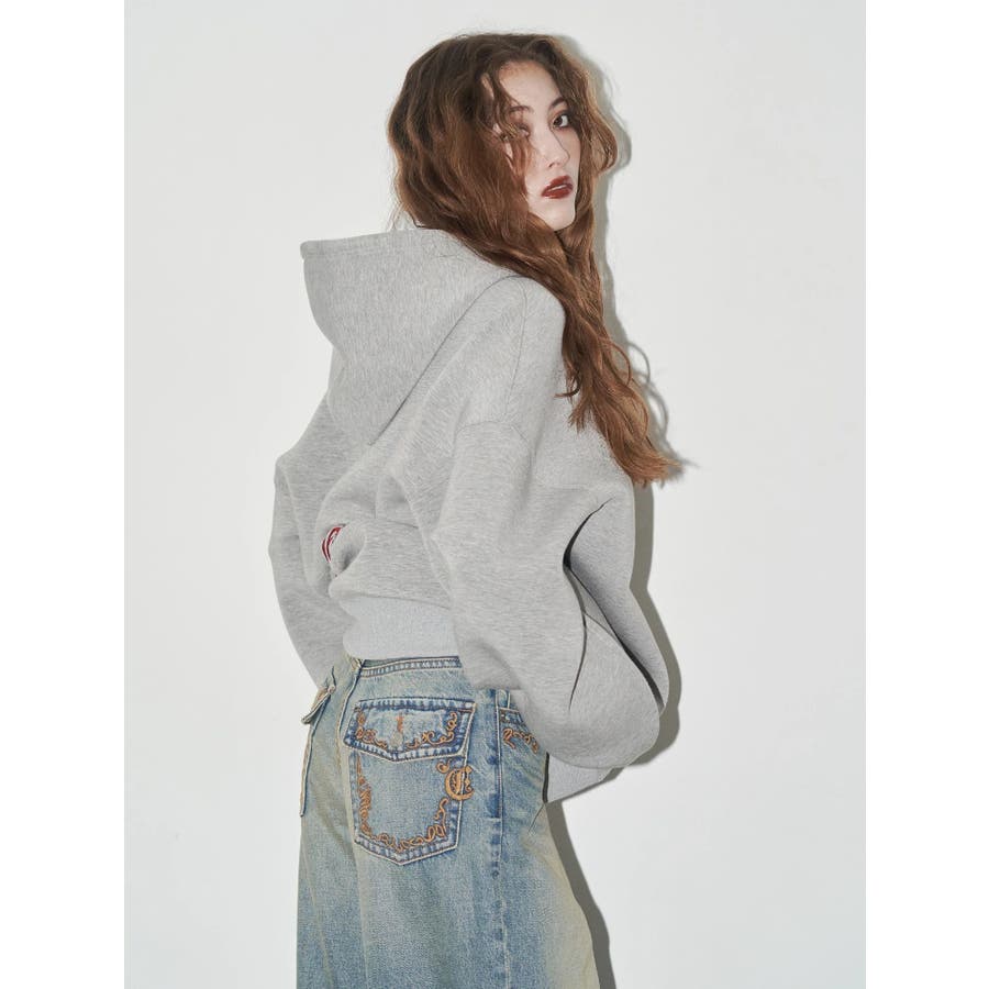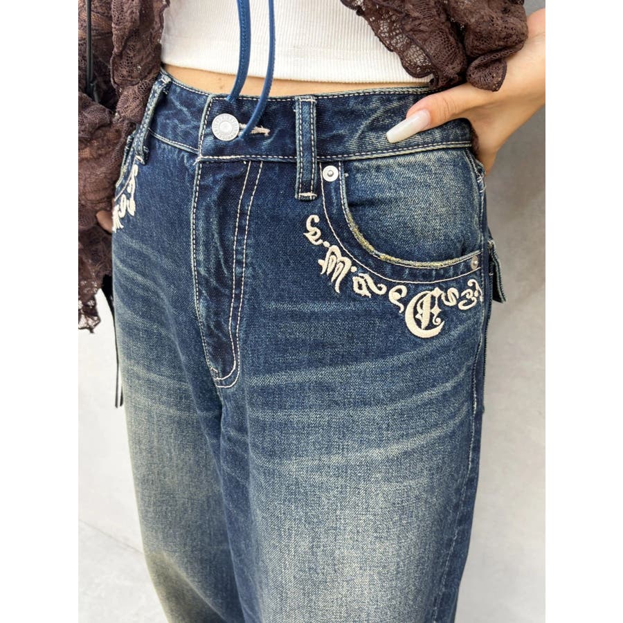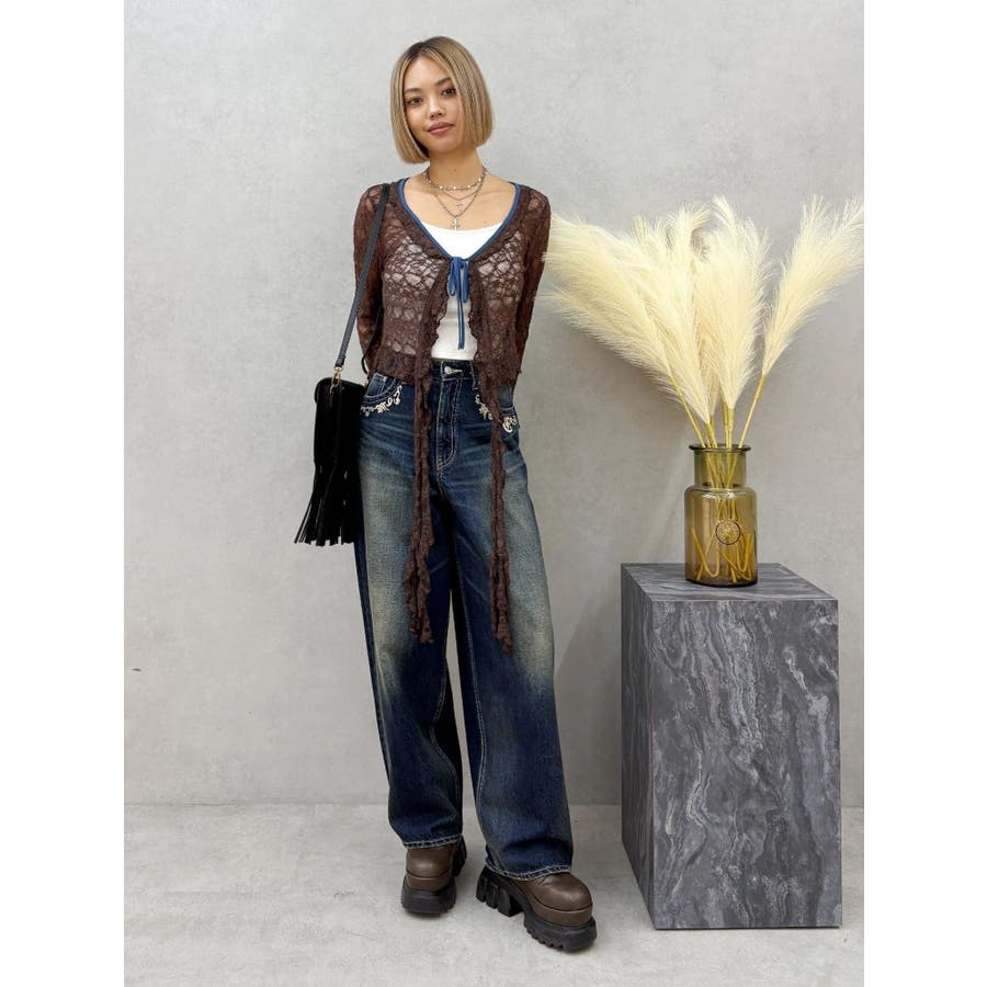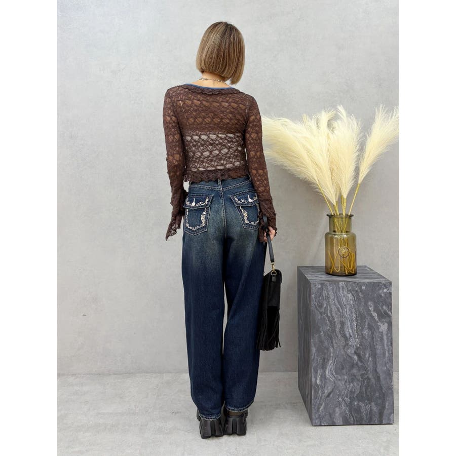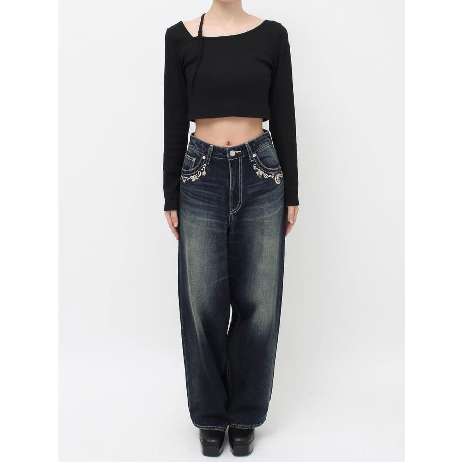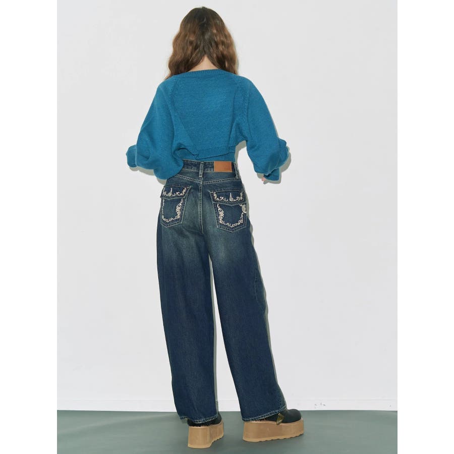 オリジナルの刺繍をポケットに施したエッジの効いたデニムパンツです。ワイドシルエットでルーズに着こなすのがトレンド感がありおすすめです。オリジナルのグラフィックの中にはEVRIS(エヴリス)のEマークをさりげなく入れており、ブランドらしさのある1着に仕上がっています。ヴィンテージ感のある加工でこなれた雰囲気に仕上がっています。