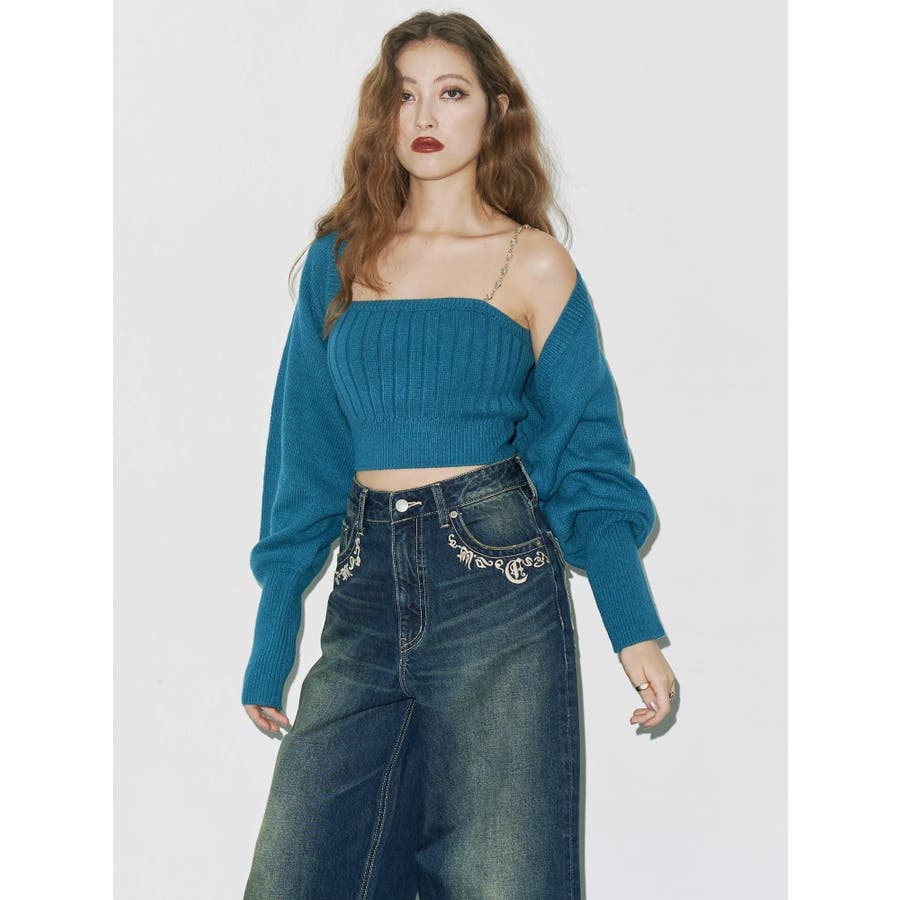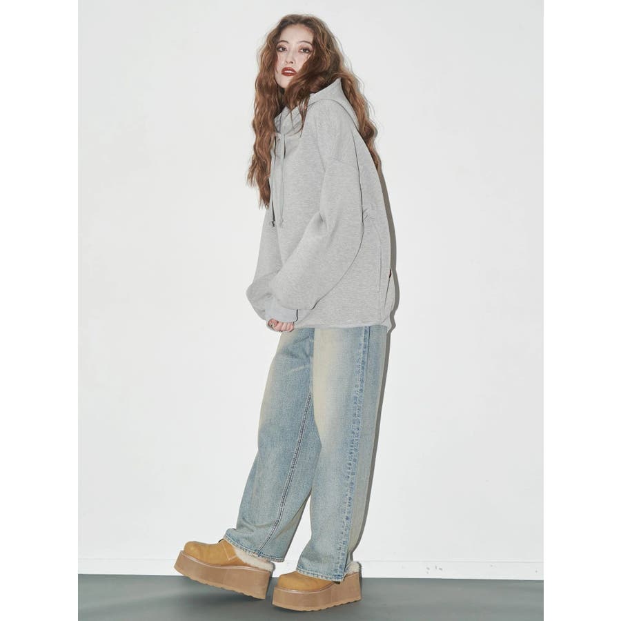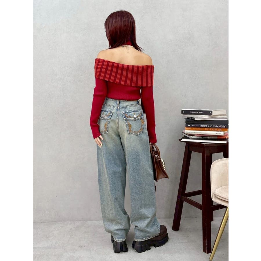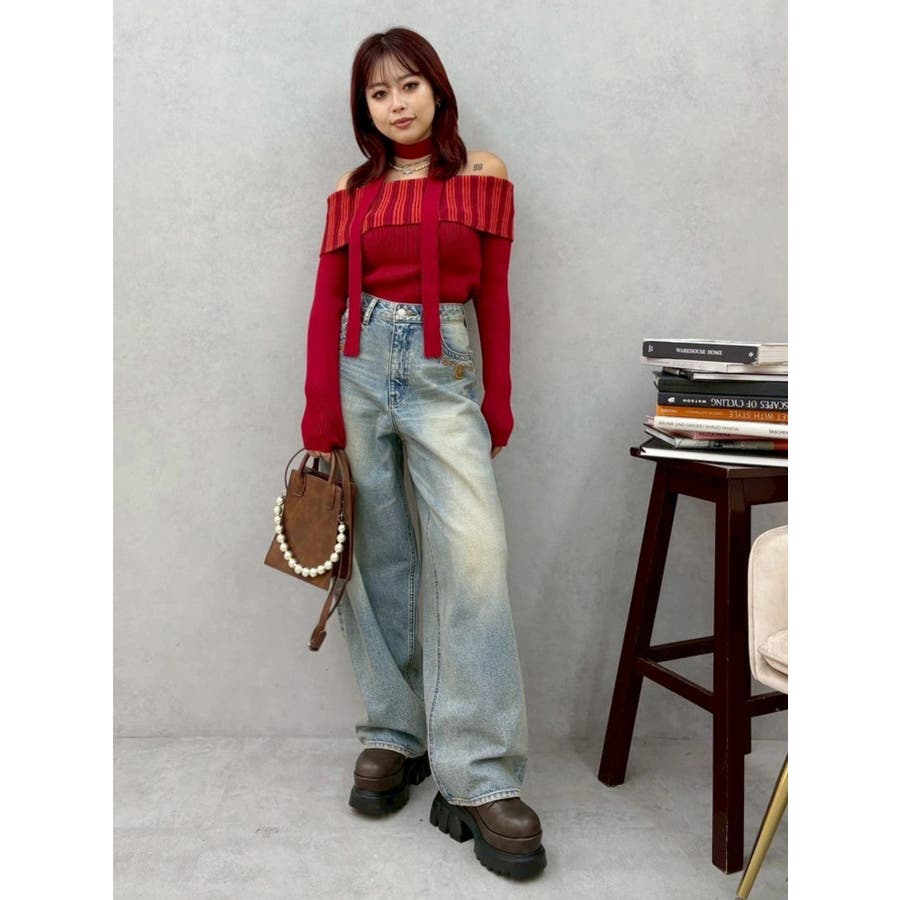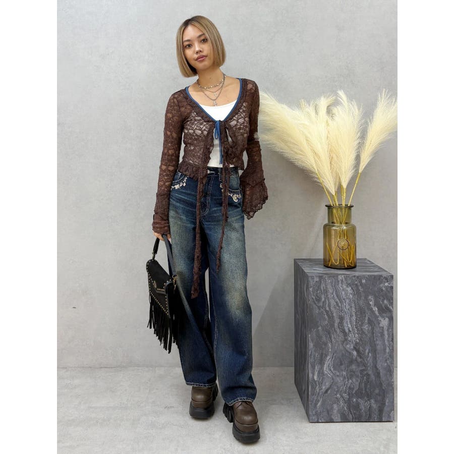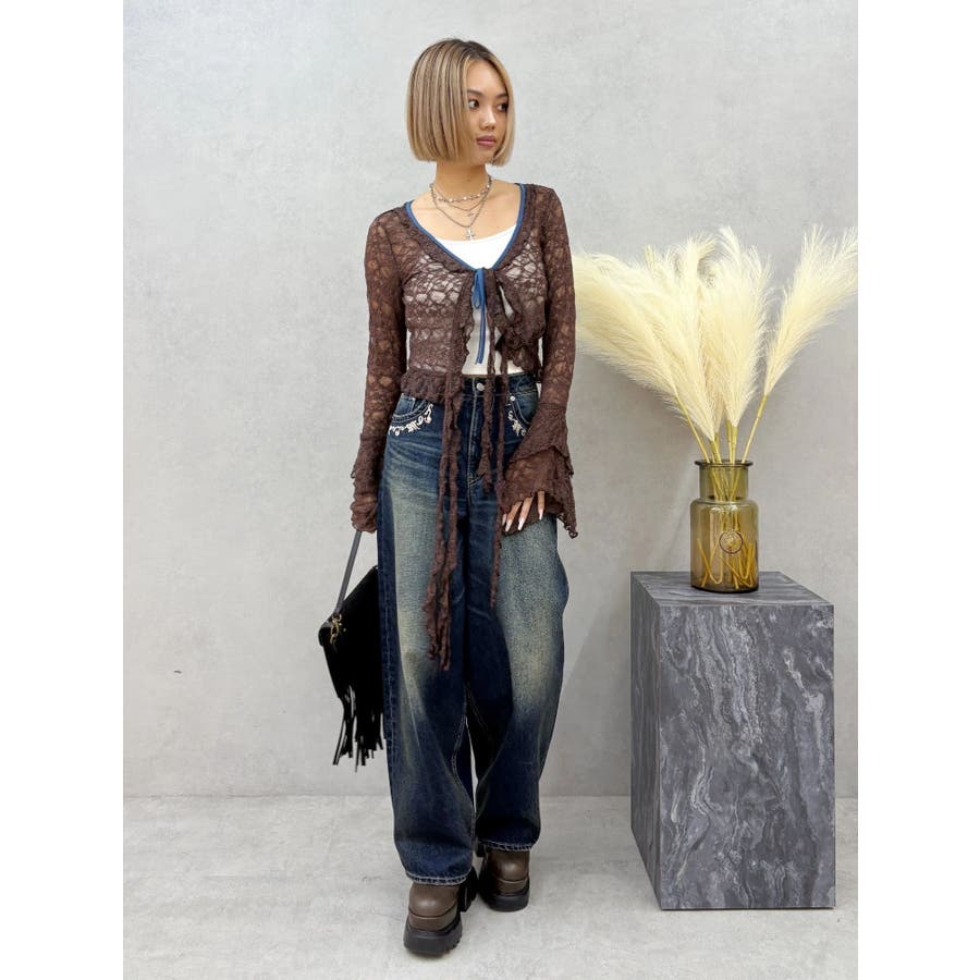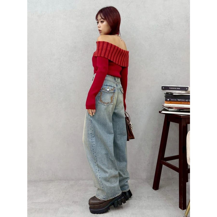 オリジナルの刺繍をポケットに施したエッジの効いたデニムパンツです。ワイドシルエットでルーズに着こなすのがトレンド感がありおすすめです。オリジナルのグラフィックの中にはEVRIS(エヴリス)のEマークをさりげなく入れており、ブランドらしさのある1着に仕上がっています。ヴィンテージ感のある加工でこなれた雰囲気に仕上がっています。