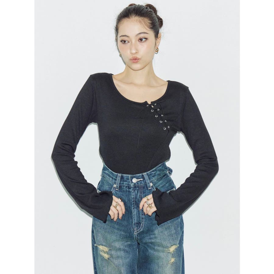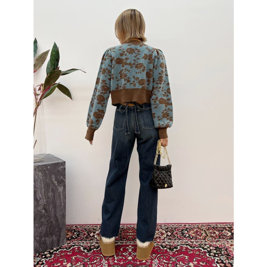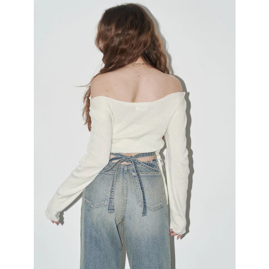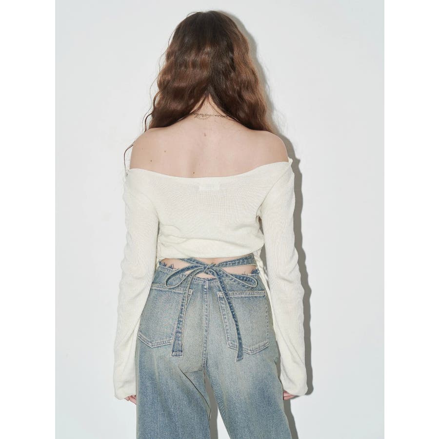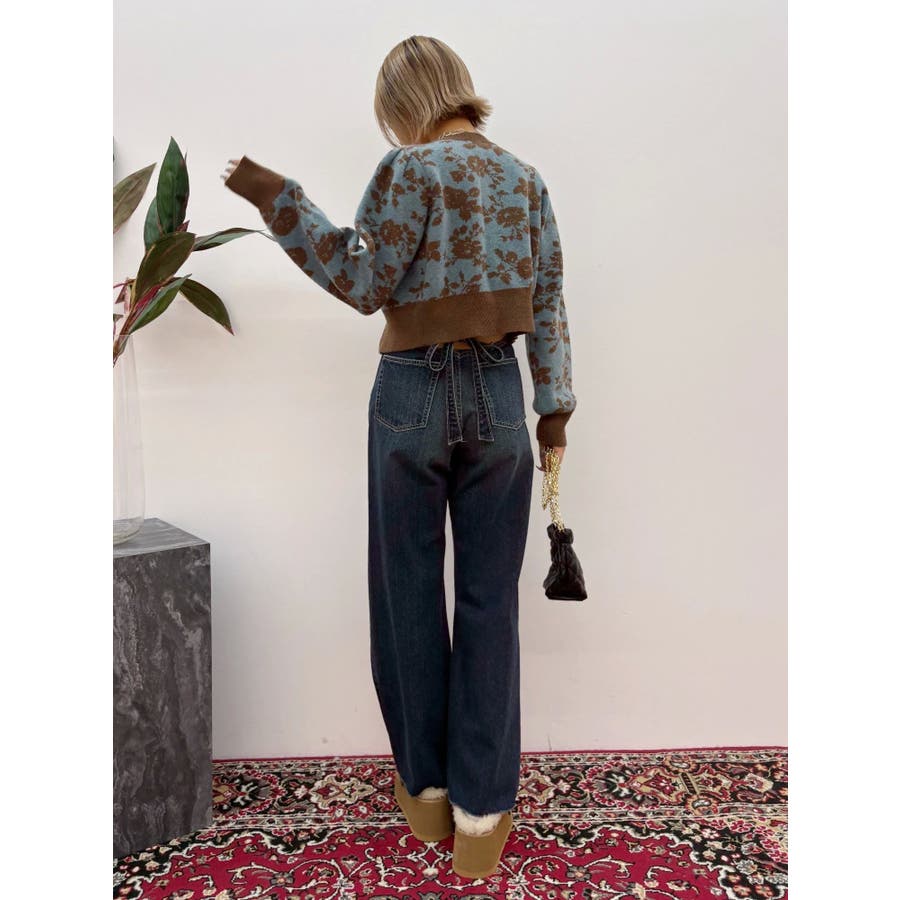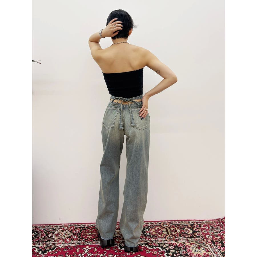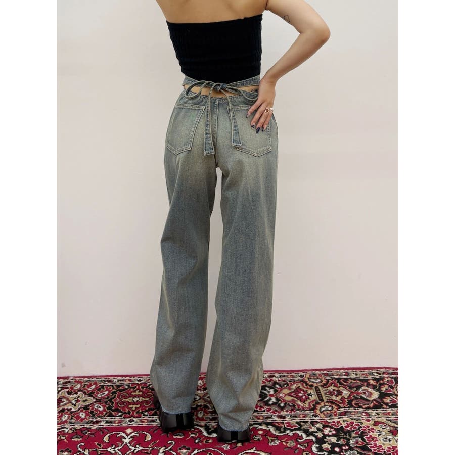 リボンデザインがかわいい?■デザインEVRIS定番デニムのシンプルワイドのシルエットを活かしたデニムパンツです。後ろのウエストのベルト部分がリボンで結べるようになっており、バックスタイルがインパクトのあるデニムパンツです。前から見ればハイウエストのシンプルなデニムパンツ。■スタイリング後ろのデザインがポイントなので、クロップド丈のTOPS合わせがオススメです。オールシーズン着まわせる華やかなデニムパンツ。-------------- 透け感:なし 裏地:なし 生地の厚み:普通伸縮性:なし --------------
