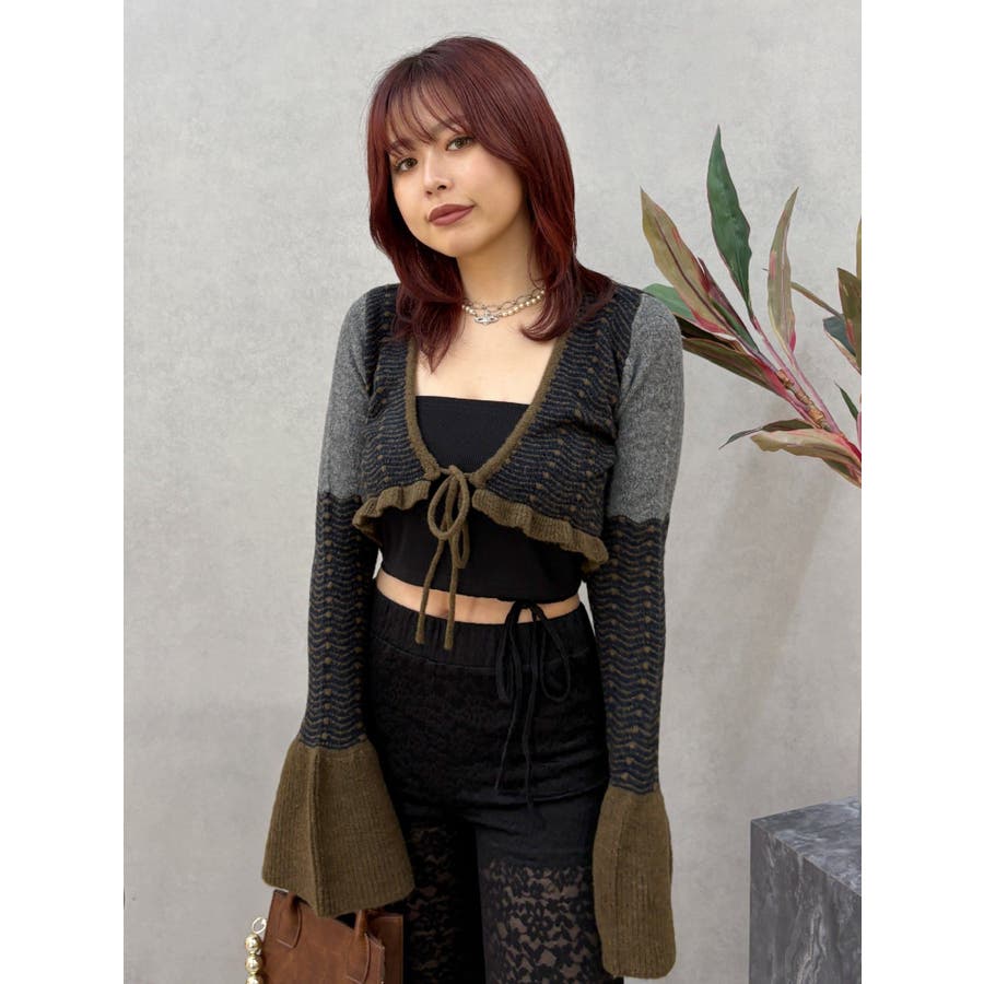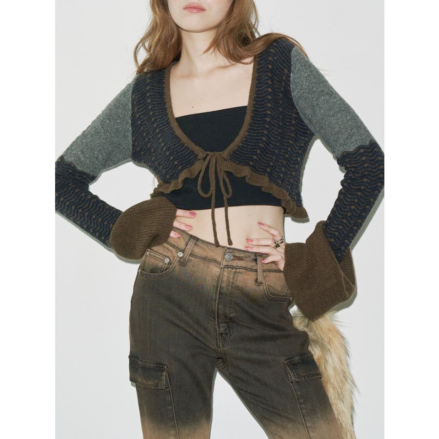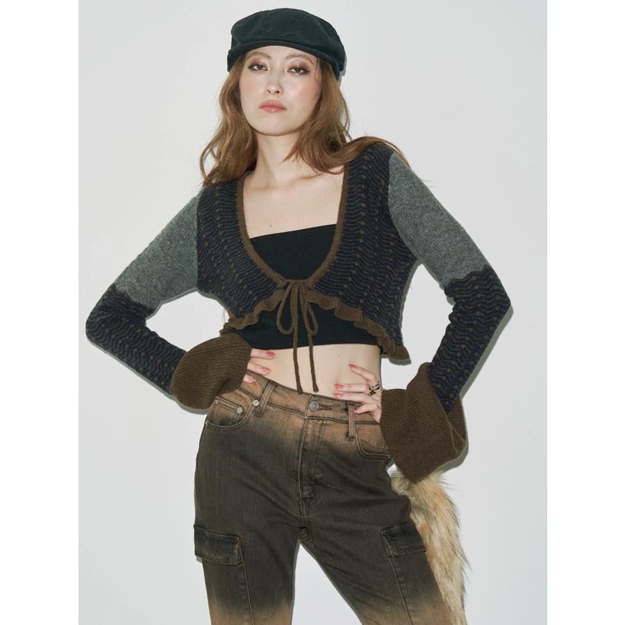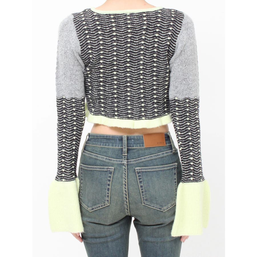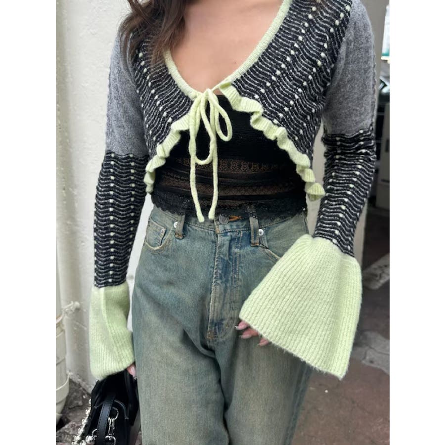 ■デザインEVRIS(エヴリス)らしいカラフルな配色が目を引くニットトップスです。オリジナルで作成しているパターンは、秋冬のEVRIS定番人気のデザインです。袖のたっぷりとしたボリュームに、身頃はすっきりとコンパクトなサイジング。メリハリのあるシルエットが叶う一枚です。■スタイリングフレアパンツや、カーゴパンツなどボリュームのあるボトムとの合わせがおすすめです。-------------- 透け感:なし 裏地:なし 生地の厚み:普通伸縮性:あり--------------