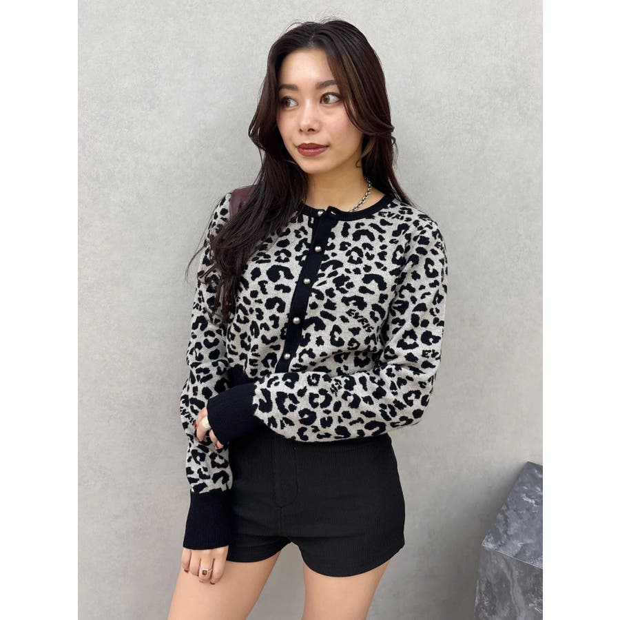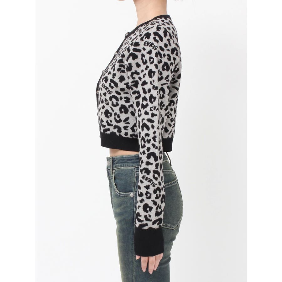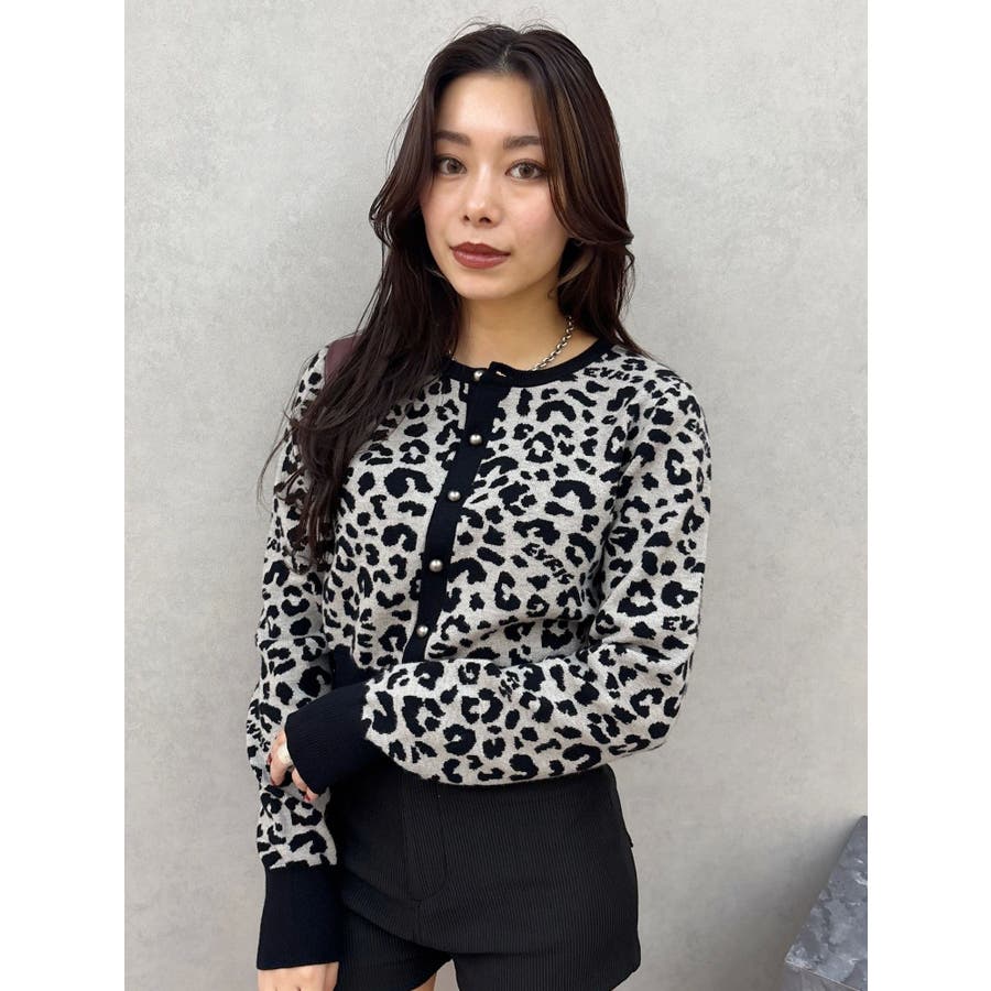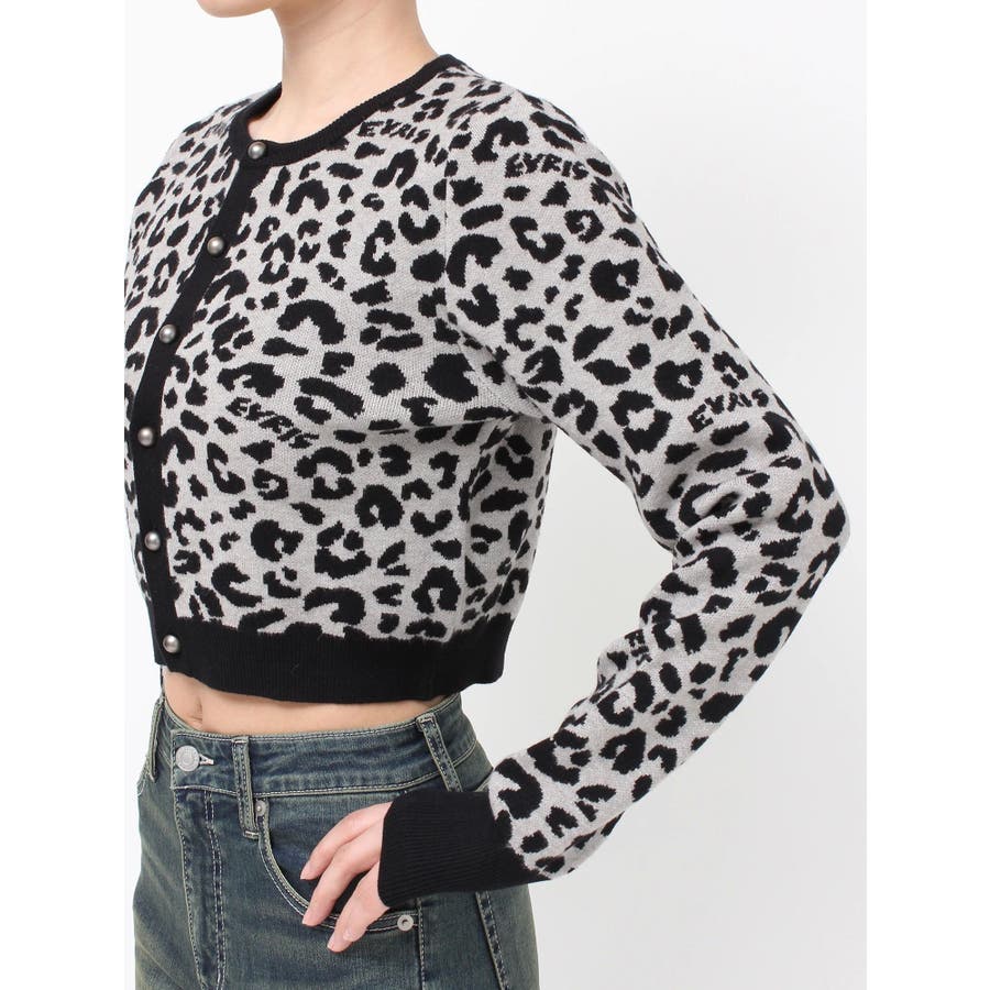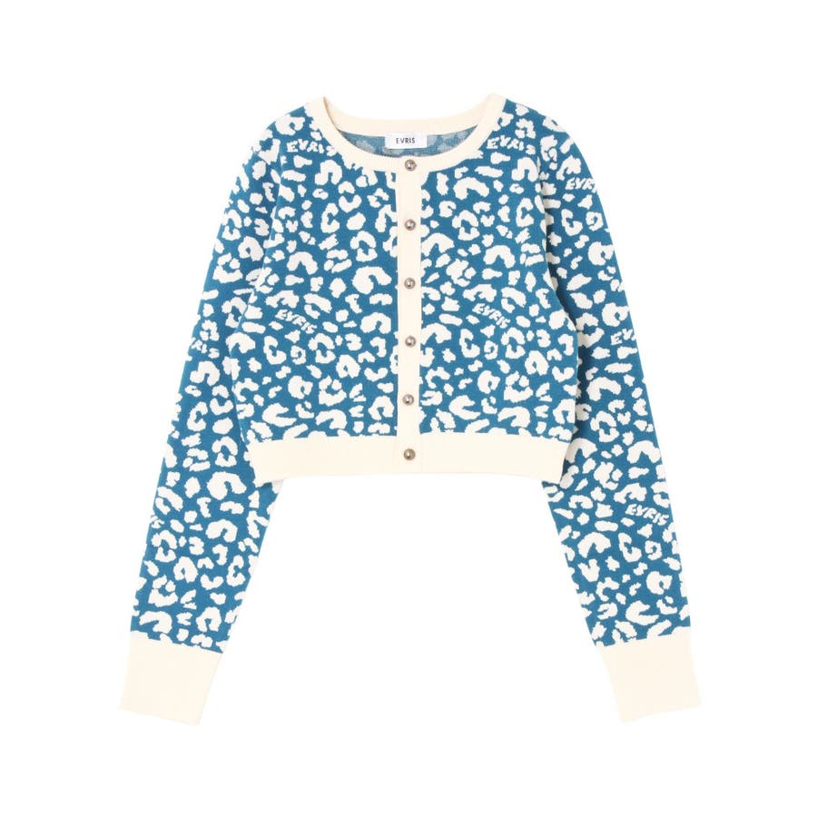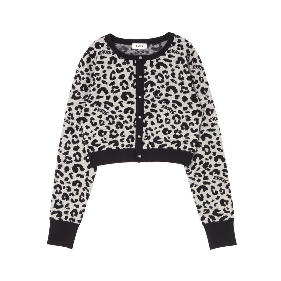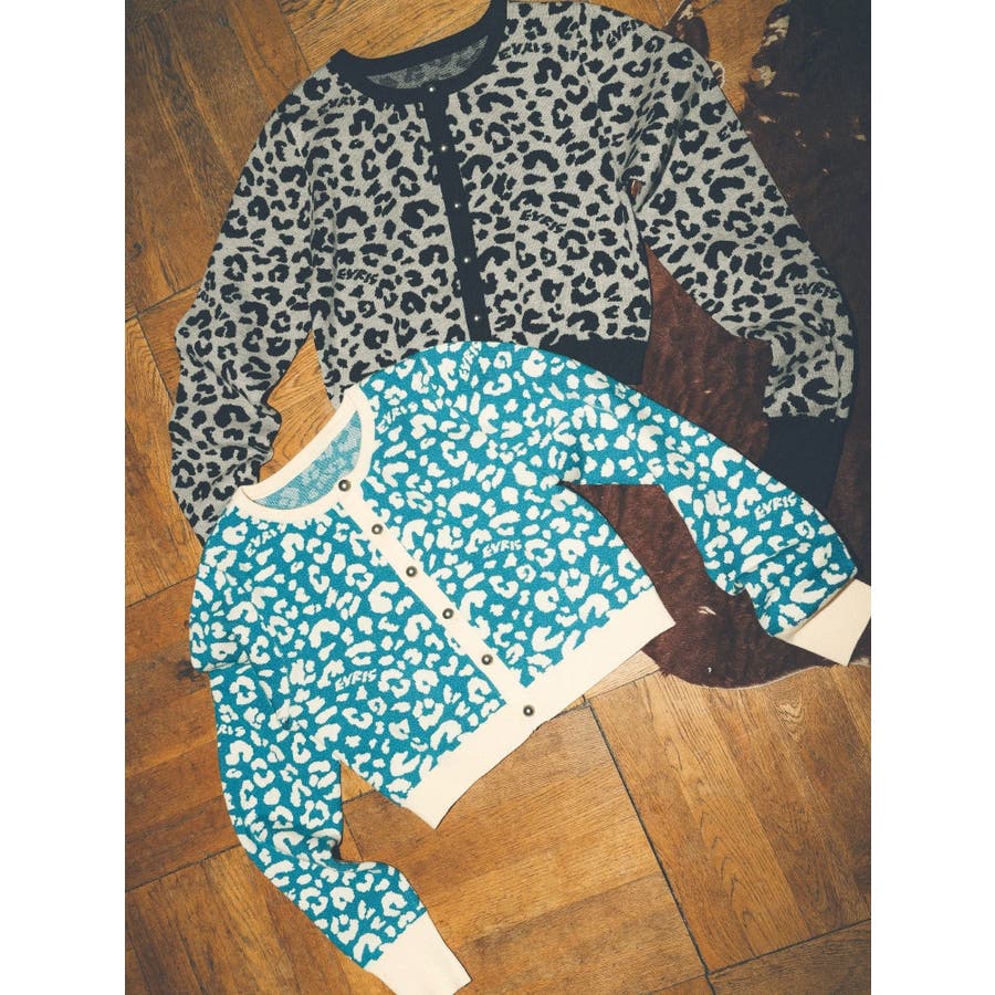 ~EVRISロゴ入りオリジナルレオパード柄~トレンドのレオパード柄にEVRISのロゴを忍ばせたオリジナル柄のニットカーディガンです。ボール状のアンティーク調のボタンを使用しておりこなれ感のある1枚に仕上がっています。コンパクトなサイズ感で華奢見え効果があります。ハイウエストボトムやワイドパンツなどとの相性抜群です。