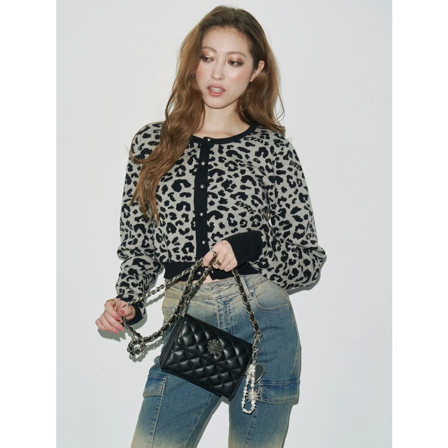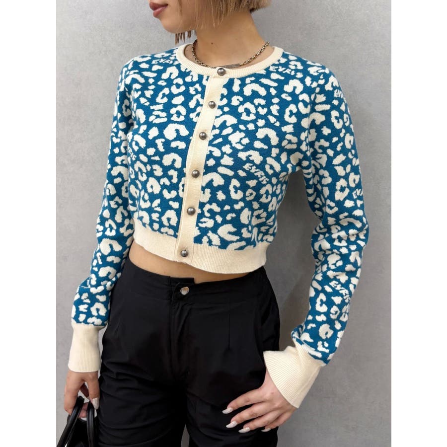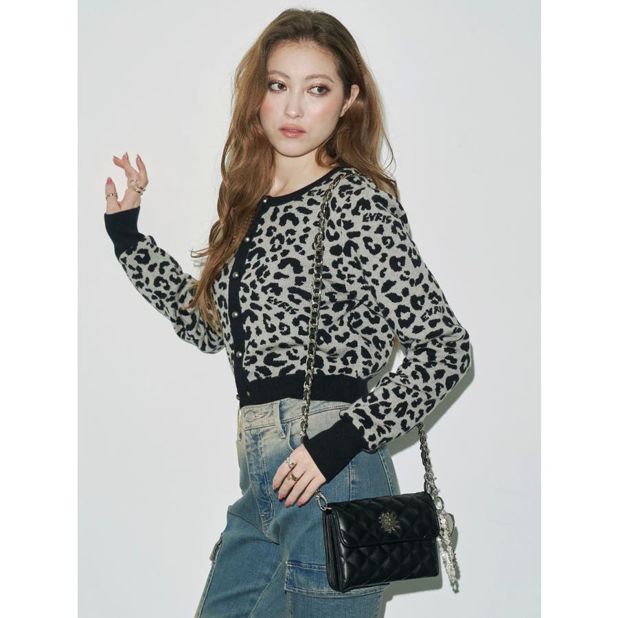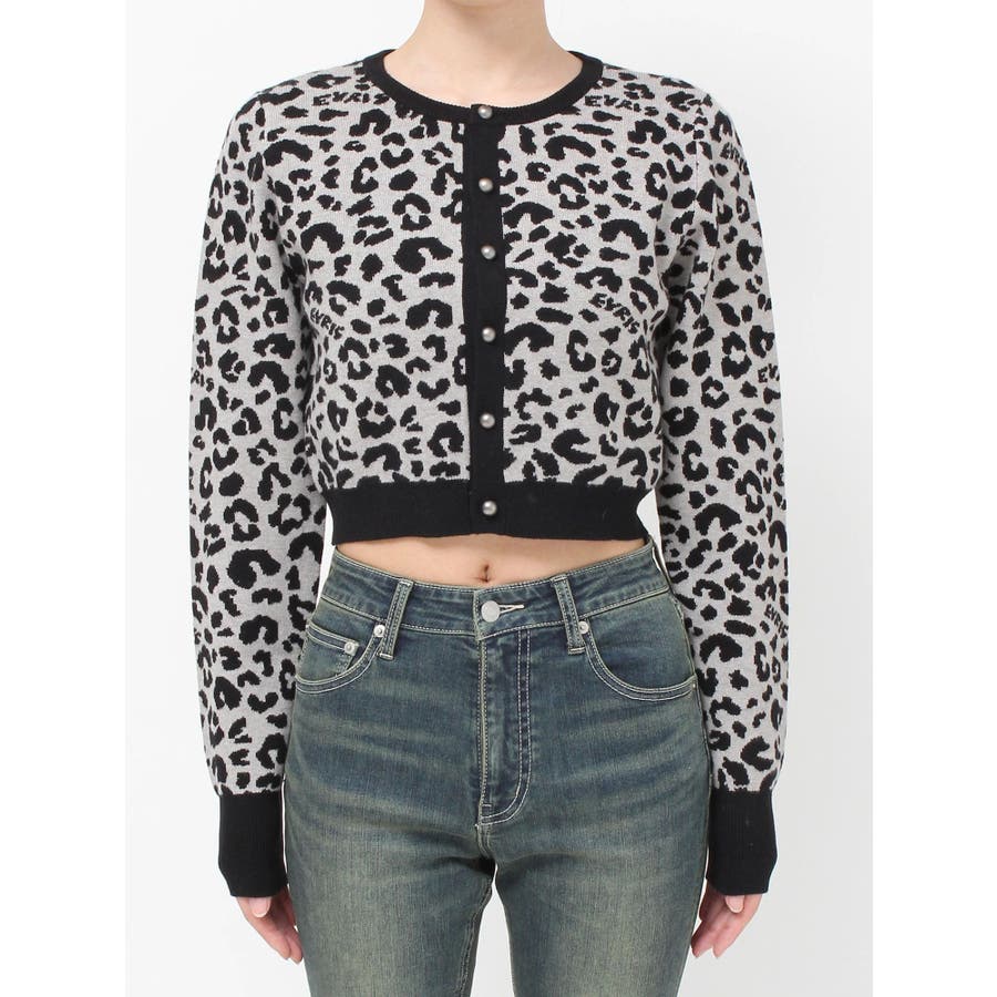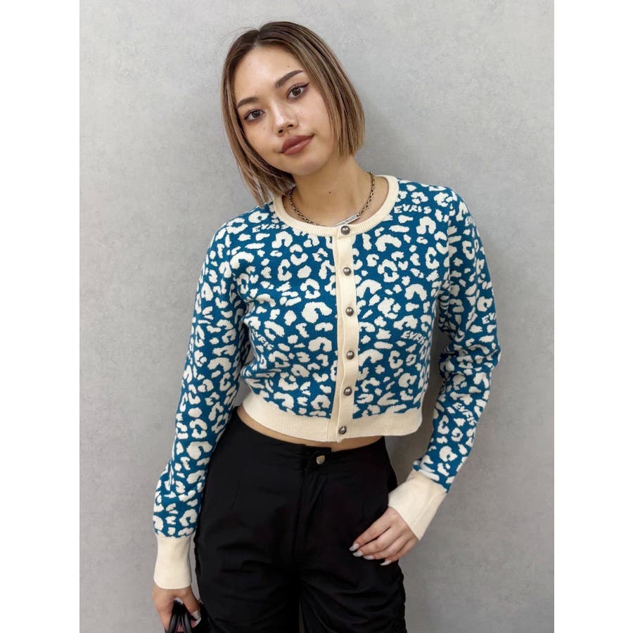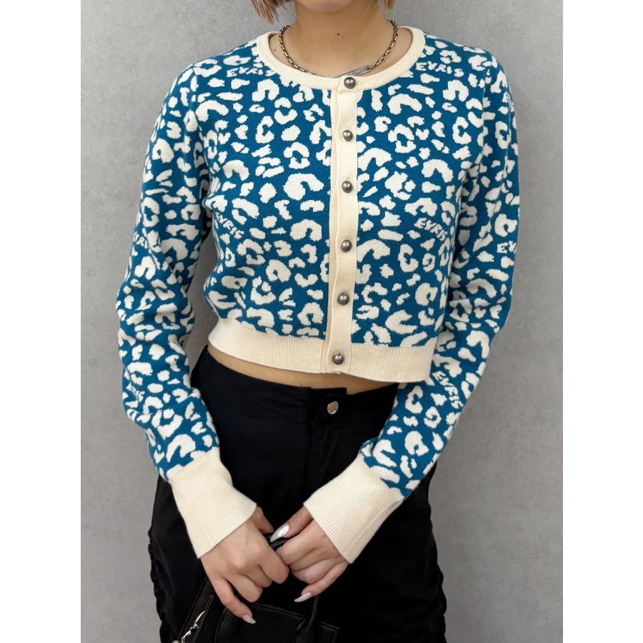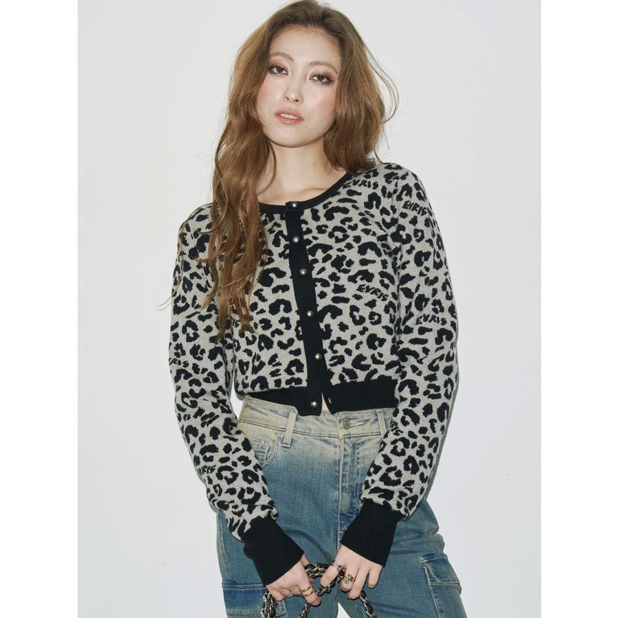 ~EVRISロゴ入りオリジナルレオパード柄~トレンドのレオパード柄にEVRISのロゴを忍ばせたオリジナル柄のニットカーディガンです。ボール状のアンティーク調のボタンを使用しておりこなれ感のある1枚に仕上がっています。コンパクトなサイズ感で華奢見え効果があります。ハイウエストボトムやワイドパンツなどとの相性抜群です。