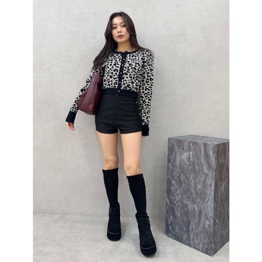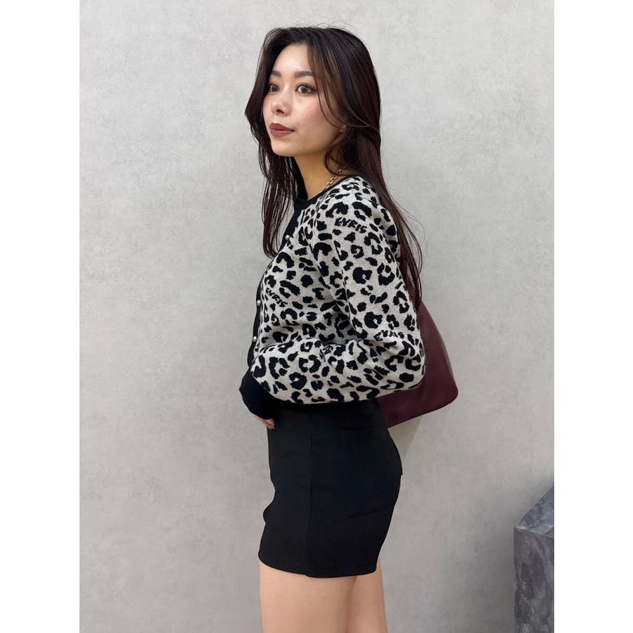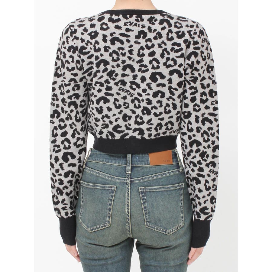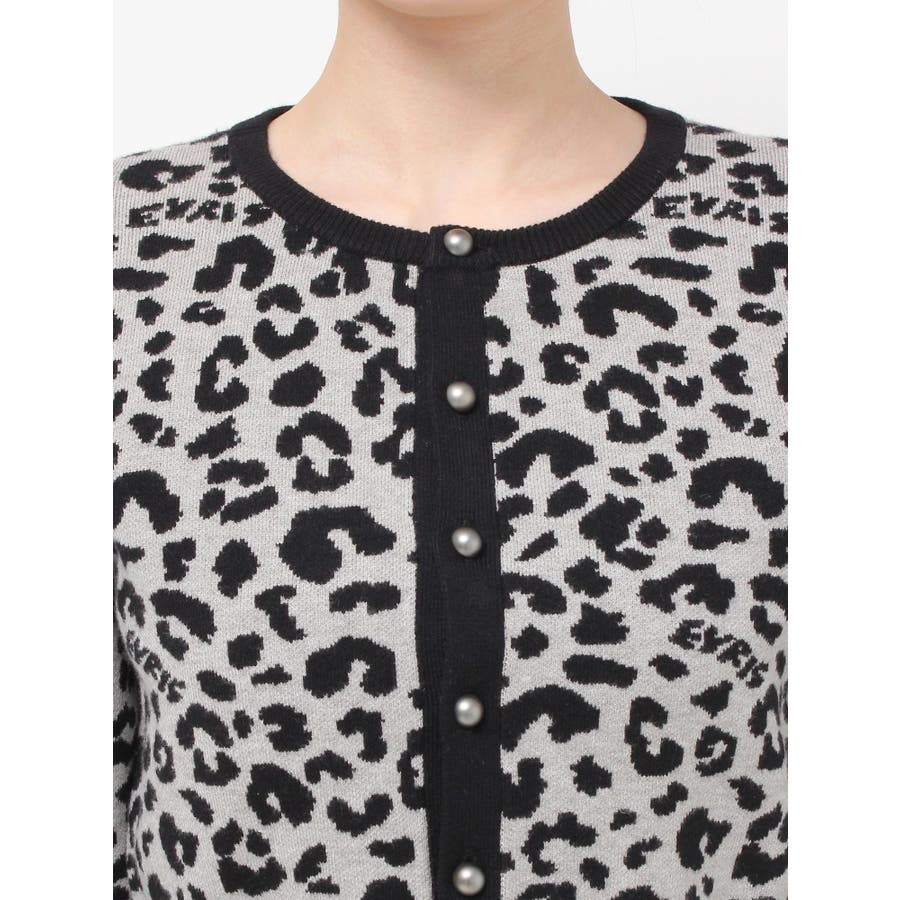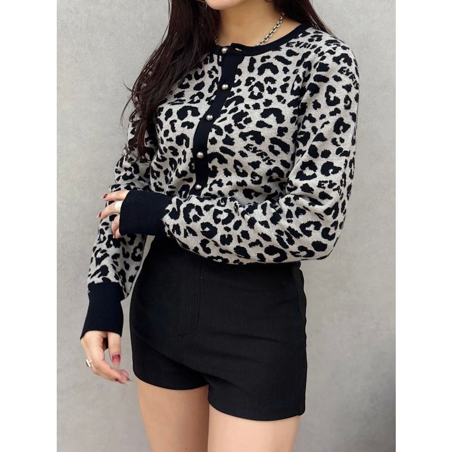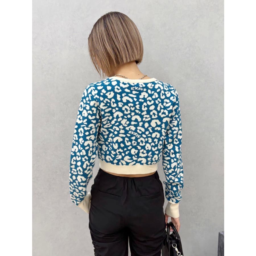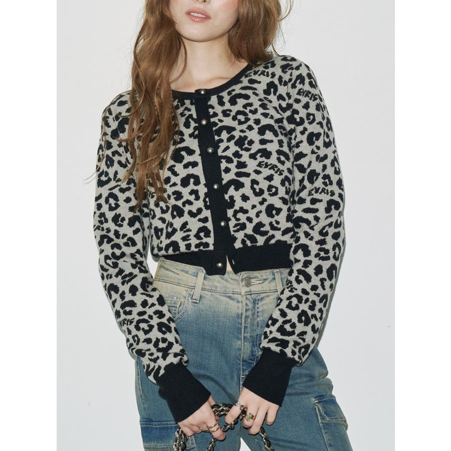 ~EVRISロゴ入りオリジナルレオパード柄~トレンドのレオパード柄にEVRISのロゴを忍ばせたオリジナル柄のニットカーディガンです。ボール状のアンティーク調のボタンを使用しておりこなれ感のある1枚に仕上がっています。コンパクトなサイズ感で華奢見え効果があります。ハイウエストボトムやワイドパンツなどとの相性抜群です。