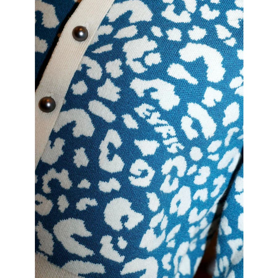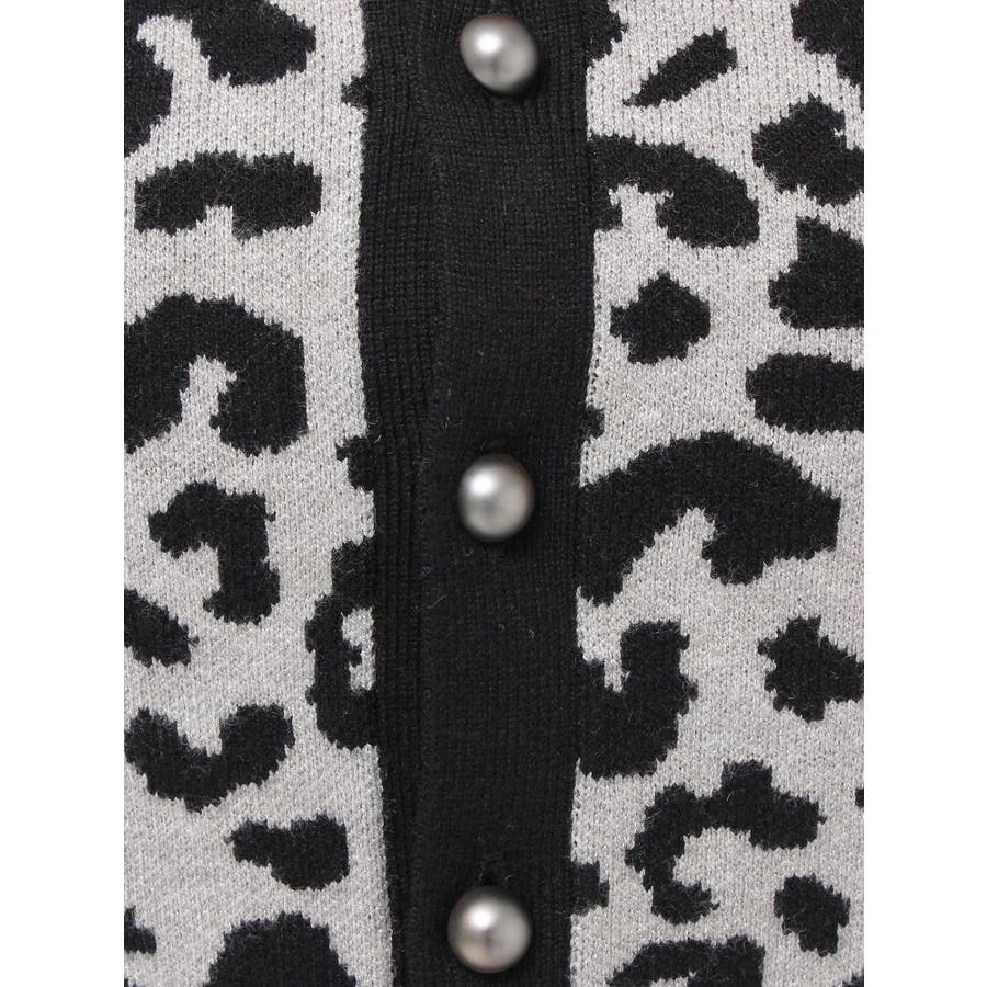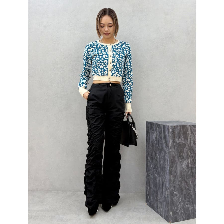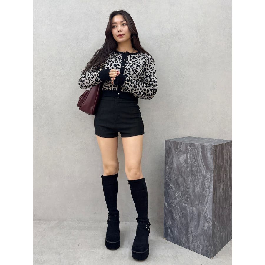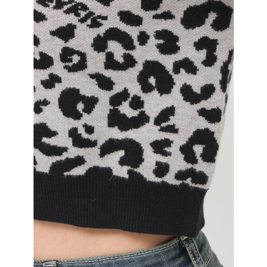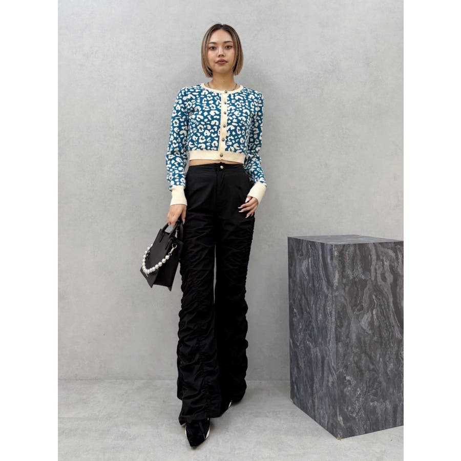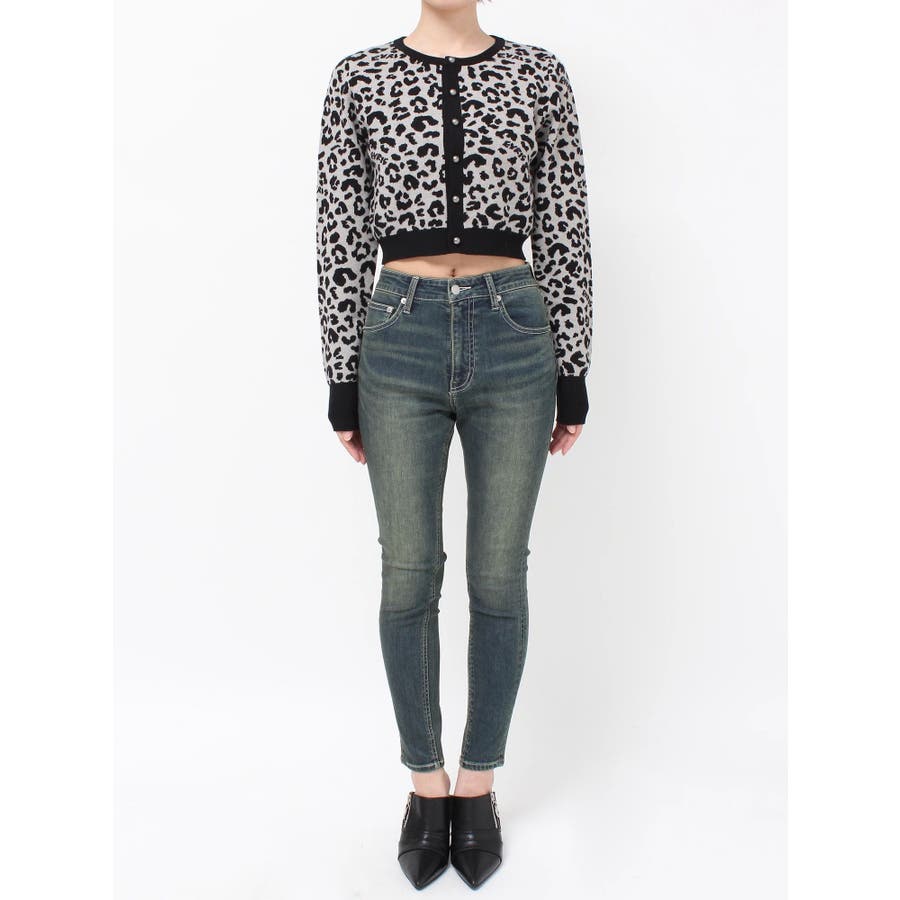 ~EVRISロゴ入りオリジナルレオパード柄~トレンドのレオパード柄にEVRISのロゴを忍ばせたオリジナル柄のニットカーディガンです。ボール状のアンティーク調のボタンを使用しておりこなれ感のある1枚に仕上がっています。コンパクトなサイズ感で華奢見え効果があります。ハイウエストボトムやワイドパンツなどとの相性抜群です。
